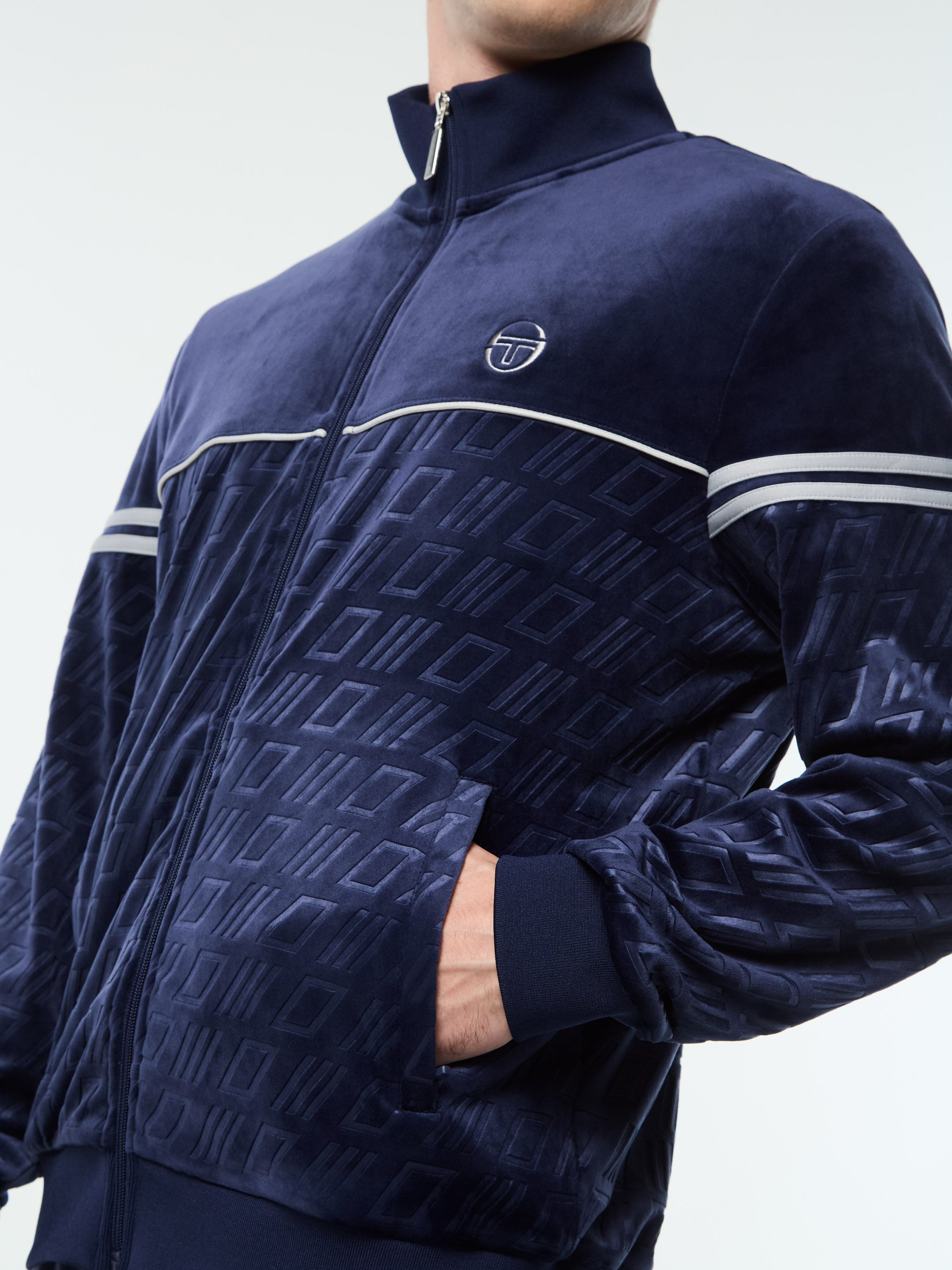 Luxe texture, standout detail. The Bandiera Track Jacket is crafted from ultra-soft stretch velour with a debossed motif at the lower panels for a subtle hit of dimension. Finished with double-stripe taping at the sleeves, contrast piping across the chest, and an embroidered monogram logo, this elevated layer fuses retro athletic heritage with modern polish.