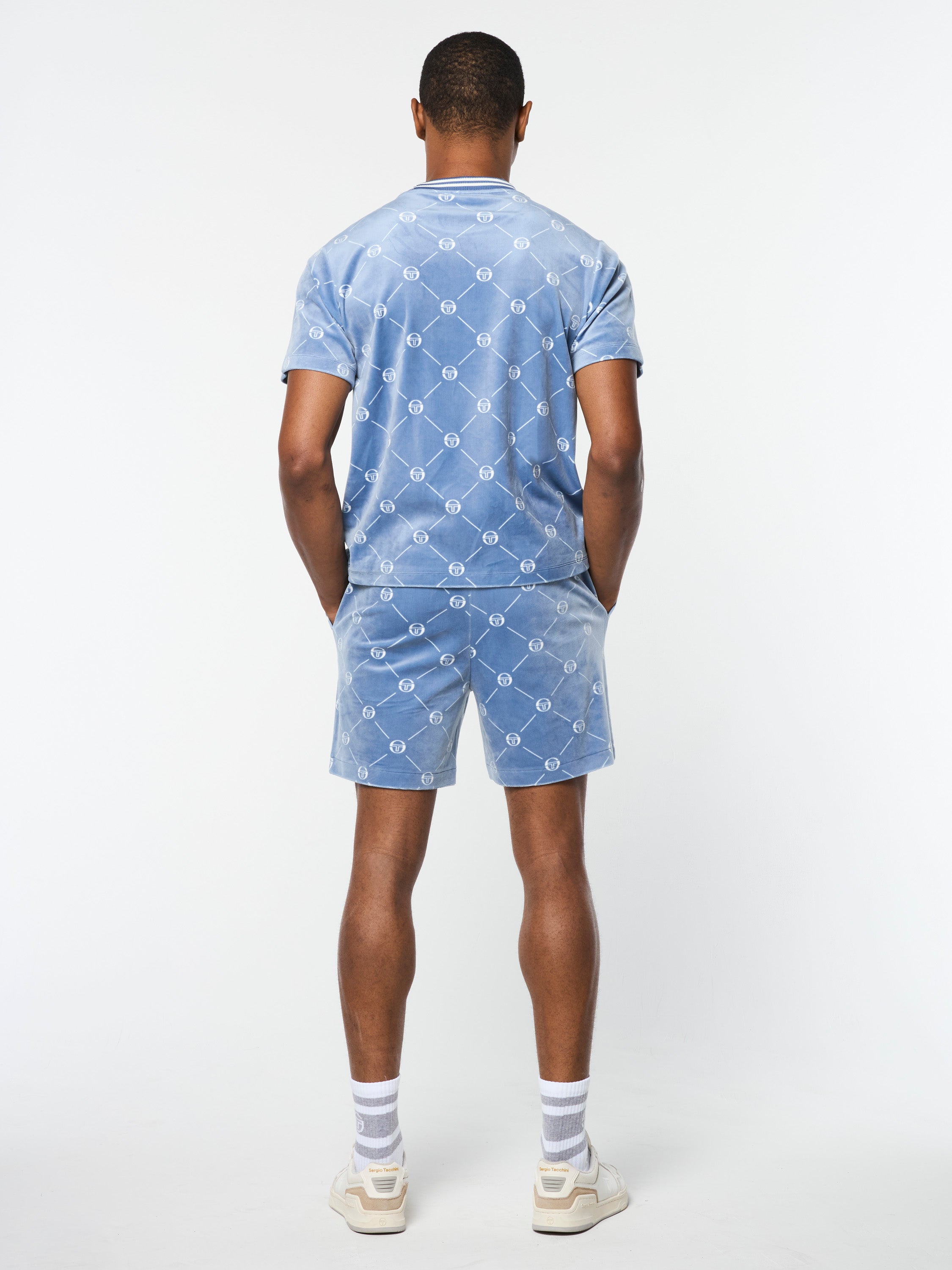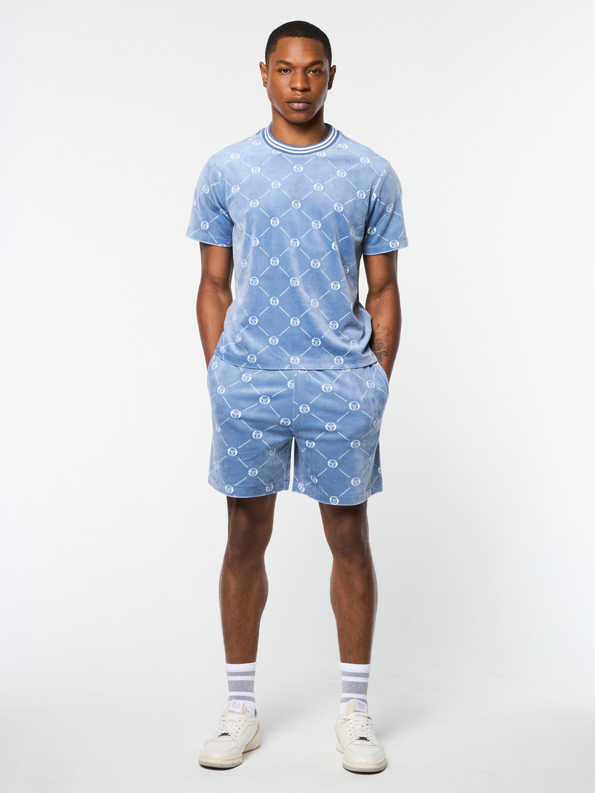 Crafted from luxurious printed velour, our Cosimo T-Shirt features an all-over 'ST' monogram motif and double stripe tipping accents for an elevated look. Exuding sophistication and comfort, this premium tee transitions seamlessly from everyday outings to nightlife vibes.Pair with the Cosimo Velour Short for the full fit. (Sold separately)
