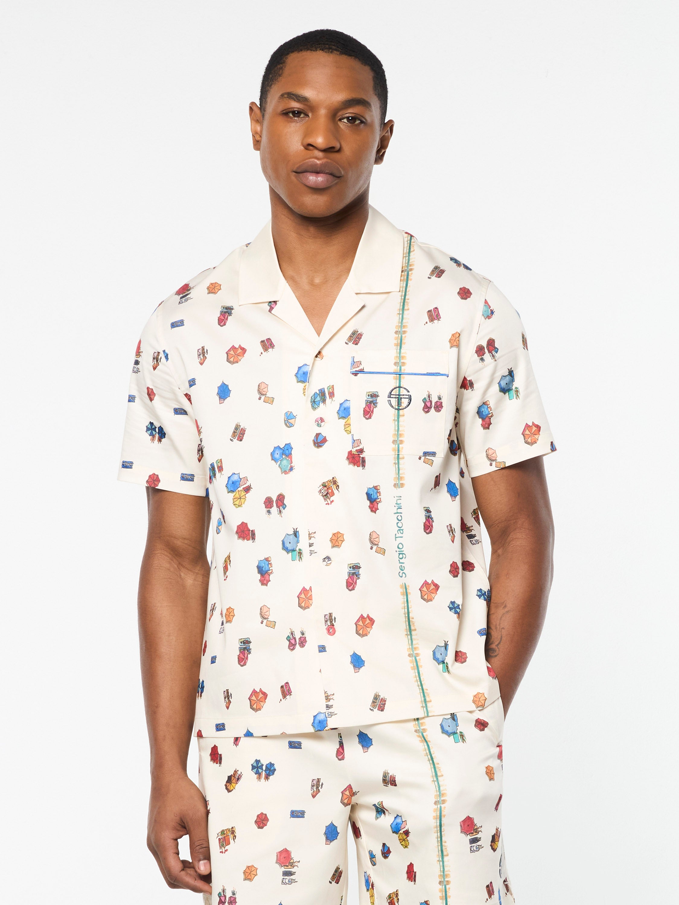 The Tosca Cabana Shirt is crafted from a luxurious Tencel-blend stretch fabric with a satin-like finish that's exceptionally soft and smooth to the touch. Perfect for warmer weather, this leisure resort button-up features an all-over Mediterranean beach scene, casual camp collar, and a water droplet silicone 'ST' monogram at the chest pocket for a seaside vibe.Pair with the Tosca Cabana Short for the full fit. (Sold separately)