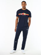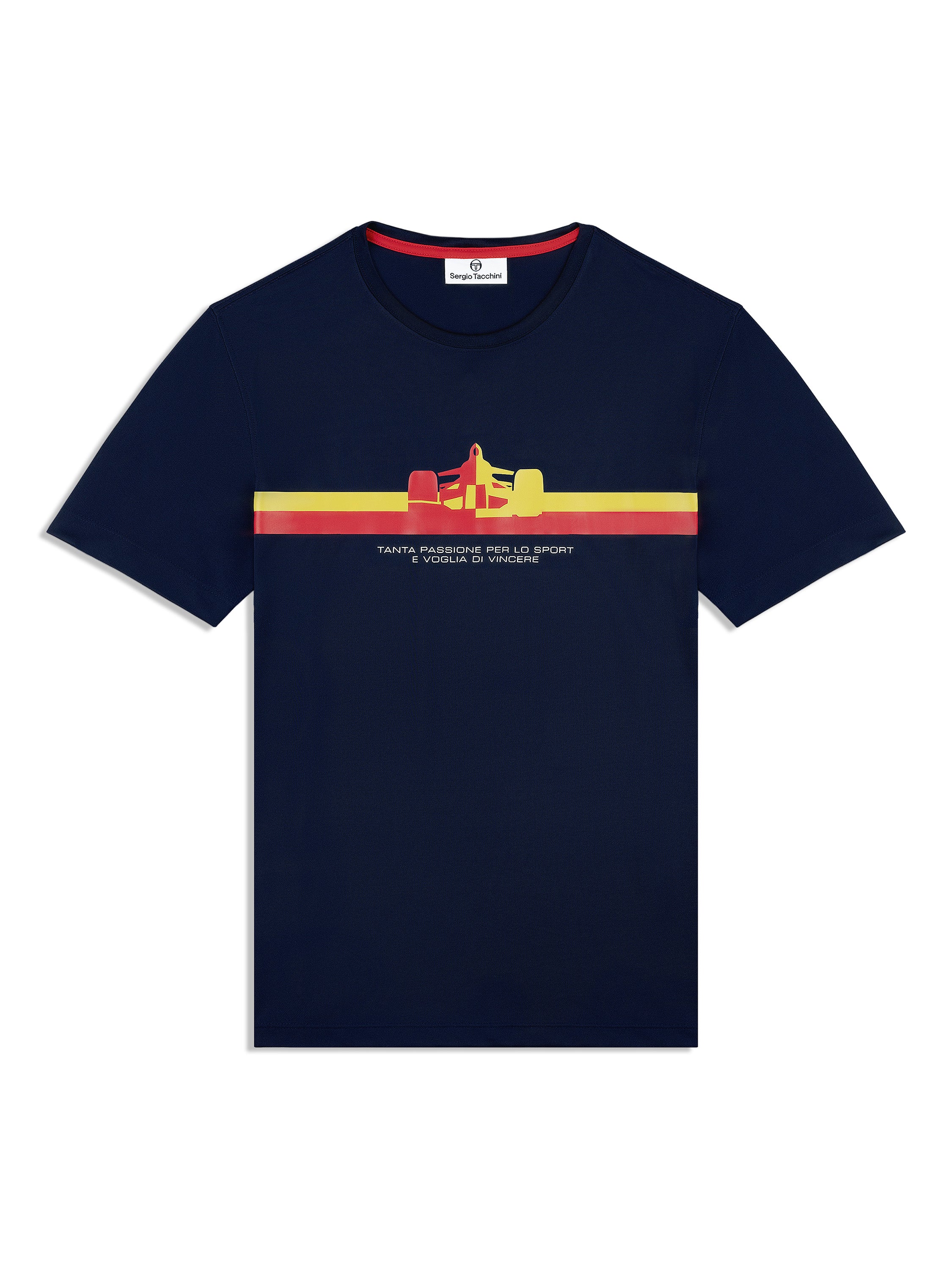 The Macchina T-Shirt is crafted from breathable stretch piqué fabric to keep you cool and moving freely throughout your day. Featuring custom Sergio Tacchini racing artwork, an Italian sports slogan, and stripe accents, this premium tee is perfect for both athletic pursuits and casual wear.