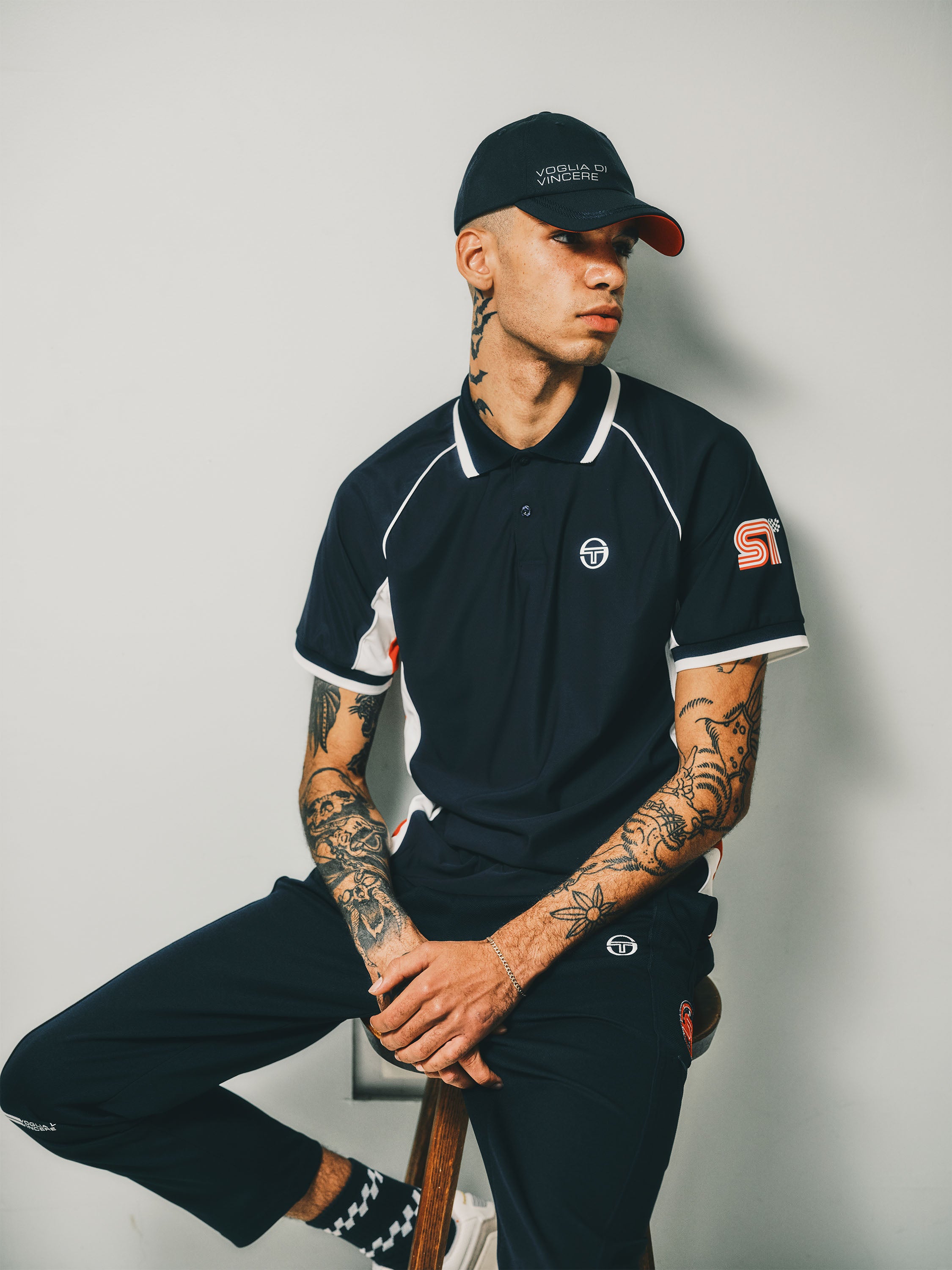 - Embroidered Sergio Tacchini script logo at back arch