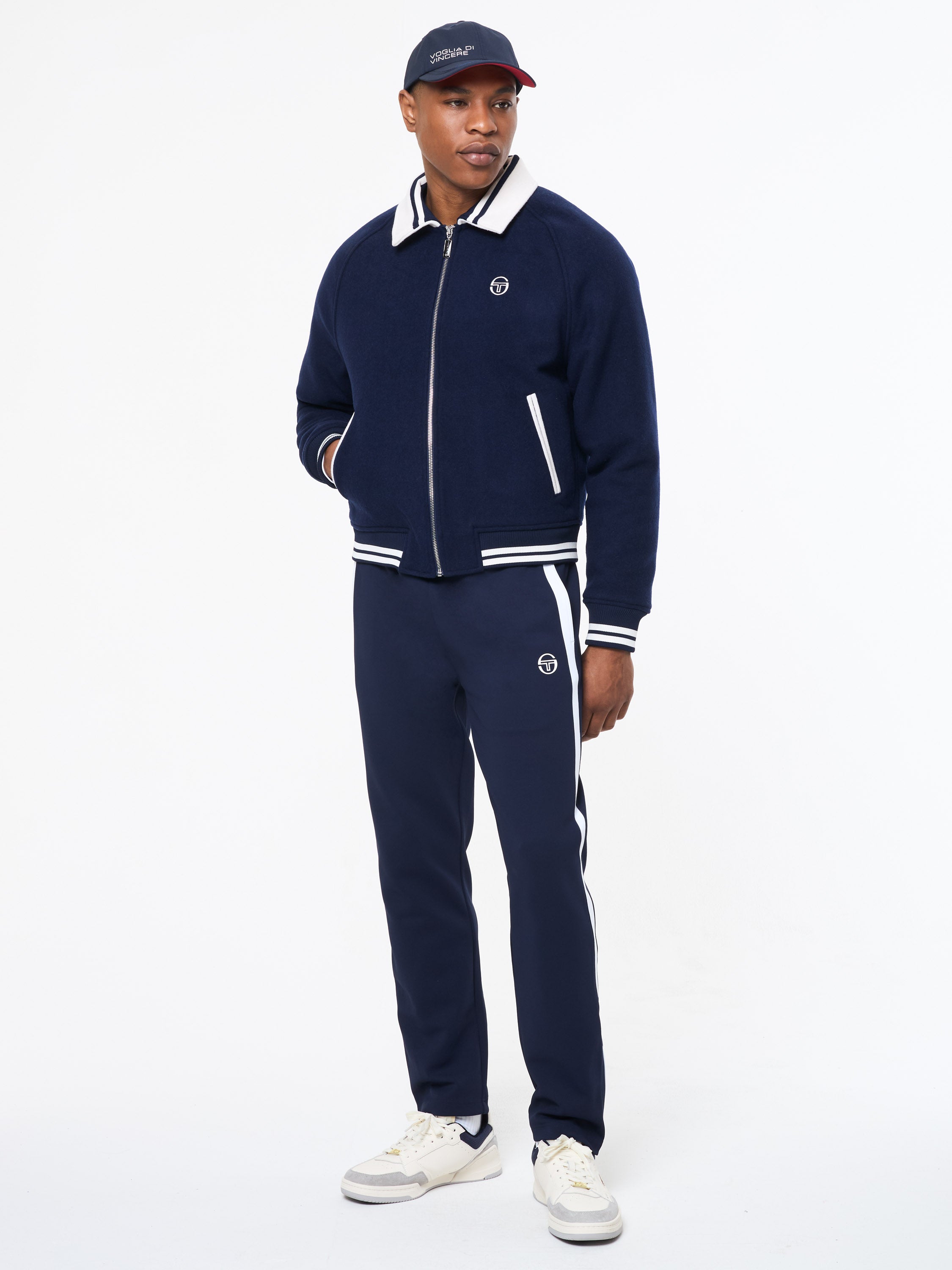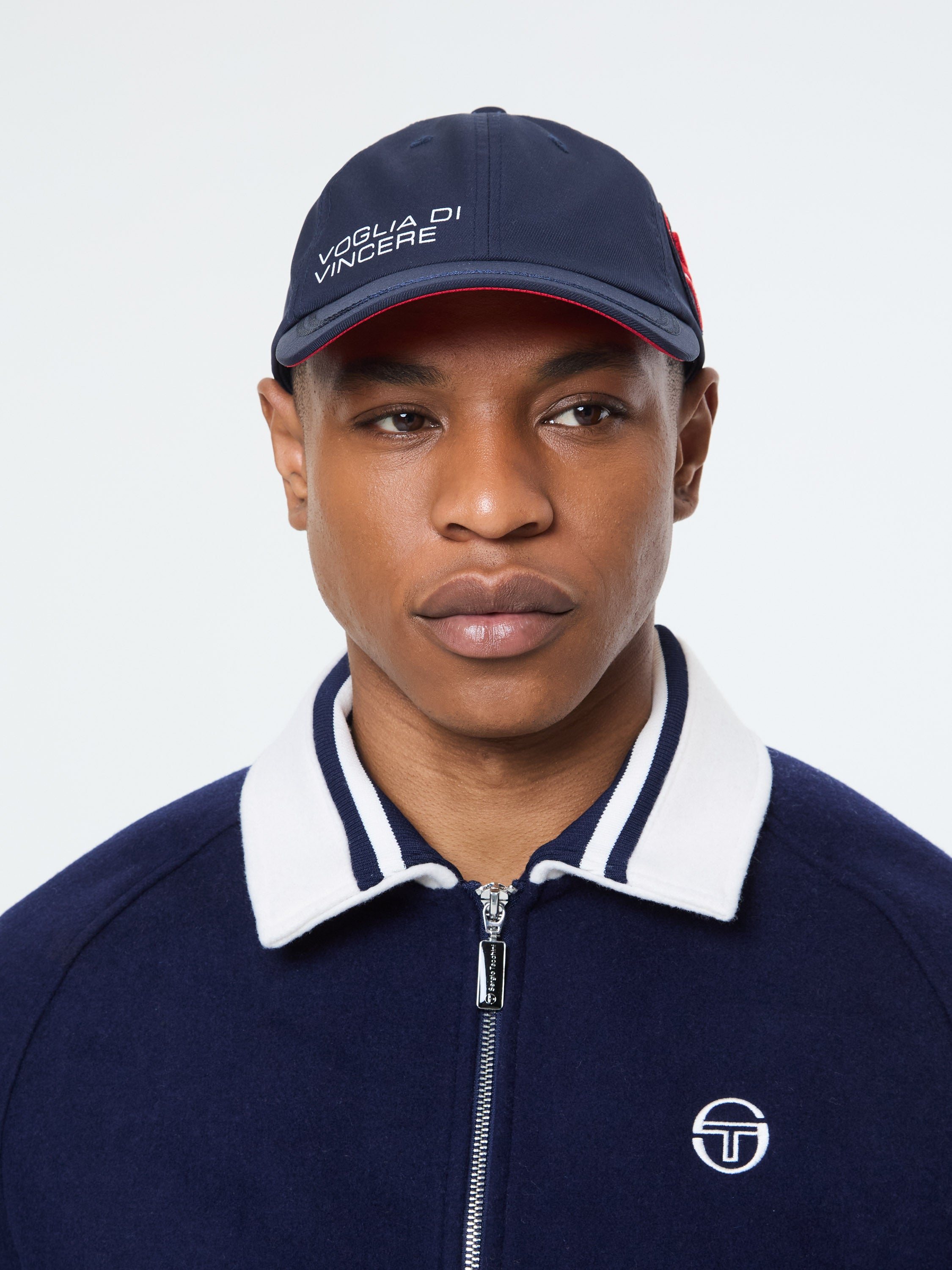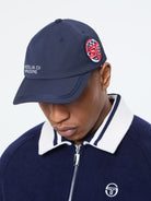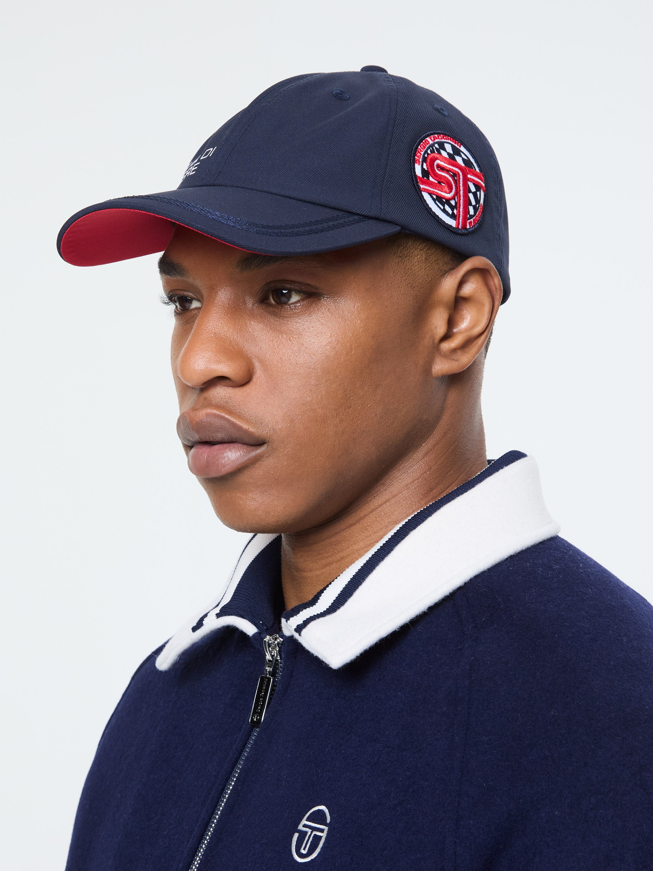 - Embroidered Sergio Tacchini racing patch at left crown