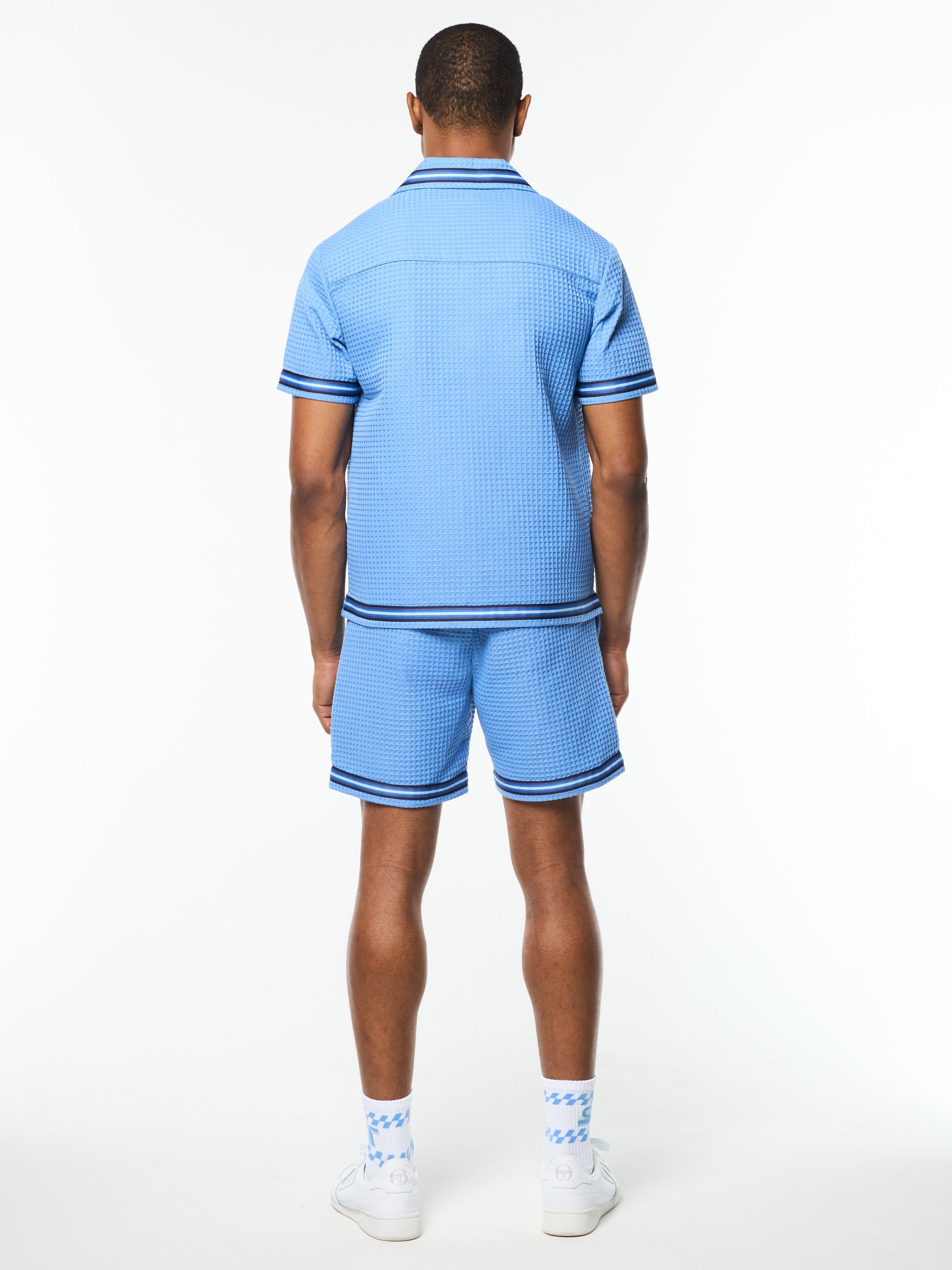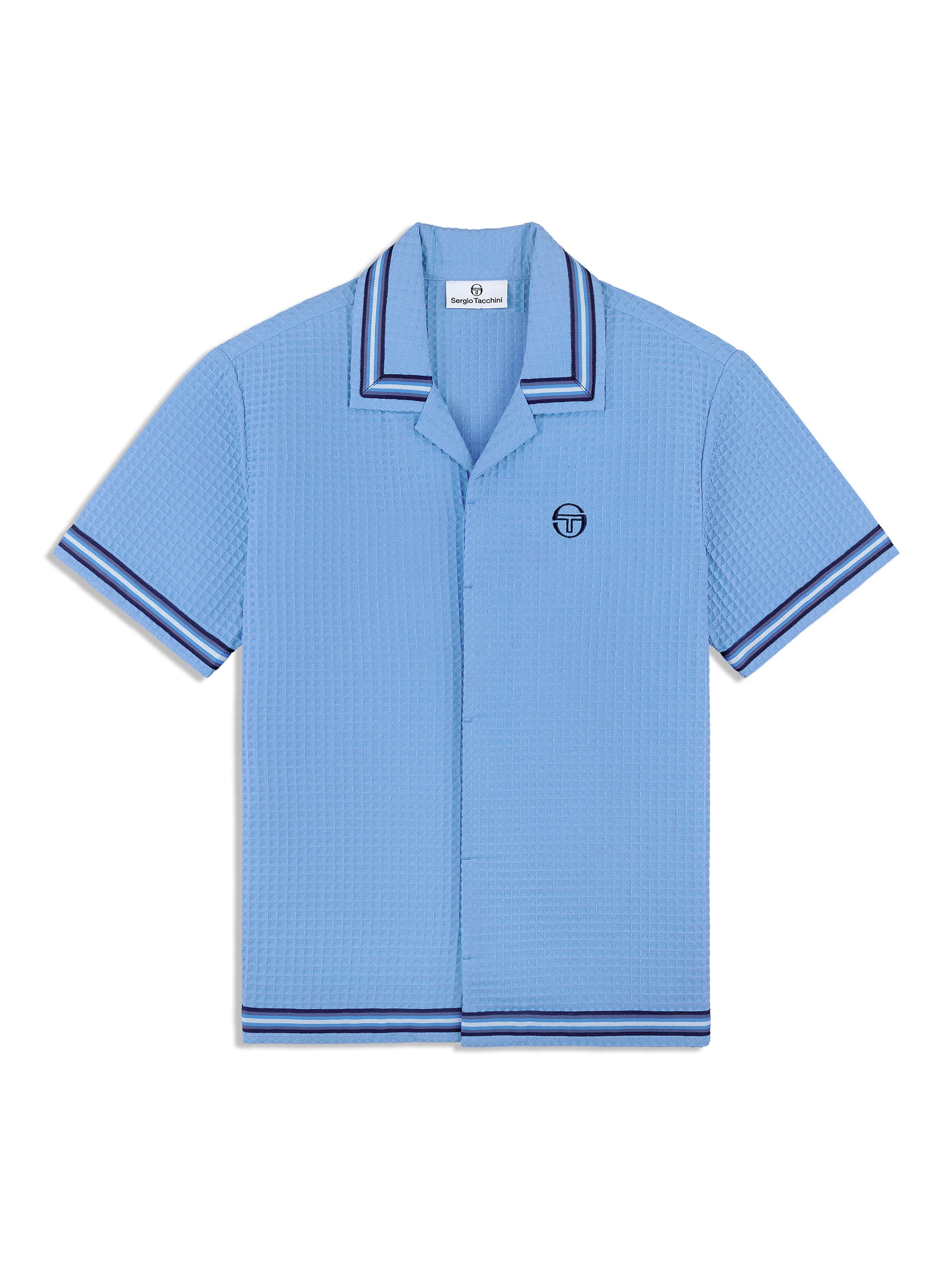 Effortless polish with a textured twist. The Chiaro Cabana Shirt brings breezy structure to transitional layering, crafted from soft waffle-knit for all-day comfort. Stripe taping at the trims and a concealed button placket add a tailored finish—whether you're poolside, on vacation, or leveling up your weekend rotation.