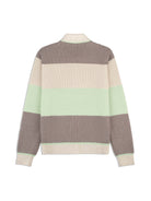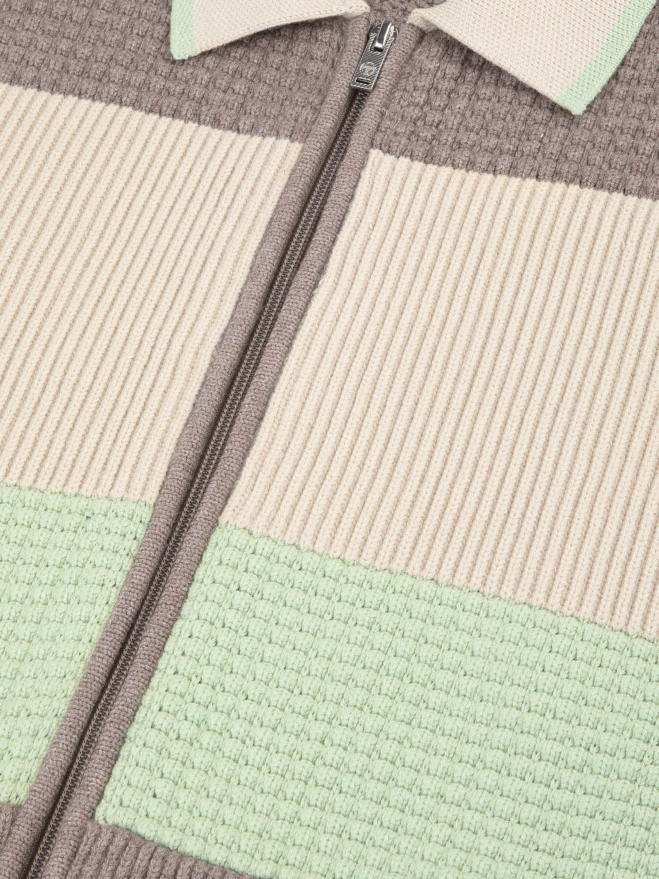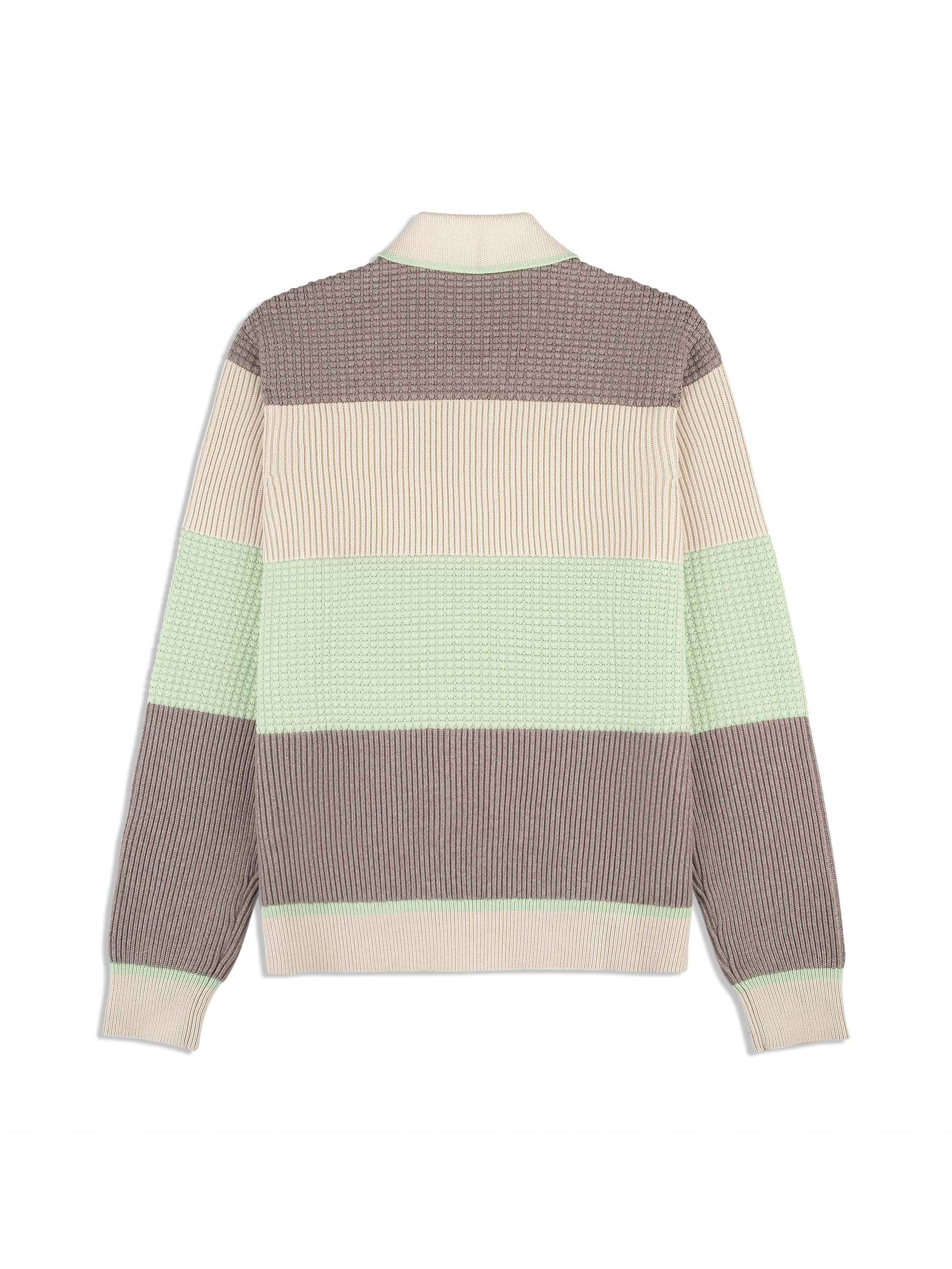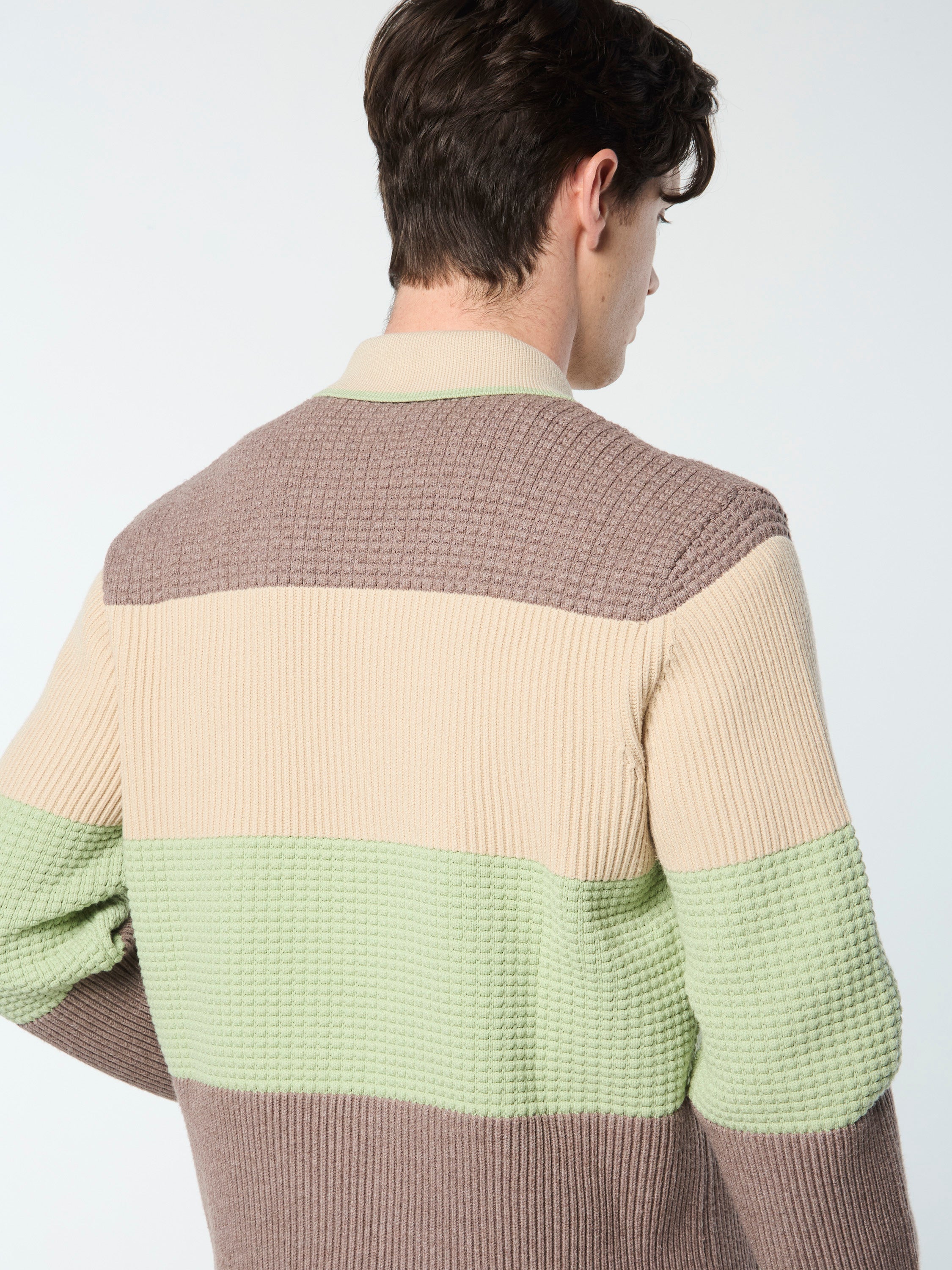 - Color-blocked body with mixed cardigan & waffle stitch panels