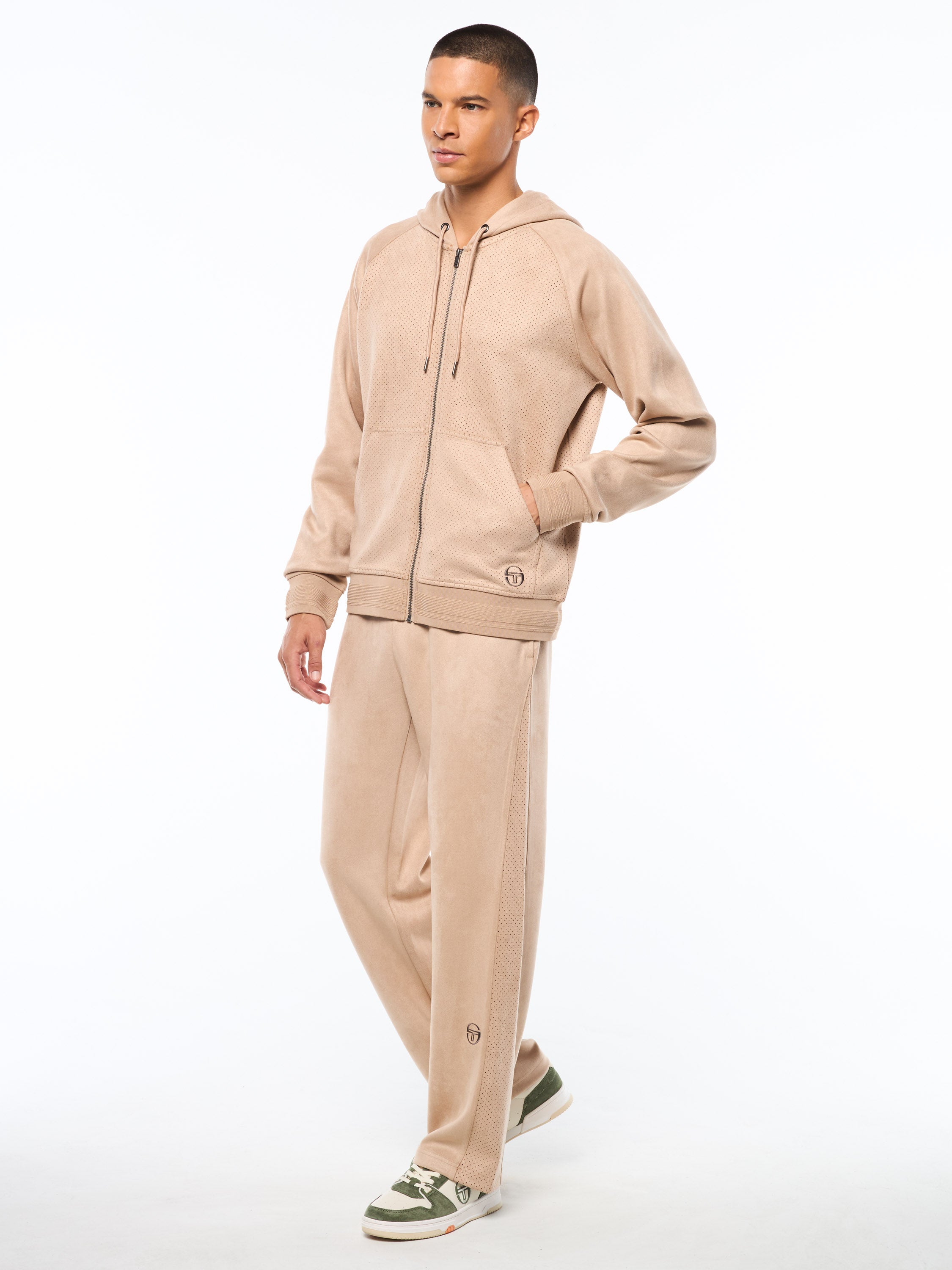 An elevated take on a wardrobe staple, the Camoscio Hoodie is crafted from premium faux suede fabric for an ultra-soft feel and refined texture. Blending comfort with considered design, this Hoodie features a spacious double-layer hood, a kangaroo pocket for casual utility, with perforated double knit faux suede design and rib-knit accents. Perfect for layering, the Camoscio Hoodie delivers everyday ease with a luxe finish.