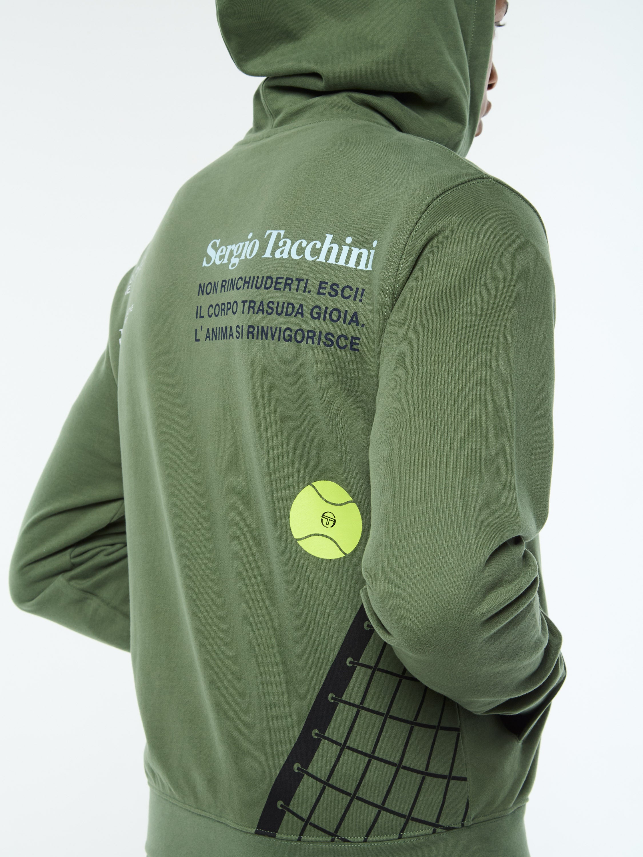The Netto Hoodie is crafted from super-soft, heavyweight French terry cotton for maximum comfort with an elevated vibe. Featuring custom Sergio Tacchini tennis artwork and Italian sports slogans printed at the back, this premium full-zip hoodie is finished with spacious handwarmer pockets and an embroidered 'ST' monogram at the chest.