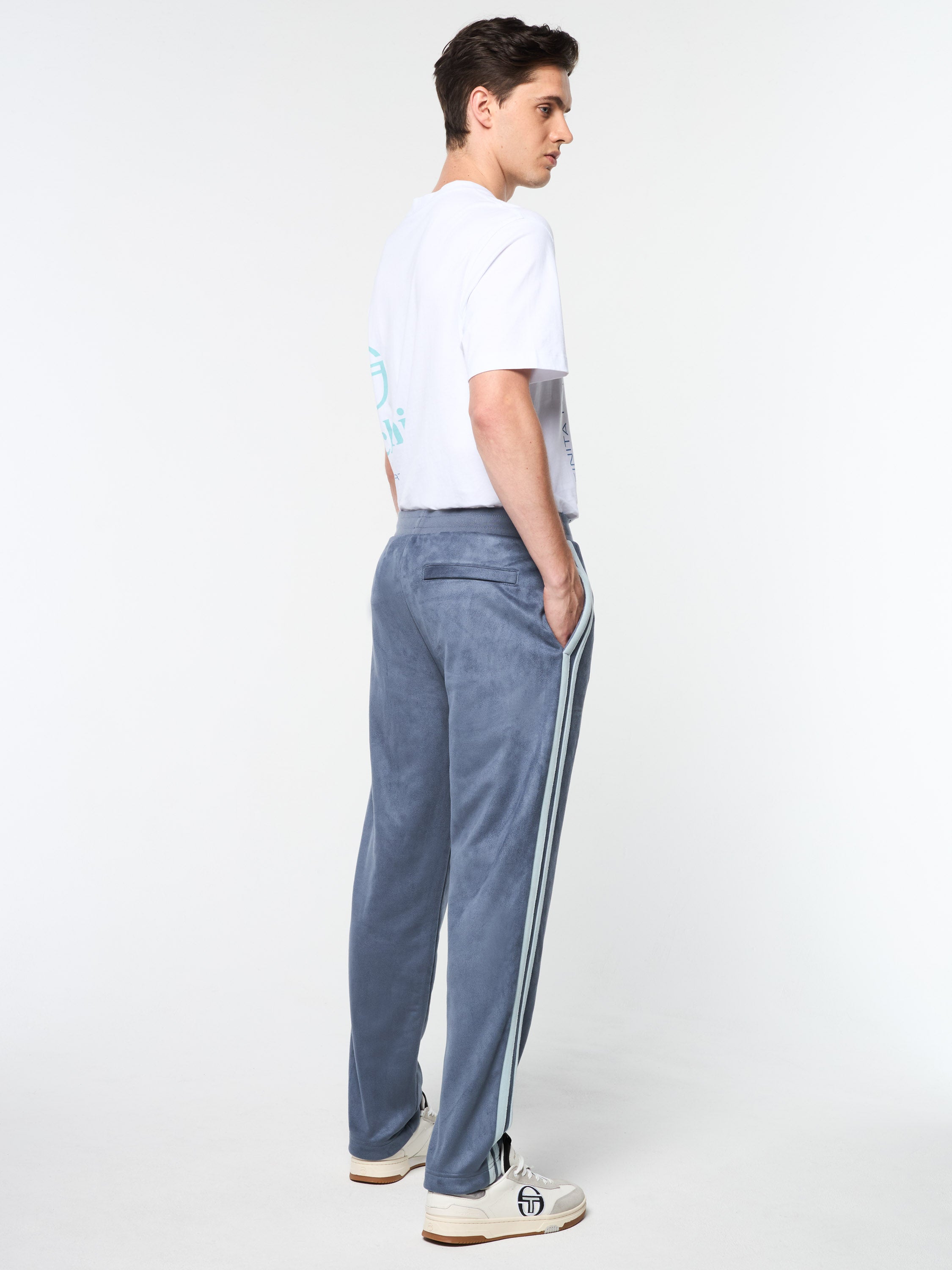 A fresh twist on a long-time Tacchini classic, this season's Damarindo Track Pant is made of premium faux suede with a soft fleece backing and features our distinctive double-stripe down the legs. Topped with a comfortable rib-knit waistband, these elevated track pants are complete with spacious pockets and our iconic 'ST' monogram logo embroidered at the left thigh.Pair with the Damarindo Track Jacket for the full fit. (Sold separately)