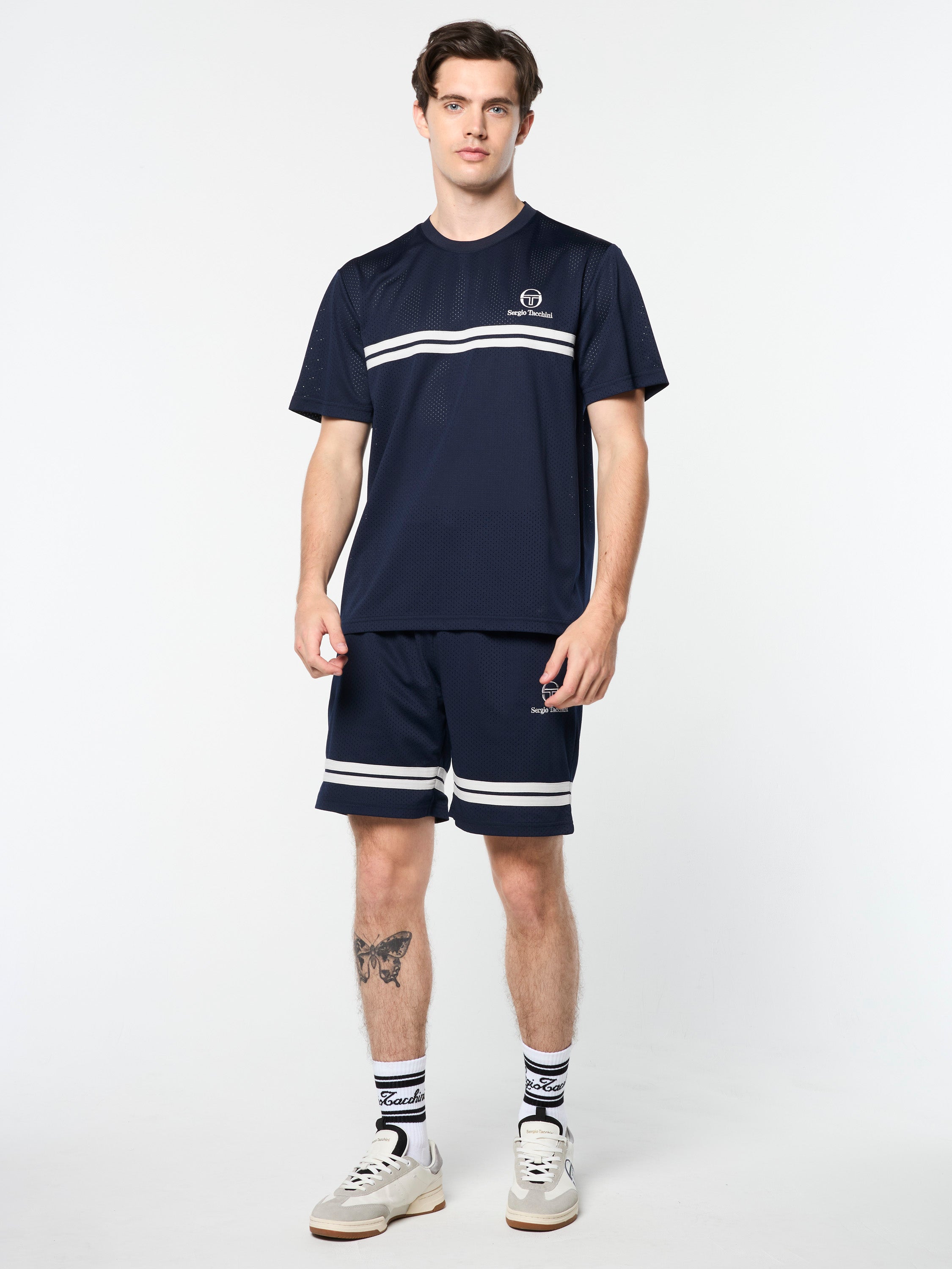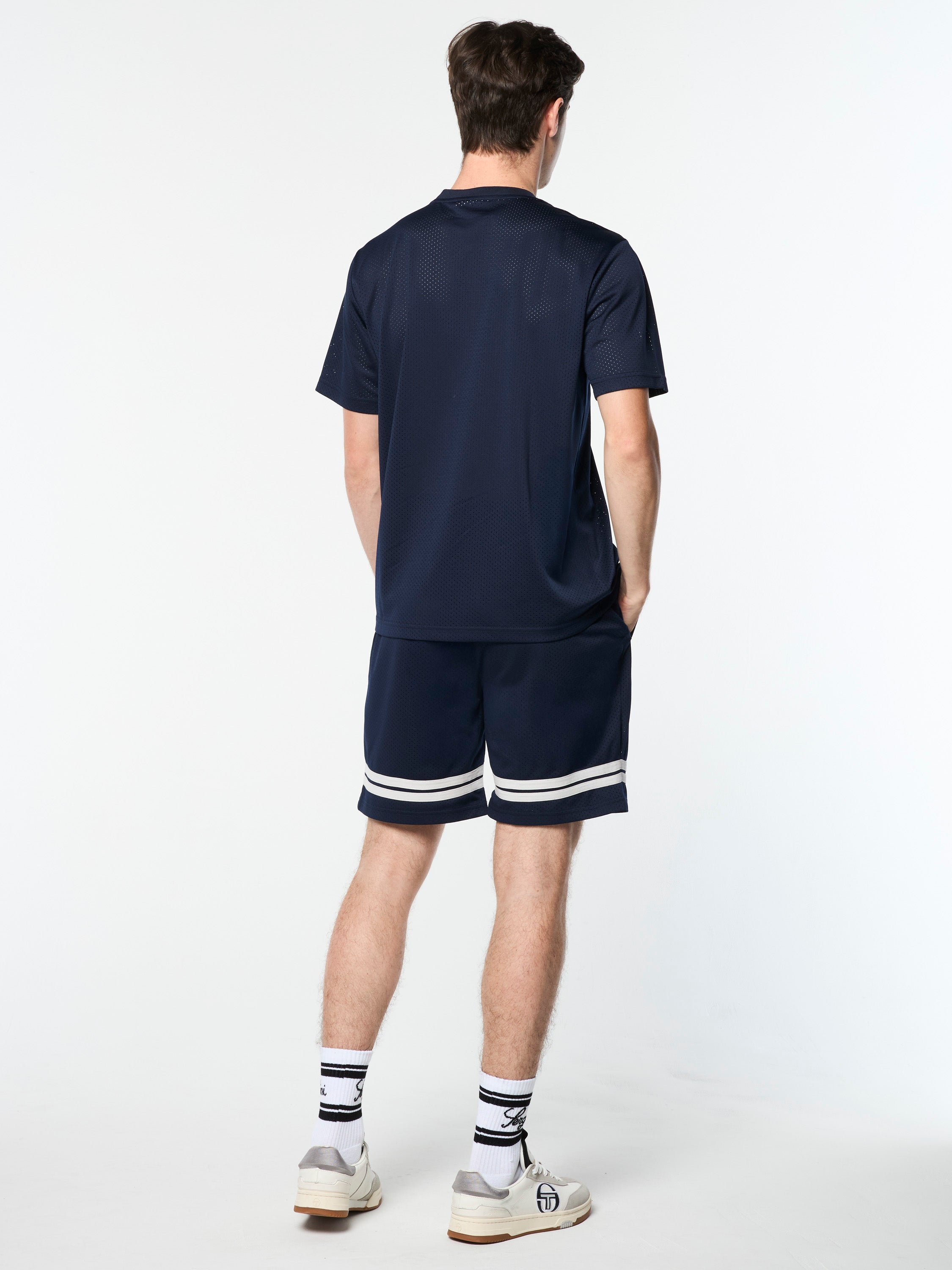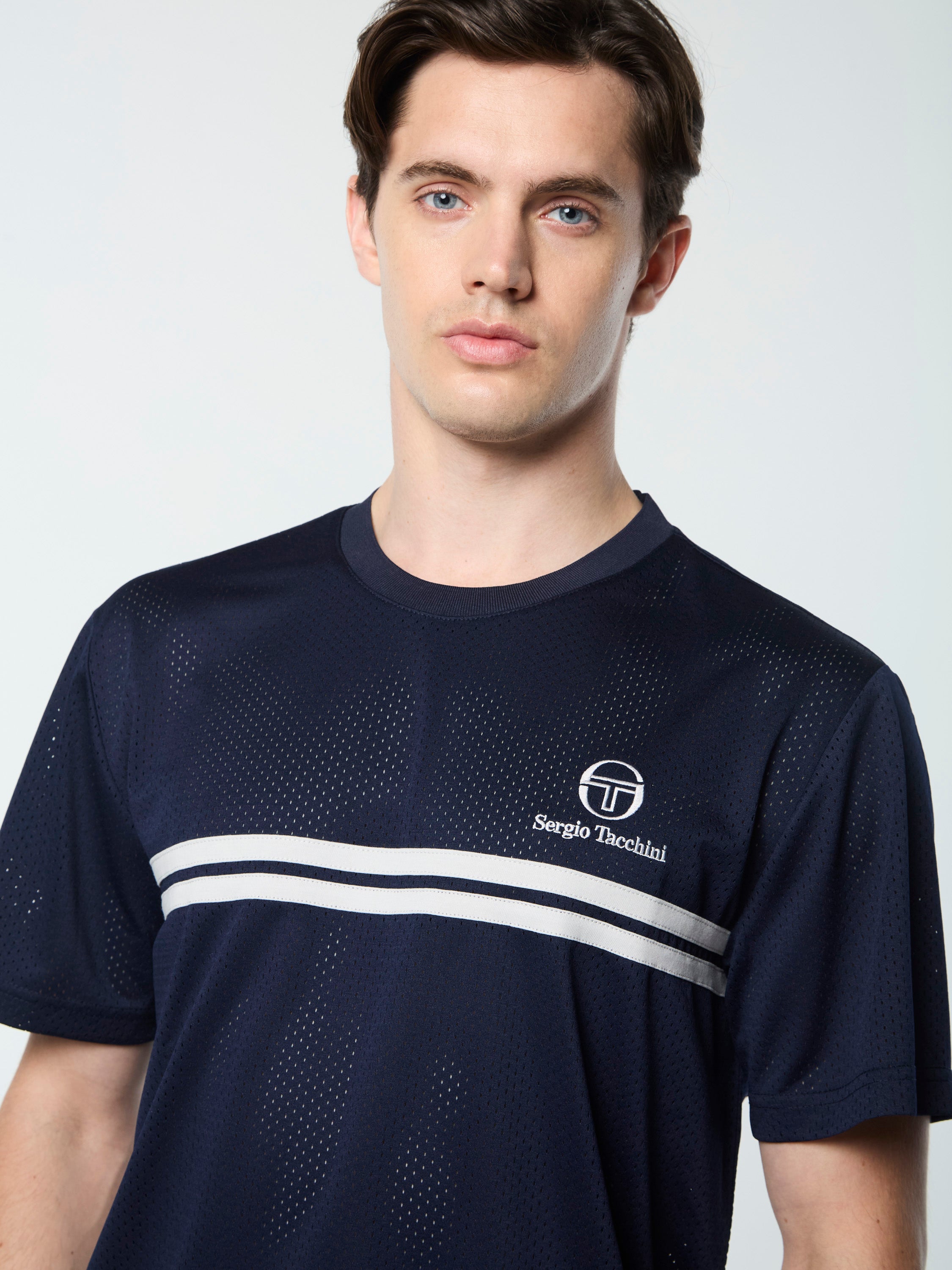 A performance spin on classic sportswear. Crafted from breathable mesh fabric to keep you cool when practice heats up, the Giacomo T-Shirt features our distinctive double stripe taping across the chest and is topped with a soft rib-knit collar.Pair with the Ludovic Mesh Short for the full fit. (Sold separately)