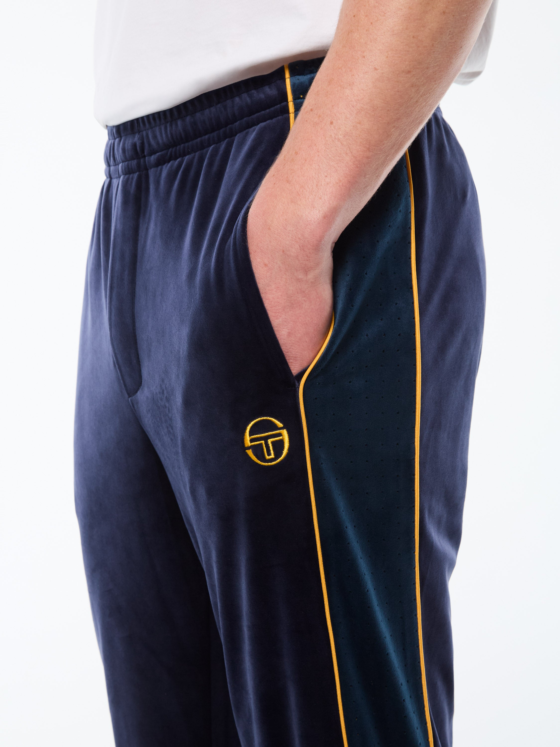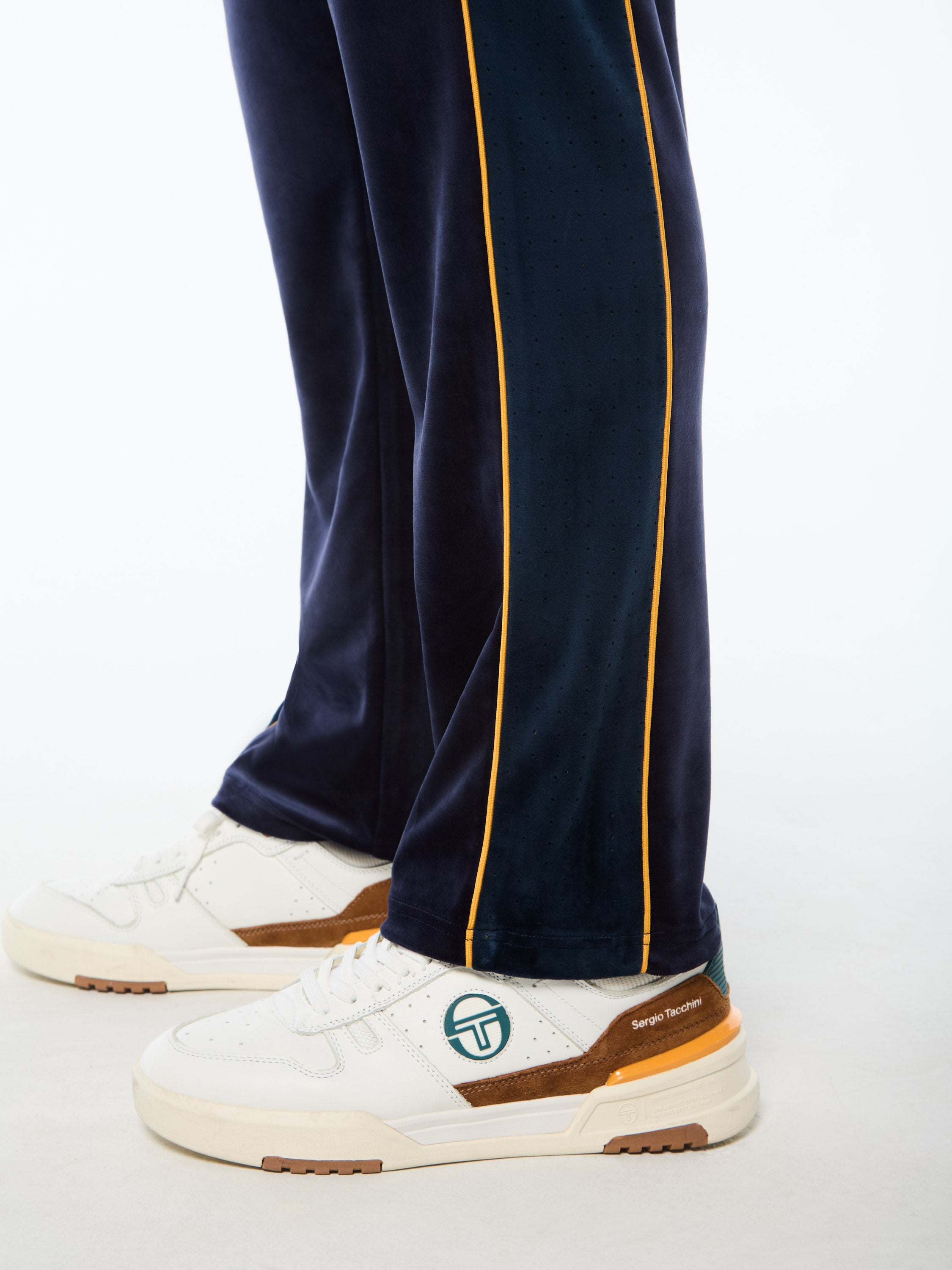 A premium update to the iconic track pant, the Forato Velour Track Pant updates Sergio Tacchini classic with a luxurious velour fabrication and perforated combo detailing for a fresh, modern edge.
