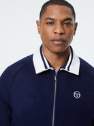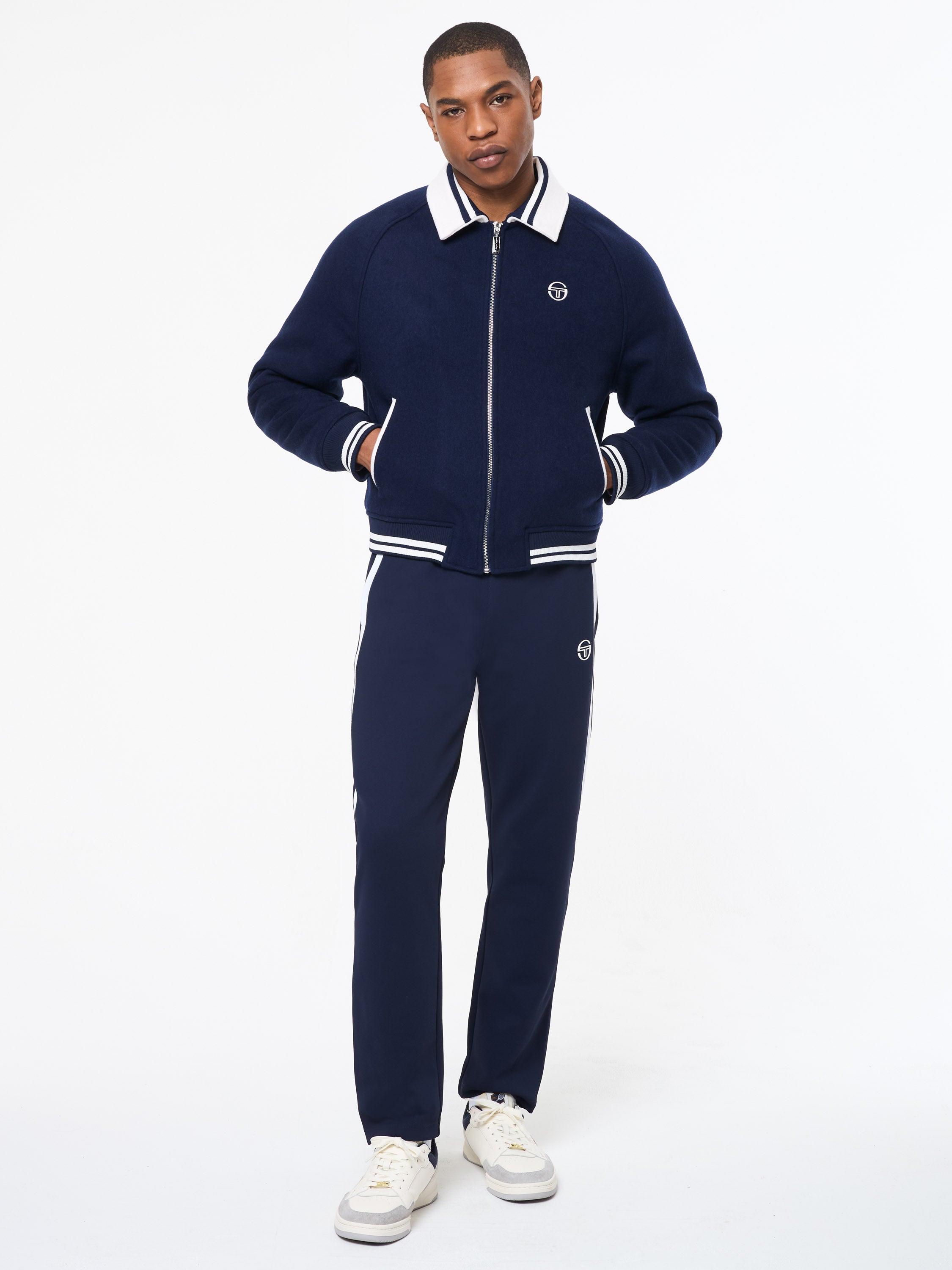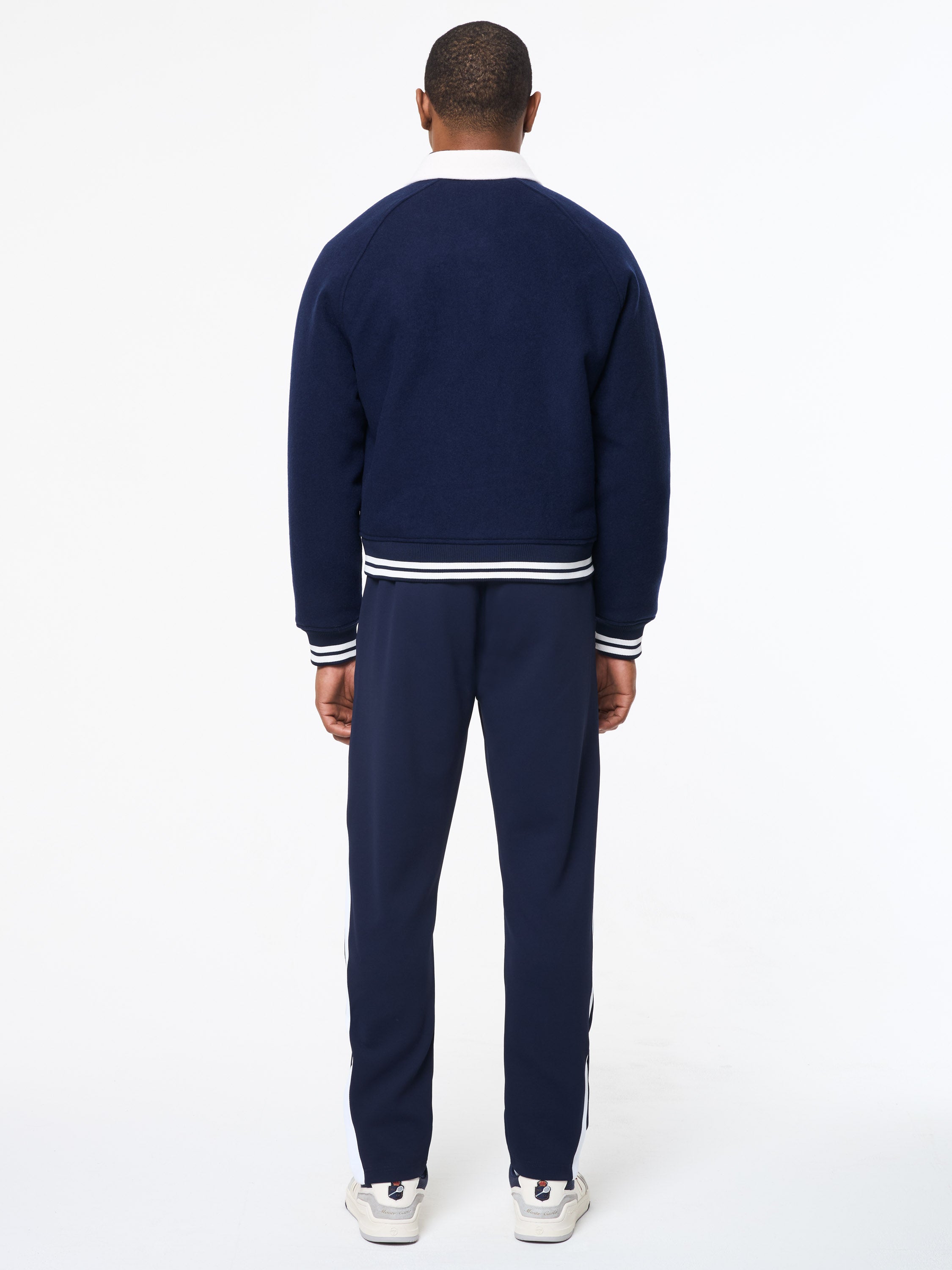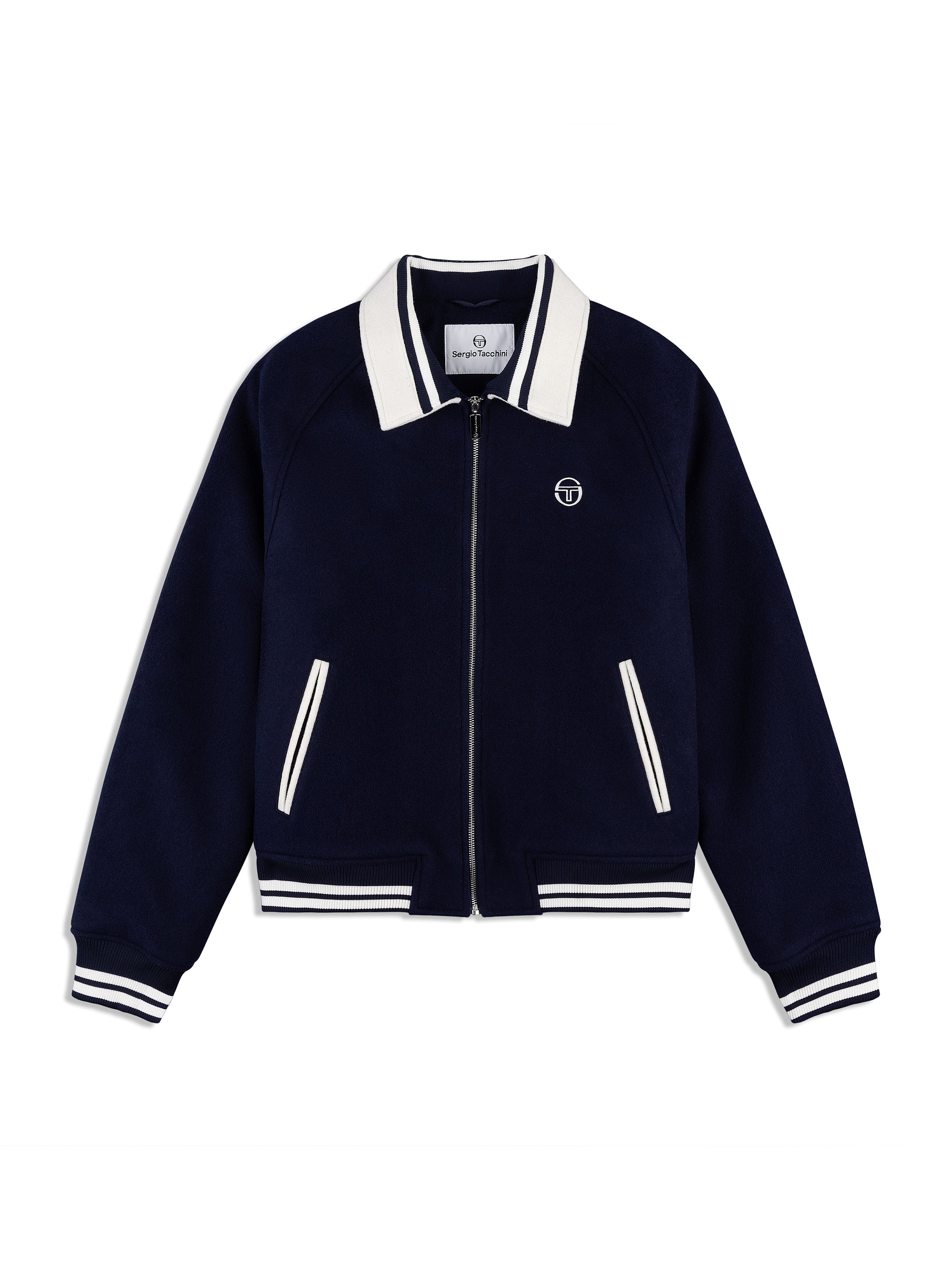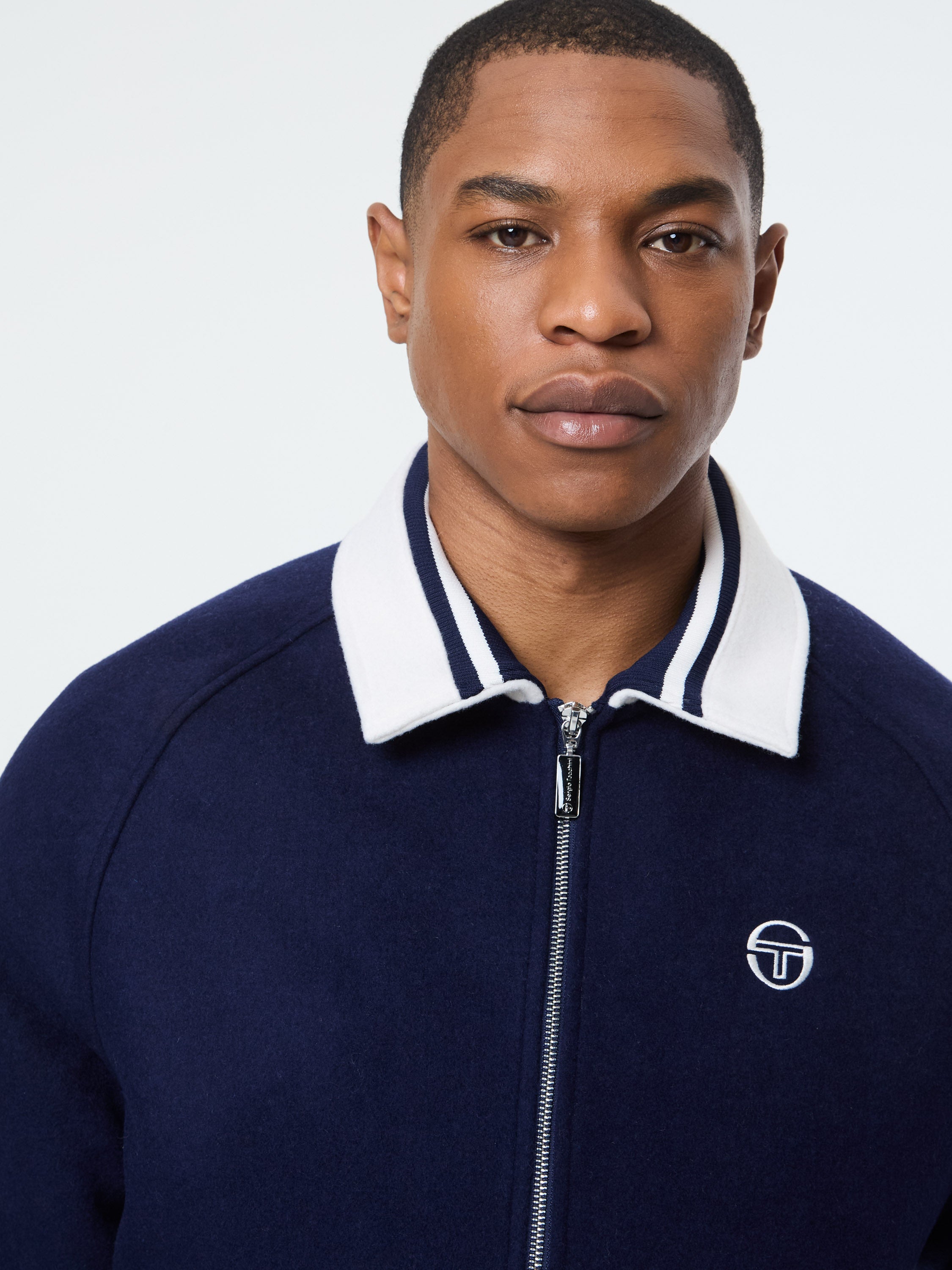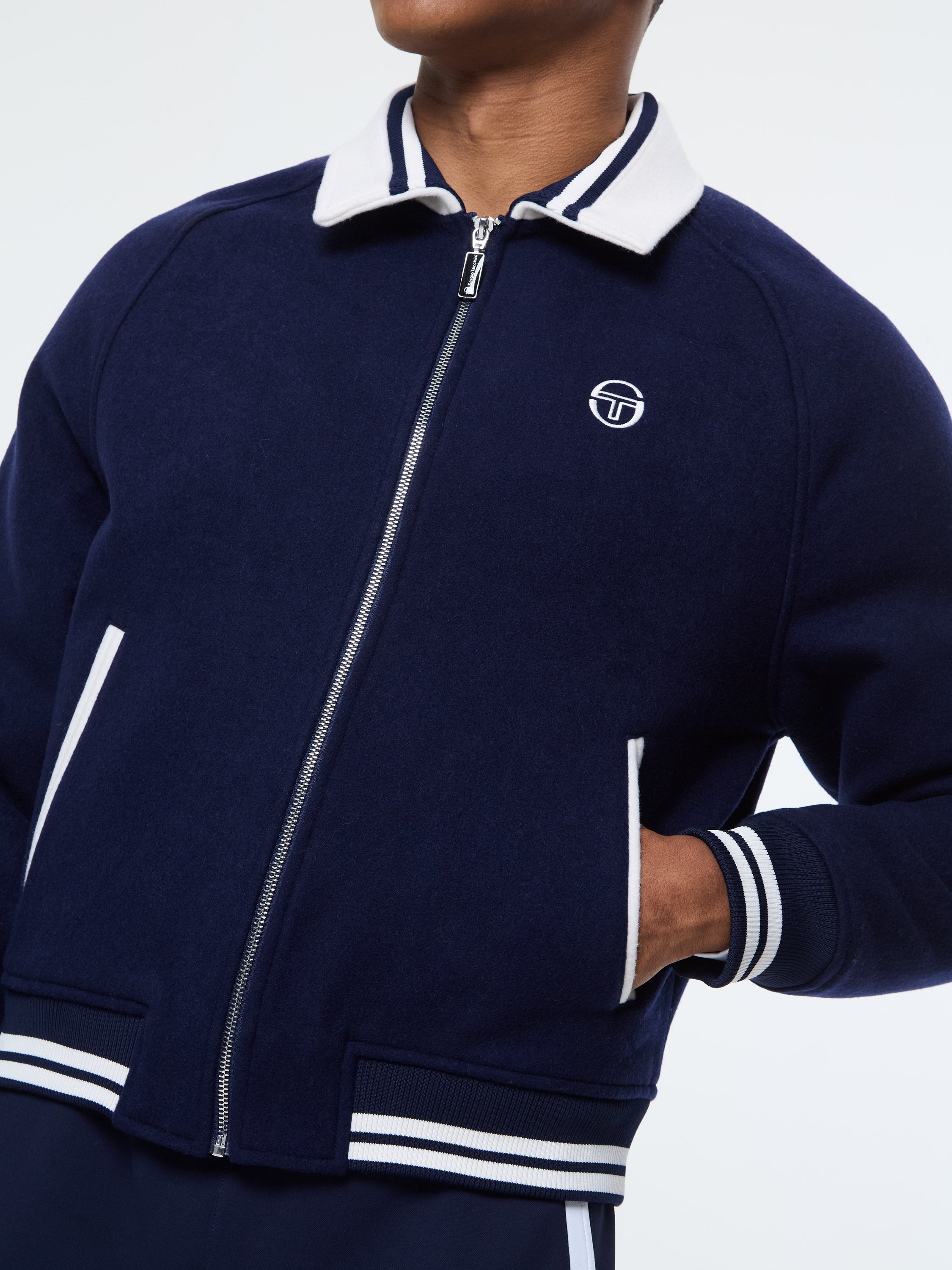 A modern take on classic collegiate style, the Marco Varsity Jacket is crafted from a warm and durable melton wool blend for a luxurious feel. Featuring stripe accents at the rib-knit trims, this premium full-zip is finished with contrast pops at the handwarmer pockets for a refined athletic edge. Timeless, elevated, and built for everyday wear.