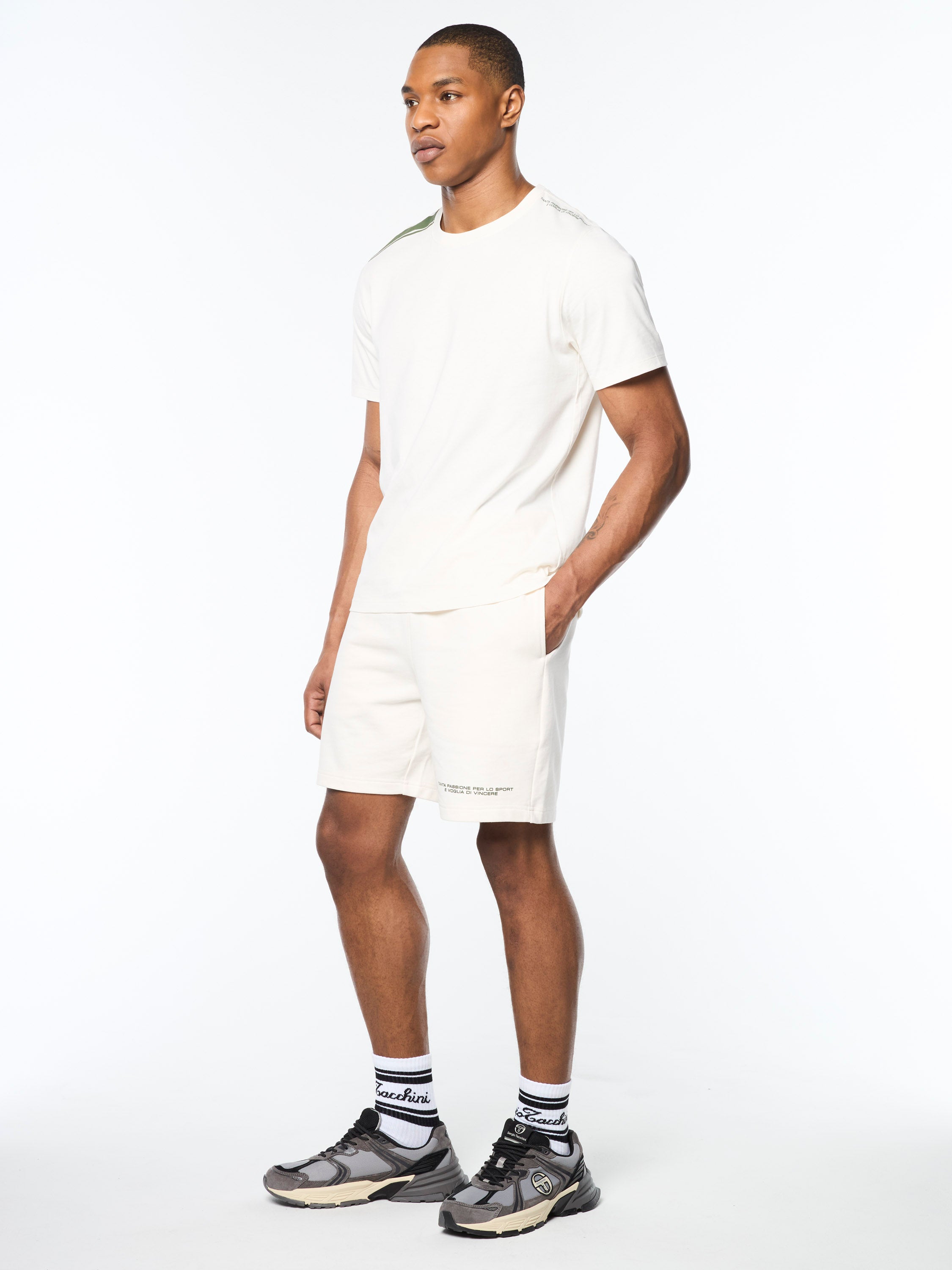 • Italian sports slogan in high shine print at left shoulder