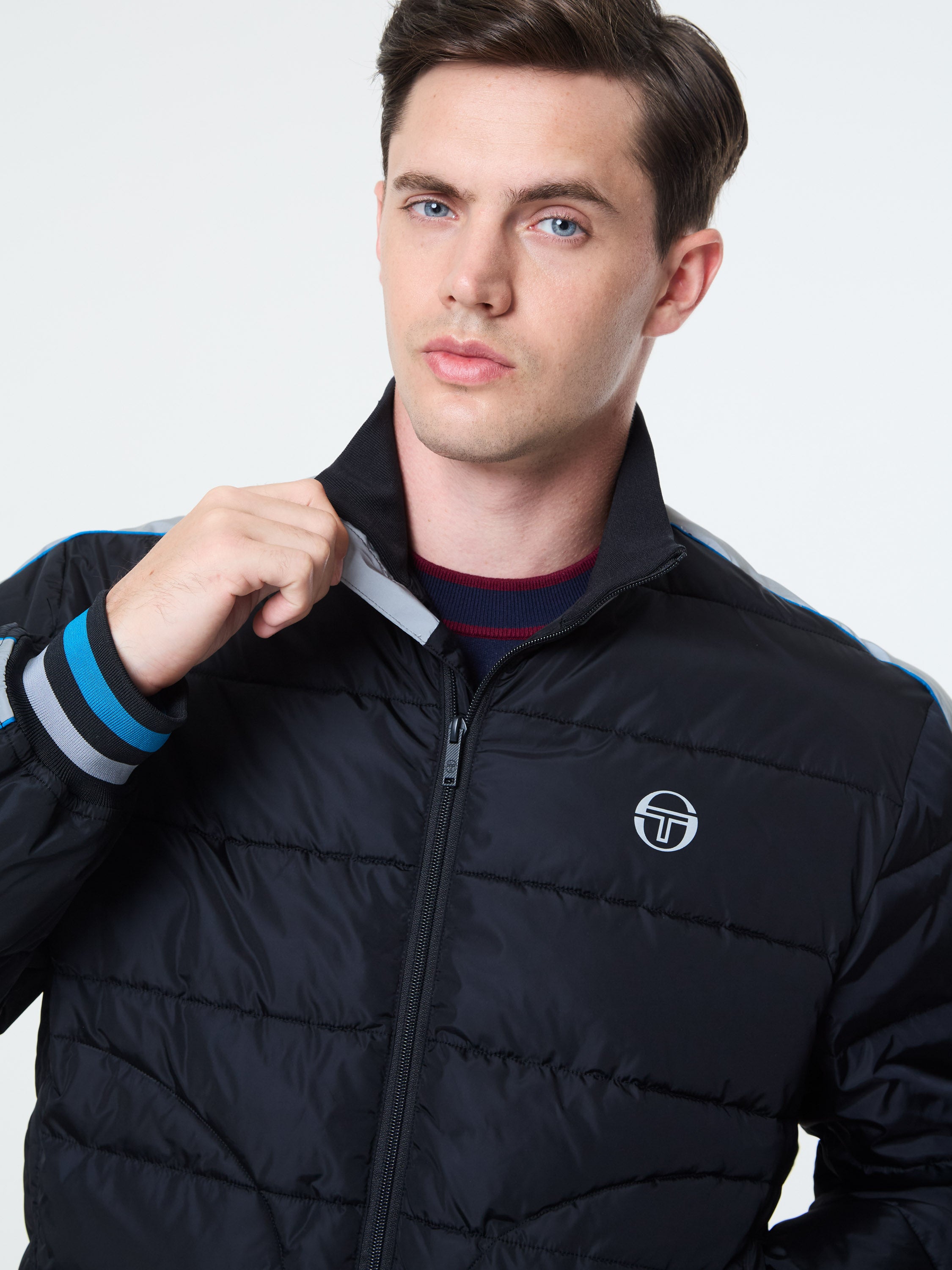 Engineered for warmth with elevated style. The Caldo Puffer Jacket is cut from durable nylon with all-over insulated baffles for superior comfort in colder temps. Featuring reflective panels and contrast piping accents down the sleeves, this sleek puffer is finished with striped rib-knit trims and zip pockets for secure storage. Designed to stand out—day or night.