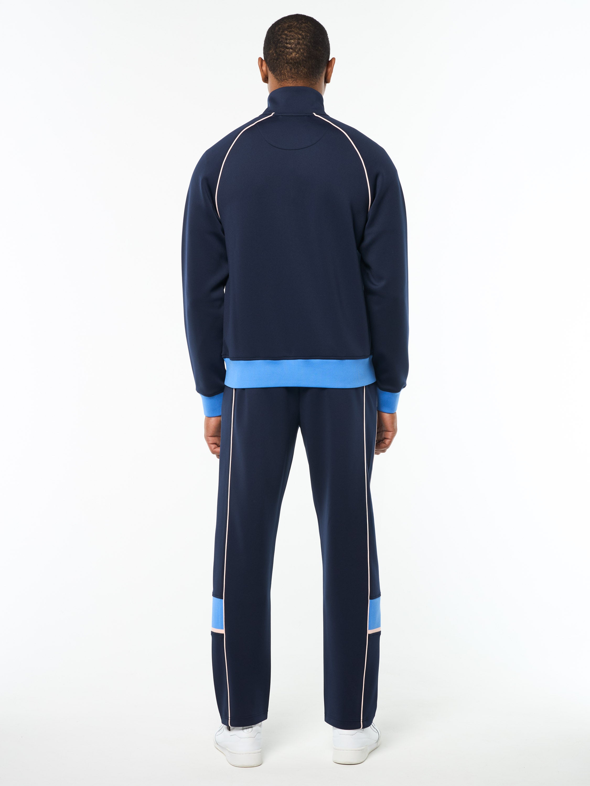 Built for movement, styled for the moment. The Lago Track Jacket is crafted from smooth-to-the-touch diver fabric that's breathable and flexible with a springy 4-way stretch—ready for wherever the day takes you. Blending sleek performance with retro sport vibes, this premium track jacket is complete with a rib-knit double stripe panel at the chest, zip-secured pockets, and contrast trims.