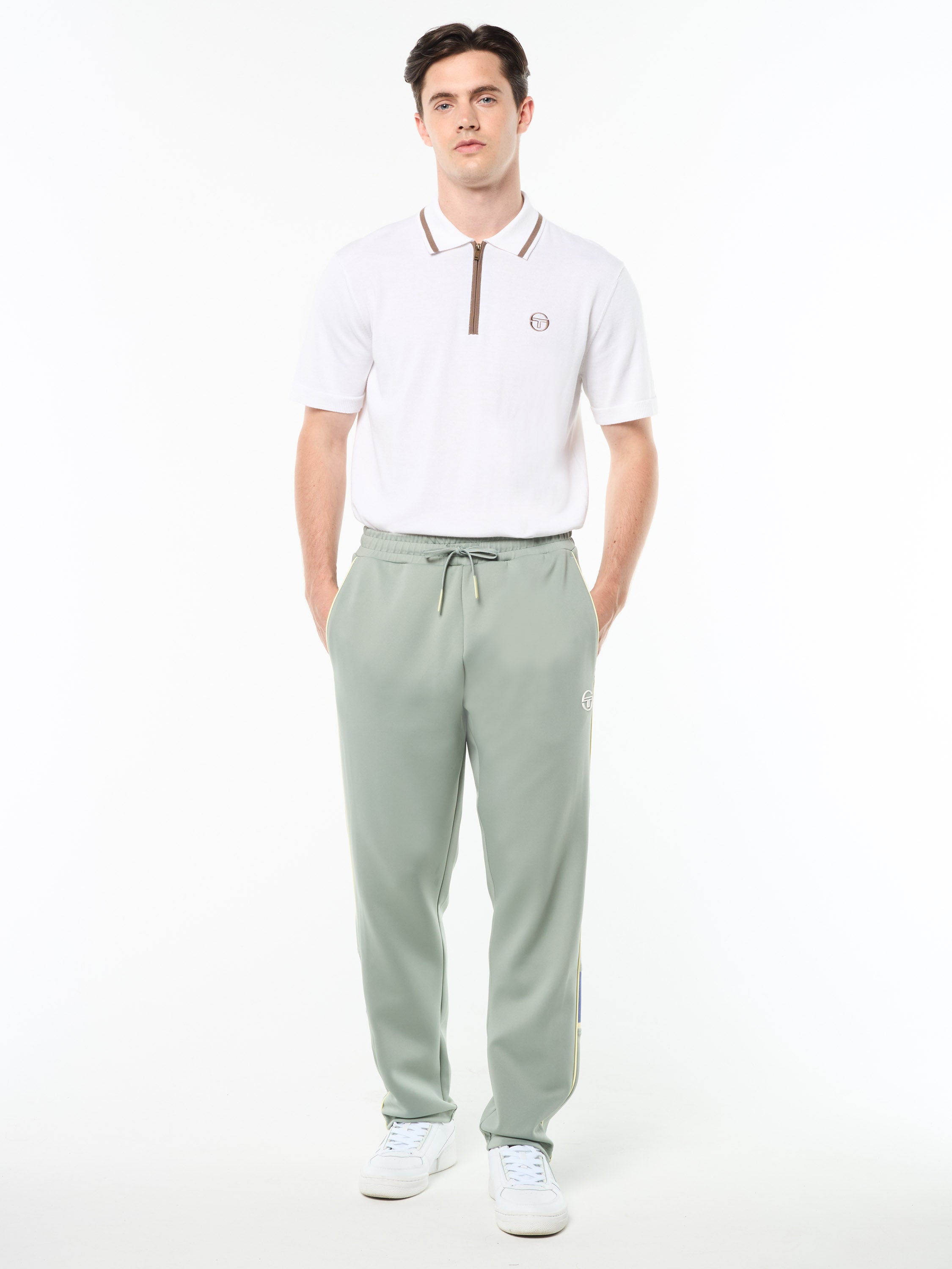 Built for movement, styled for the moment. The Lago Track Pant is crafted from smooth-to-the-touch diver fabric that's breathable and flexible with a springy 4-way stretch—ready for wherever the day takes you. Blending sleek performance with retro sport vibes, this premium track pant is complete with contrast piping accents and rib-knit double stripe panels.