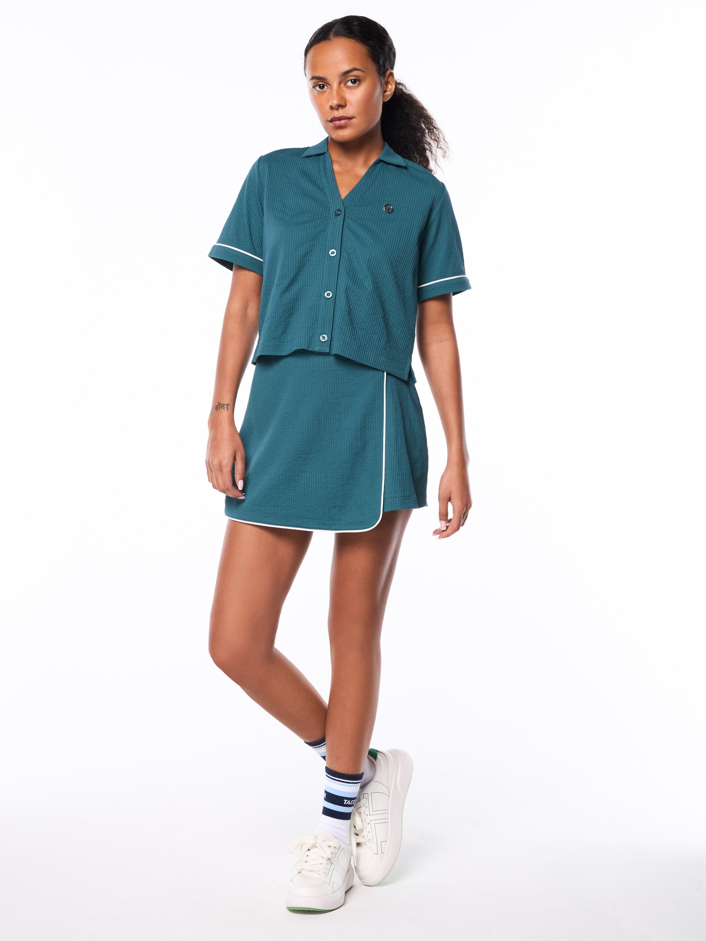 Designed to balance style and function, this versatile piece transitions seamlessly from day to night, perfect on the court, or evenings out. The stretch construction ensures comfortable, easy wear with flattering fit.