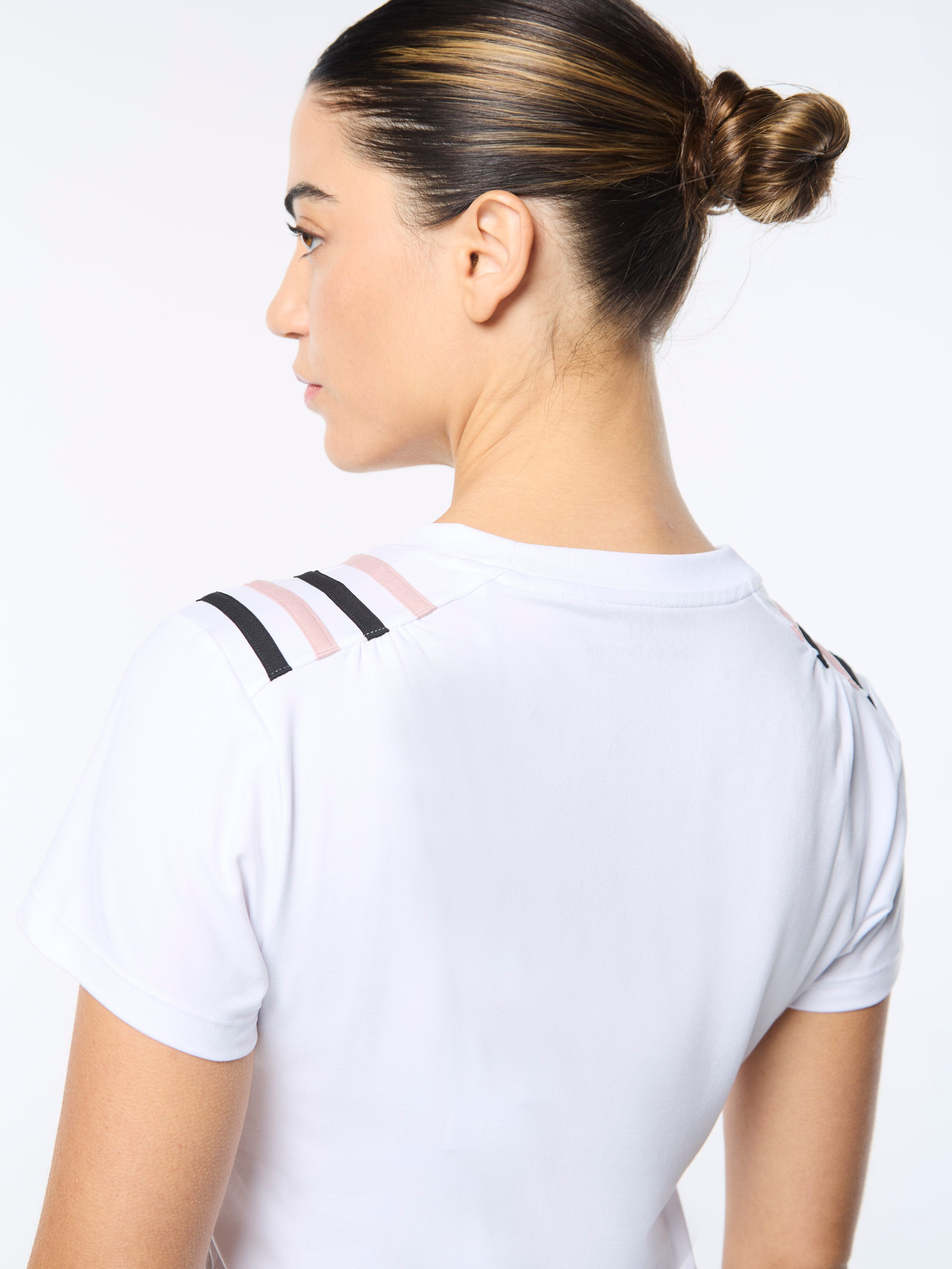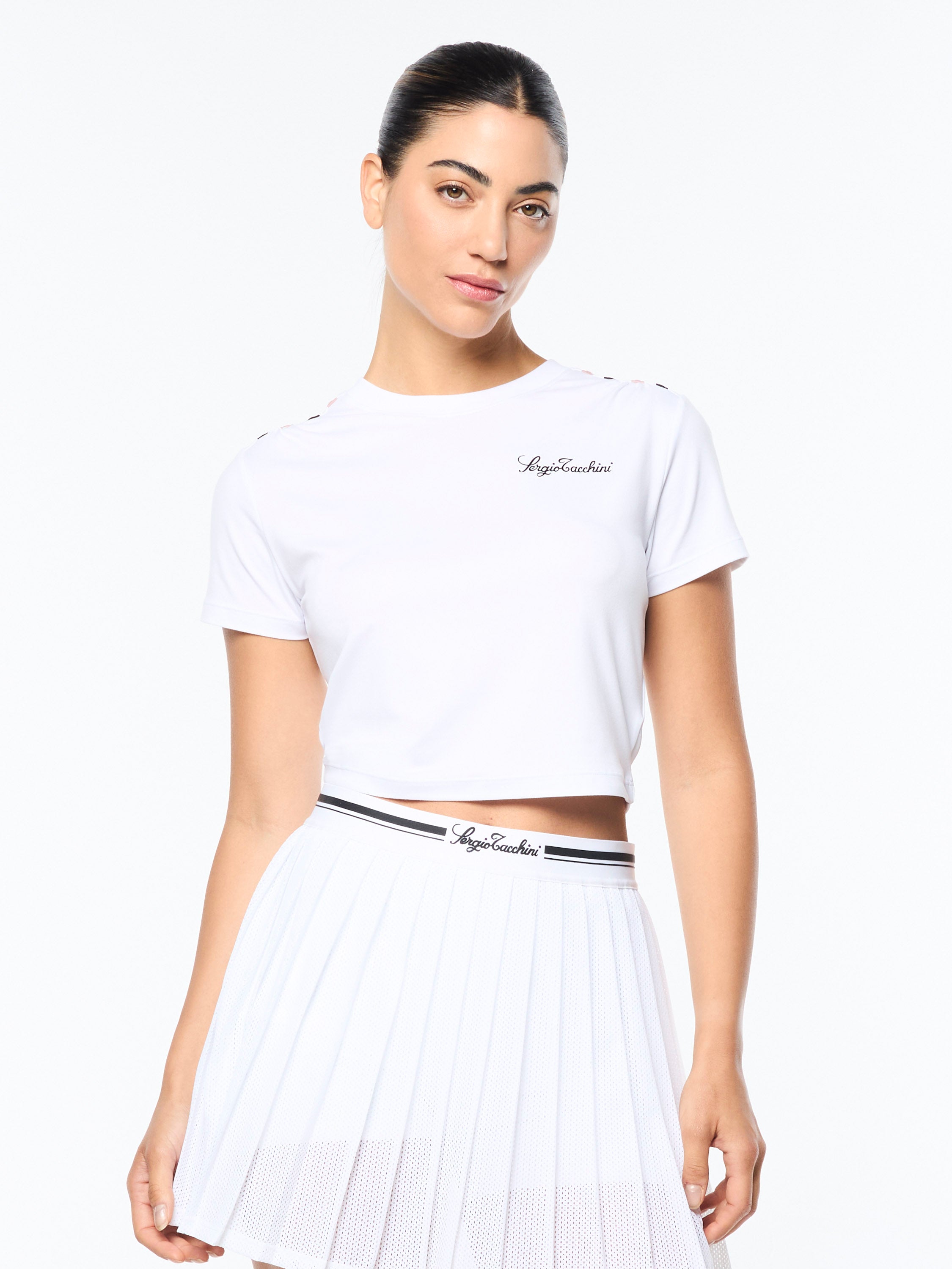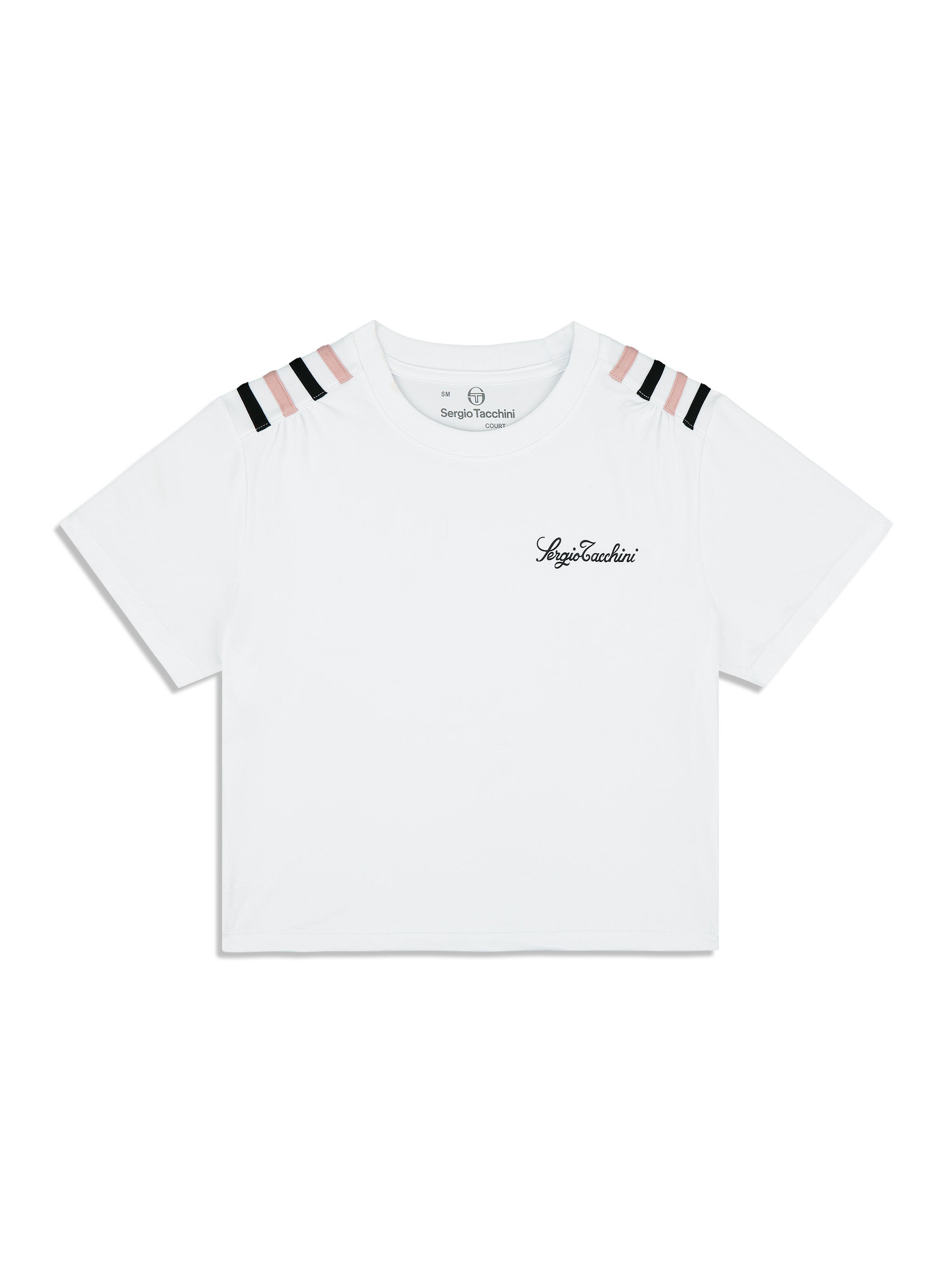 An elevated staple that transitions seamlessly from the court to your everyday. Our Verona Crop Top is crafted from buttery-soft performance stretch fabric that's perfect for working out and casual wear. Featuring pop color stripe taping at the shoulders, this cropped form-fit tee is finished with a Sergio Tacchini script logo at the left chest.Pair with the Verona Mesh Skort for the full fit. (Sold separately)