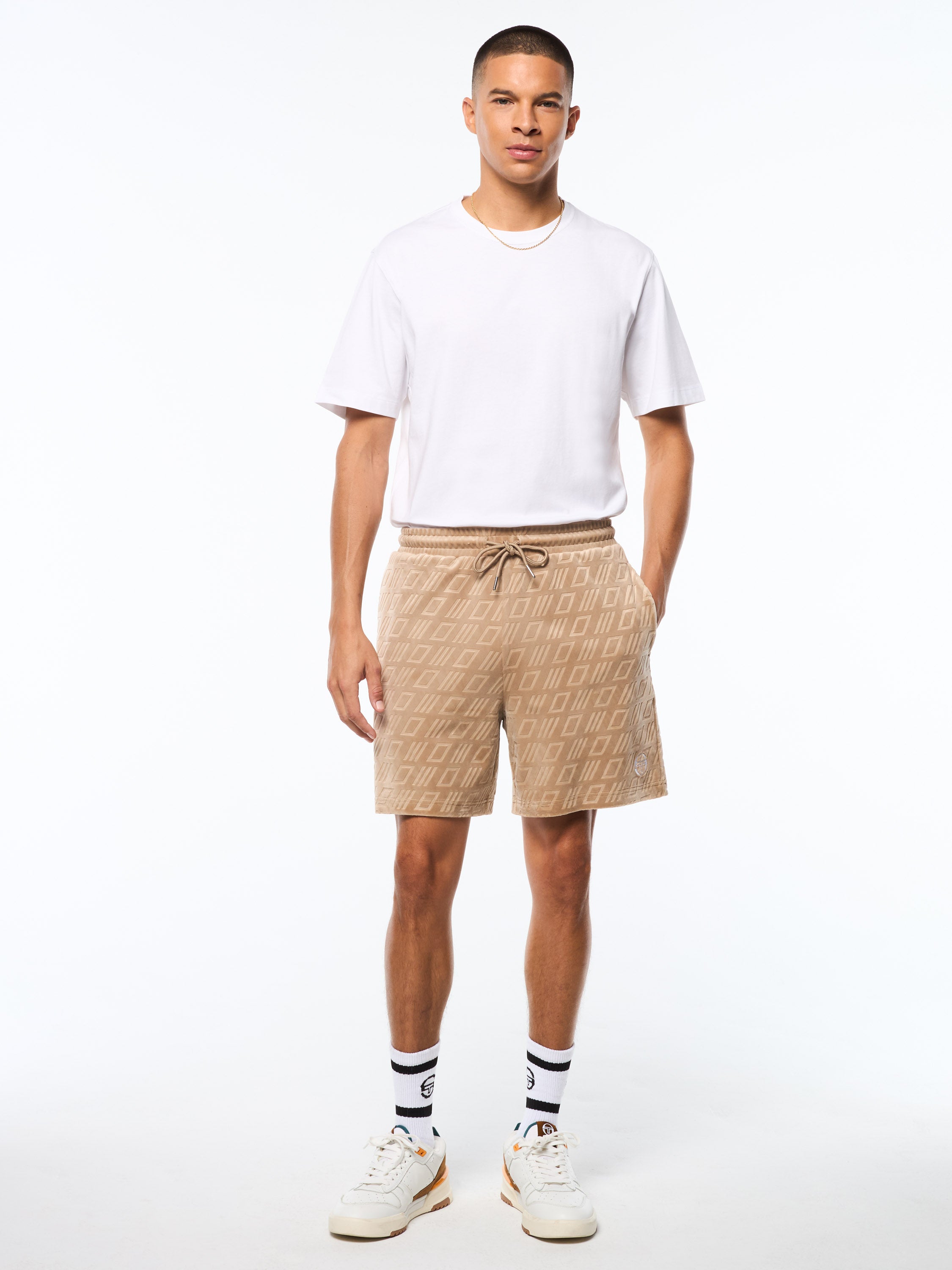 Luxe texture, standout detail. The Bandiera Debossed Velour Short is crafted from ultra-soft stretch velour with a debossed motif all over for a subtle hit of dimension. Finished with an 'ST' embroidered monogram logo at left hem, this elevated short fuses retro athletic heritage with modern polish.