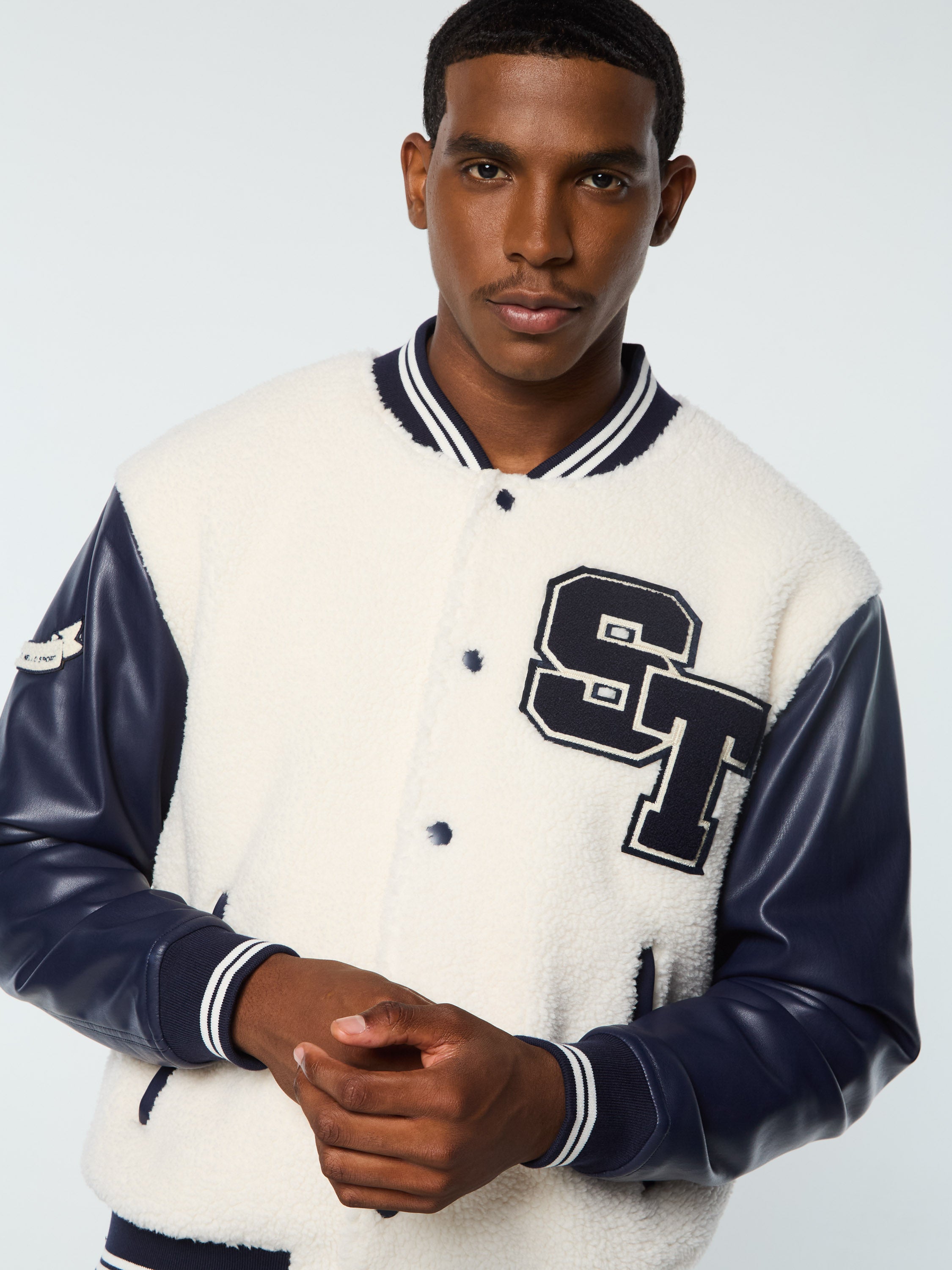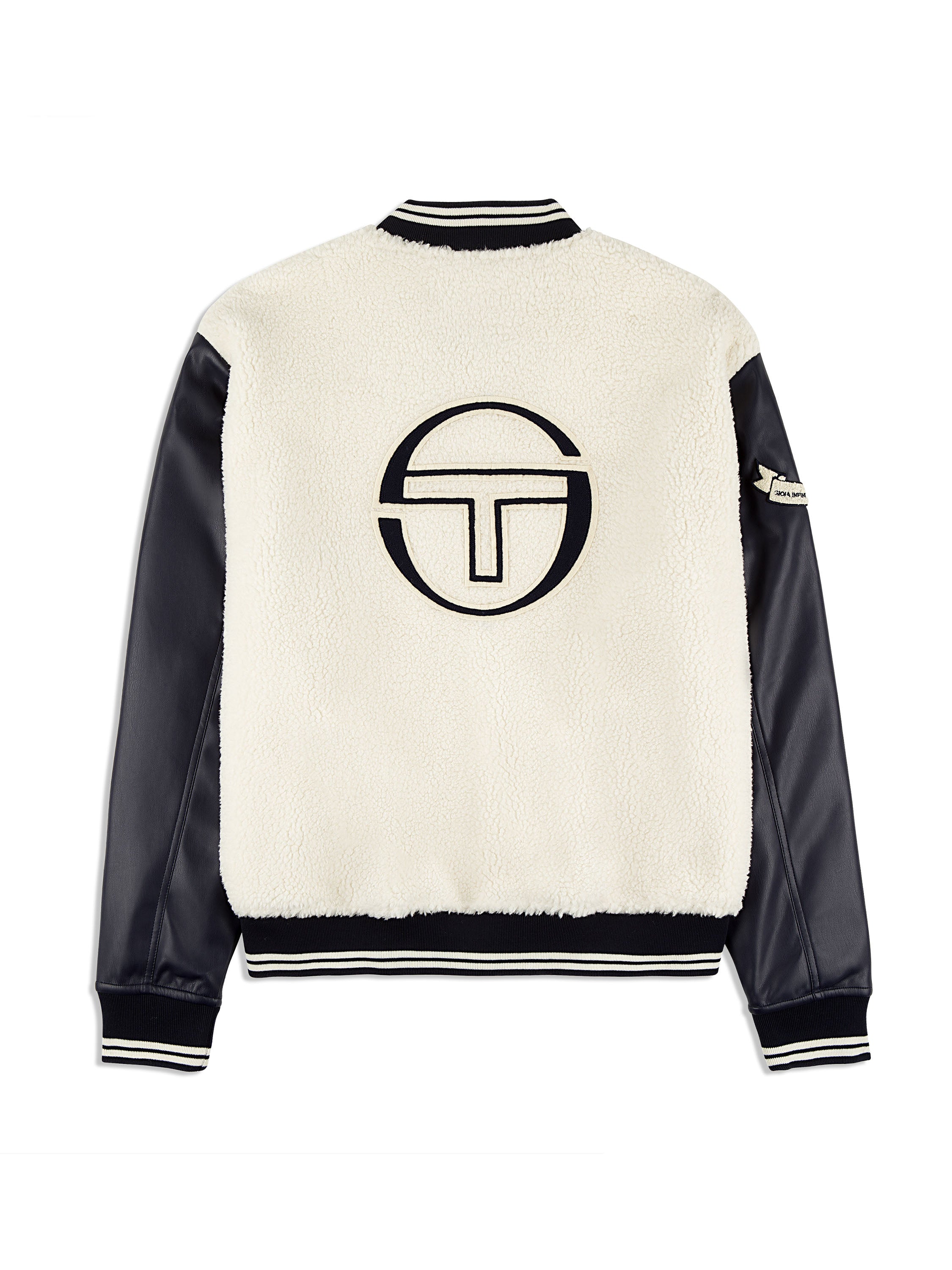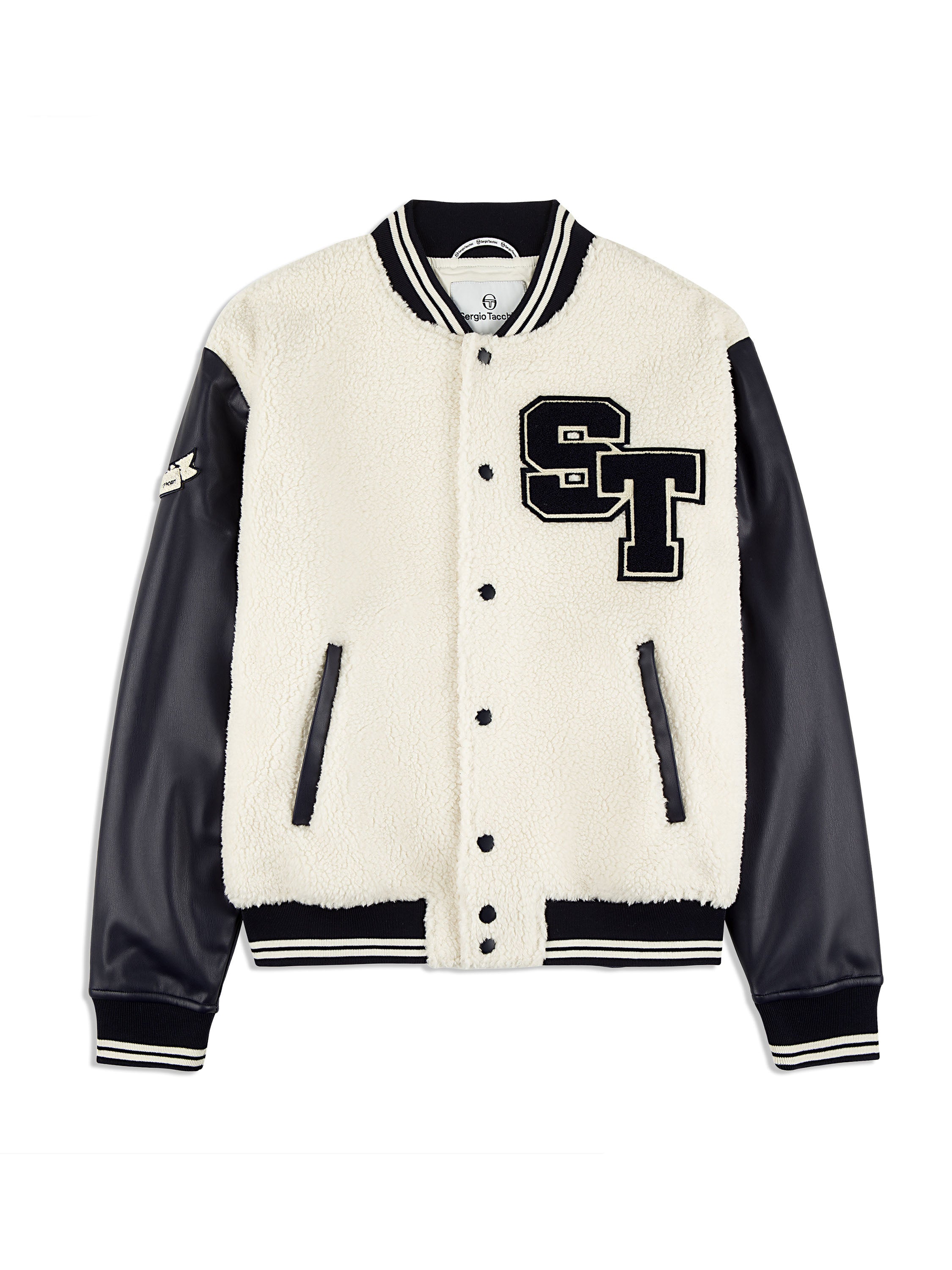 Crafted with a super warm faux sherpa body and faux leather sleeves, the Toppa Varsity Bomber features retro sportswear-inspired logo patches for a Tacchini spin on varsity athletic gear. Cut with a classic snap-button front and striped rib-knit trims, this premium varsity jacket is part of our seasonal "New Ivy" capsule—a contemporary take on collegiate prep aesthetics.