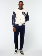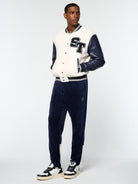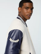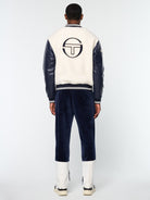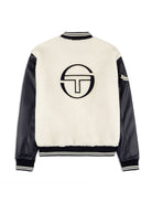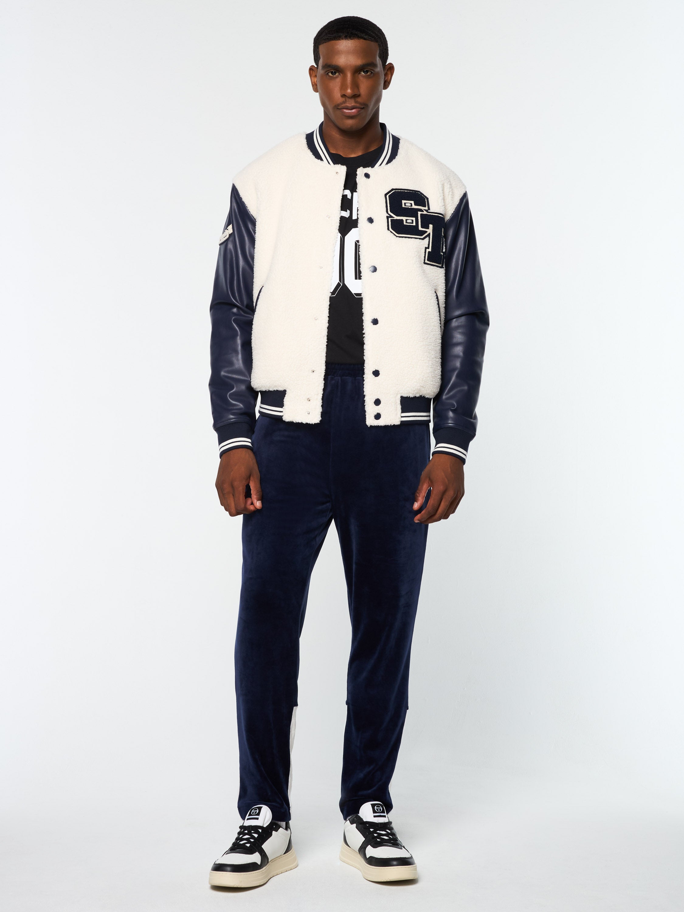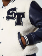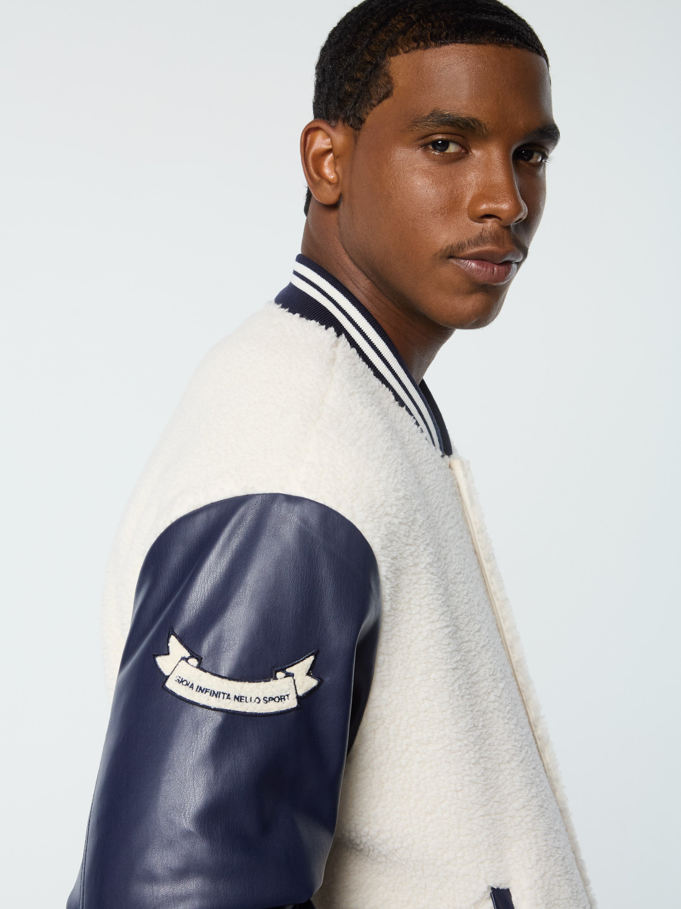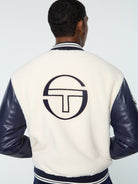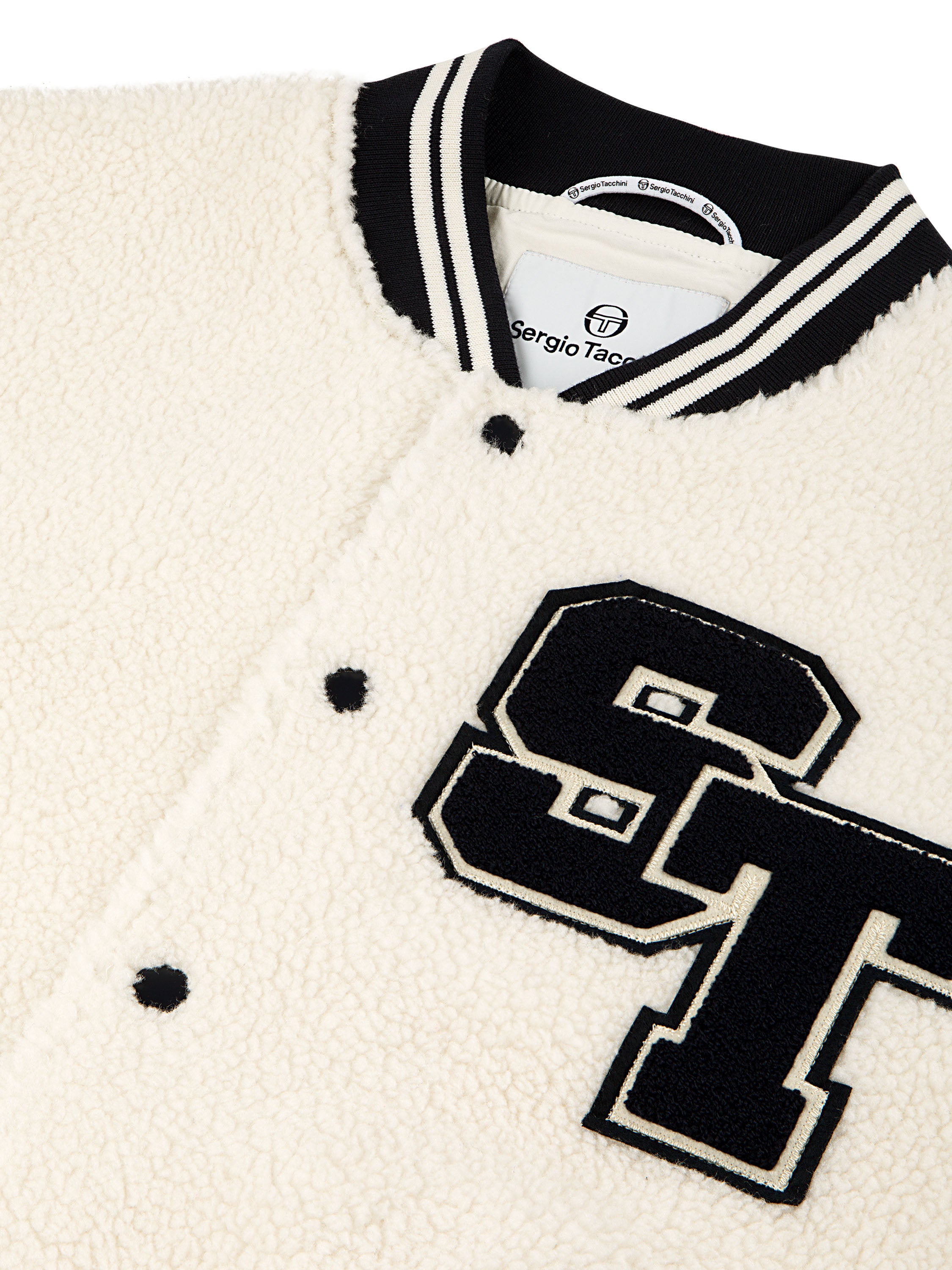 Crafted with a super warm faux sherpa body and faux leather sleeves, the Toppa Varsity Bomber features retro sportswear-inspired logo patches for a Tacchini spin on varsity athletic gear. Cut with a classic snap-button front and striped rib-knit trims, this premium varsity jacket is part of our seasonal "New Ivy" capsule—a contemporary take on collegiate prep aesthetics.