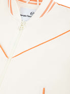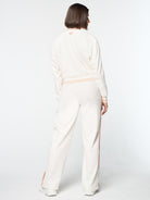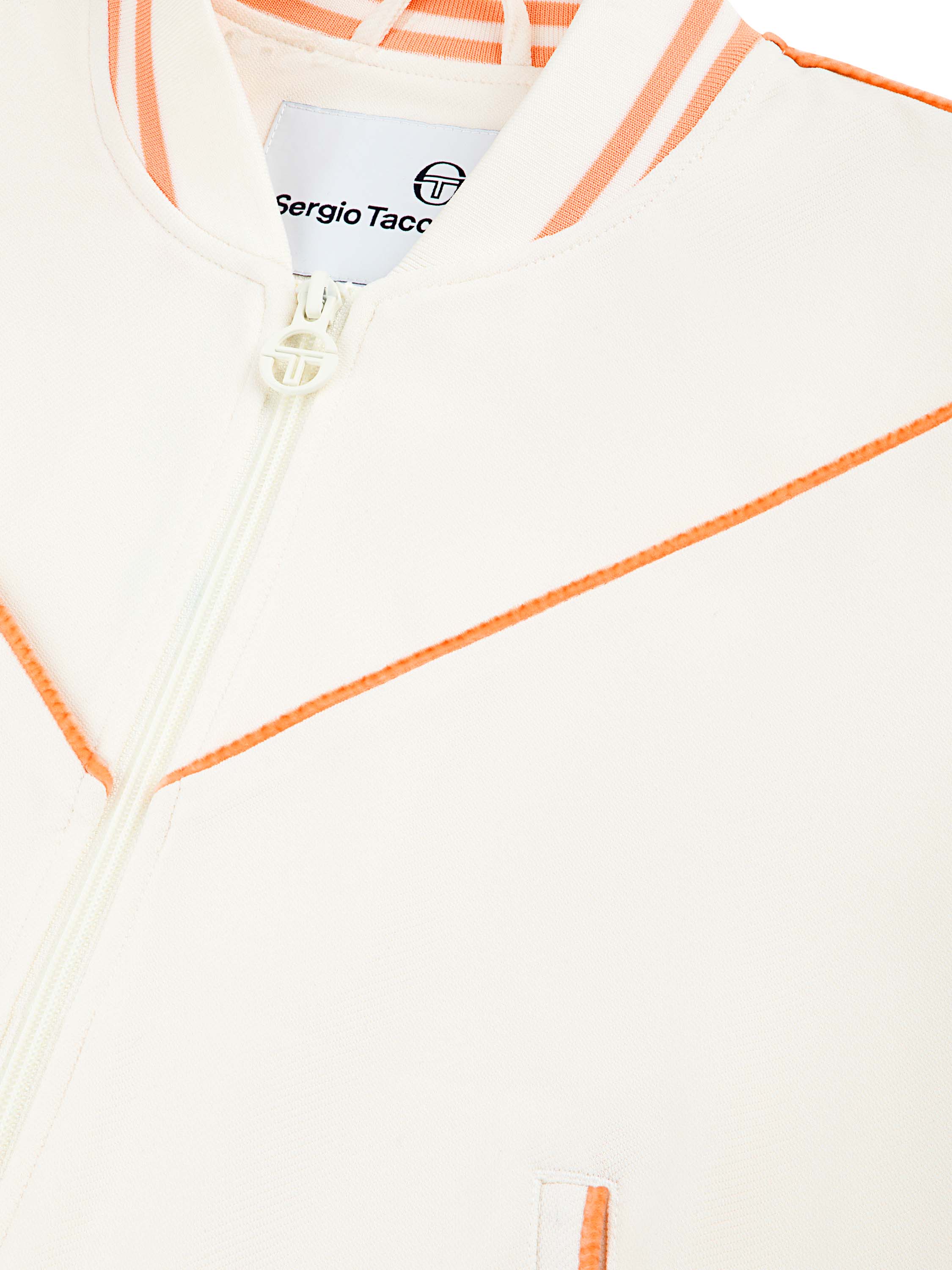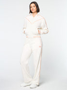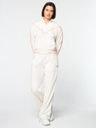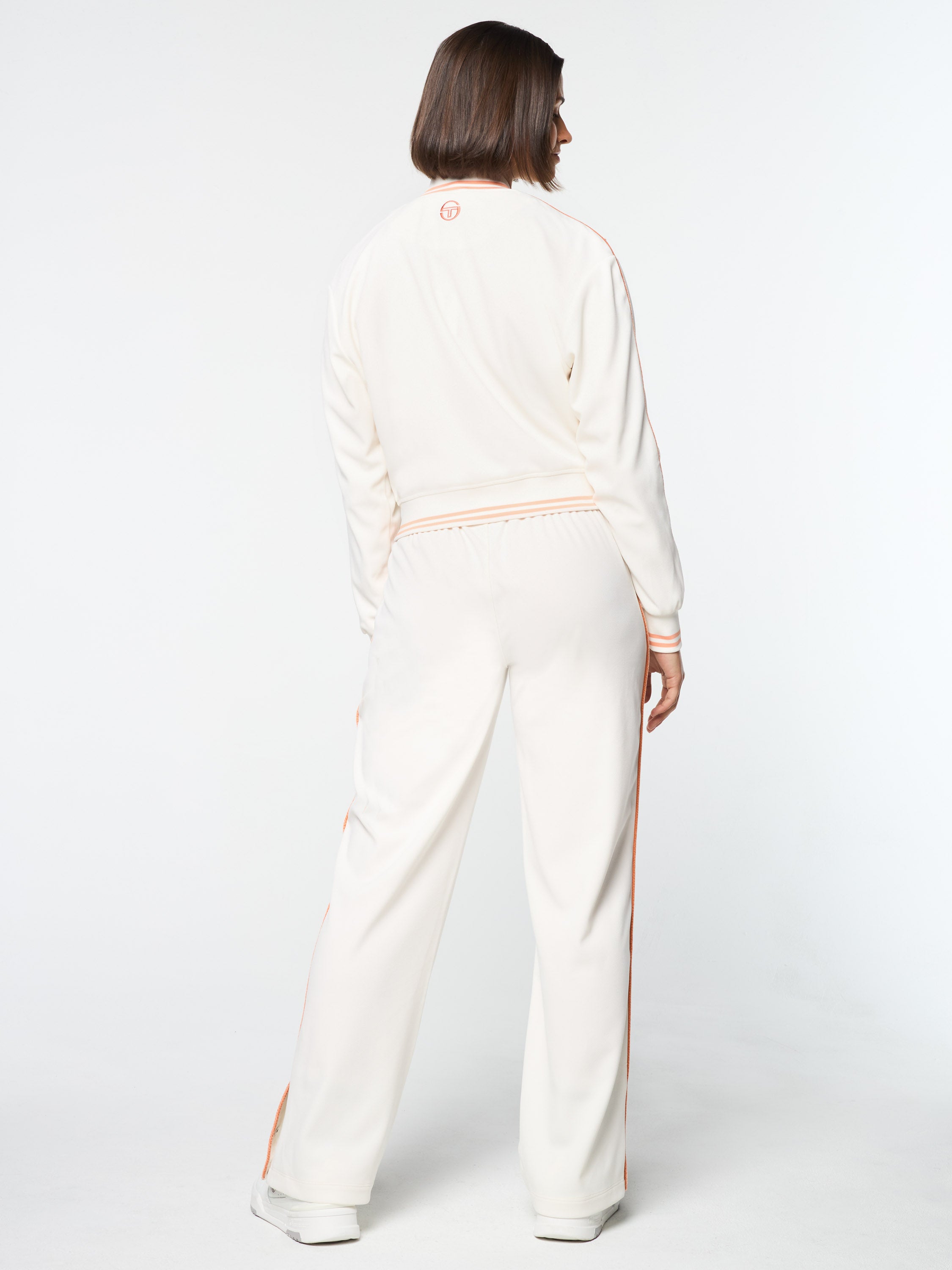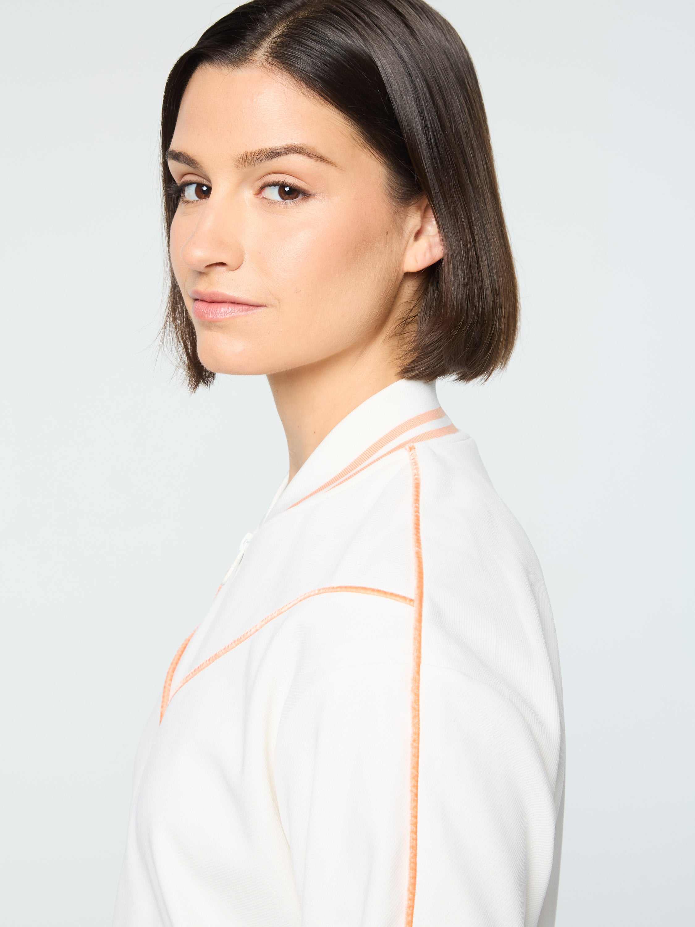 - Velour piping accents at chest, shoulders, and sleeves