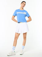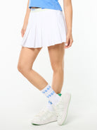 Serve up style and performance with the Delfina Skort—an elevated take on a tennis essential. Crafted from lightweight, water-repellent stretch fabric, this pleated skirt moves effortlessly with you on and off the court, while built-in supportive undershorts provide coverage and confidence through every match point. Finished with our Sergio Tacchini script logo and classic striping at the elastic waistband, this wear-everywhere skort blends athletic heritage with modern polish.