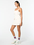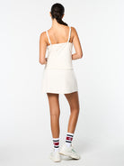 Perfect for summer beach trips, sports activities, or city strolls. The Edda Tank Top is crafted from super soft terry toweling fabric in a cropped cut with adjustable spaghetti straps. Featuring a buttoned overlay chest panel for added support, this casual tank is an easy-to-wear wardrobe staple.Pair with the Edda Skirt for the full fit. (Sold separately)