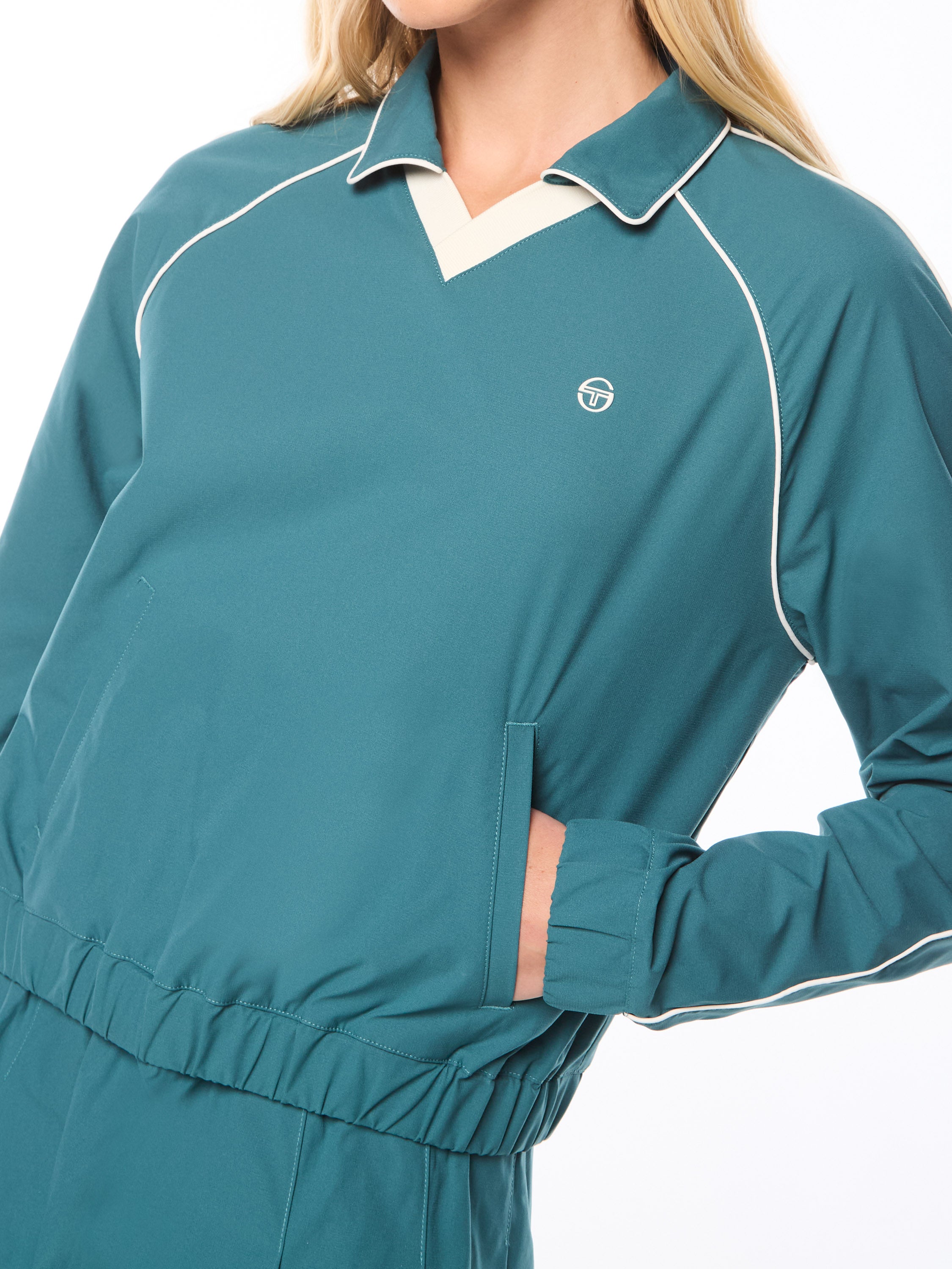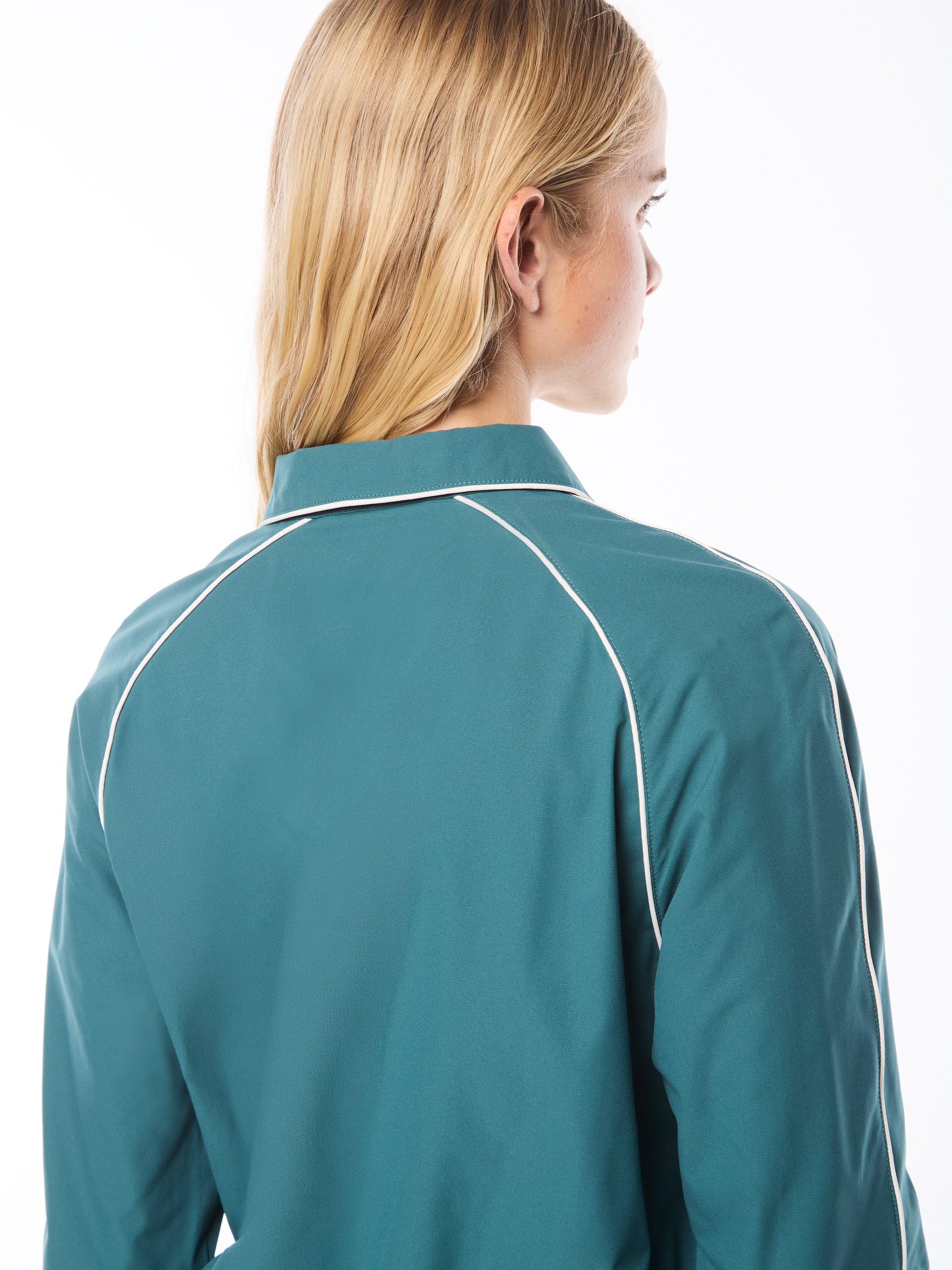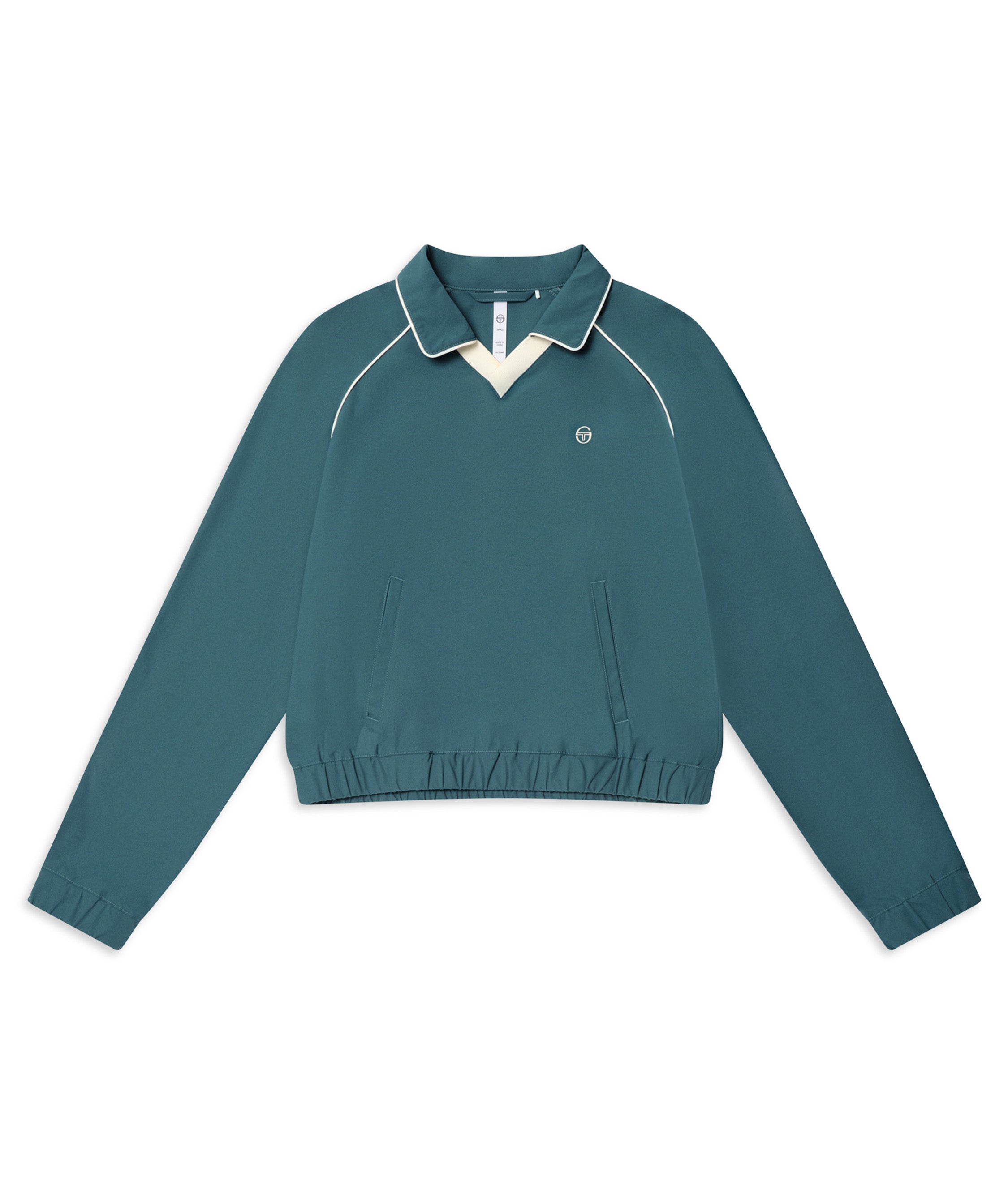 - Color contrast piping detail at raglan sleeves and down sleeves