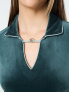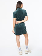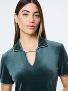 The Lina Velour Dress reimagines sporty heritage through a feminine lens. Crafted from plush stretch velour, this short-sleeve mini dress features a spread collar, V-neck placket, and a metal 'ST' monogram charm across the neck for a touch of polish. Finished with taping stripes and piping accents at the trims, it's a versatile piece that takes you from daytime outings to evening plans with effortless cool. See more in the Lina Collection
