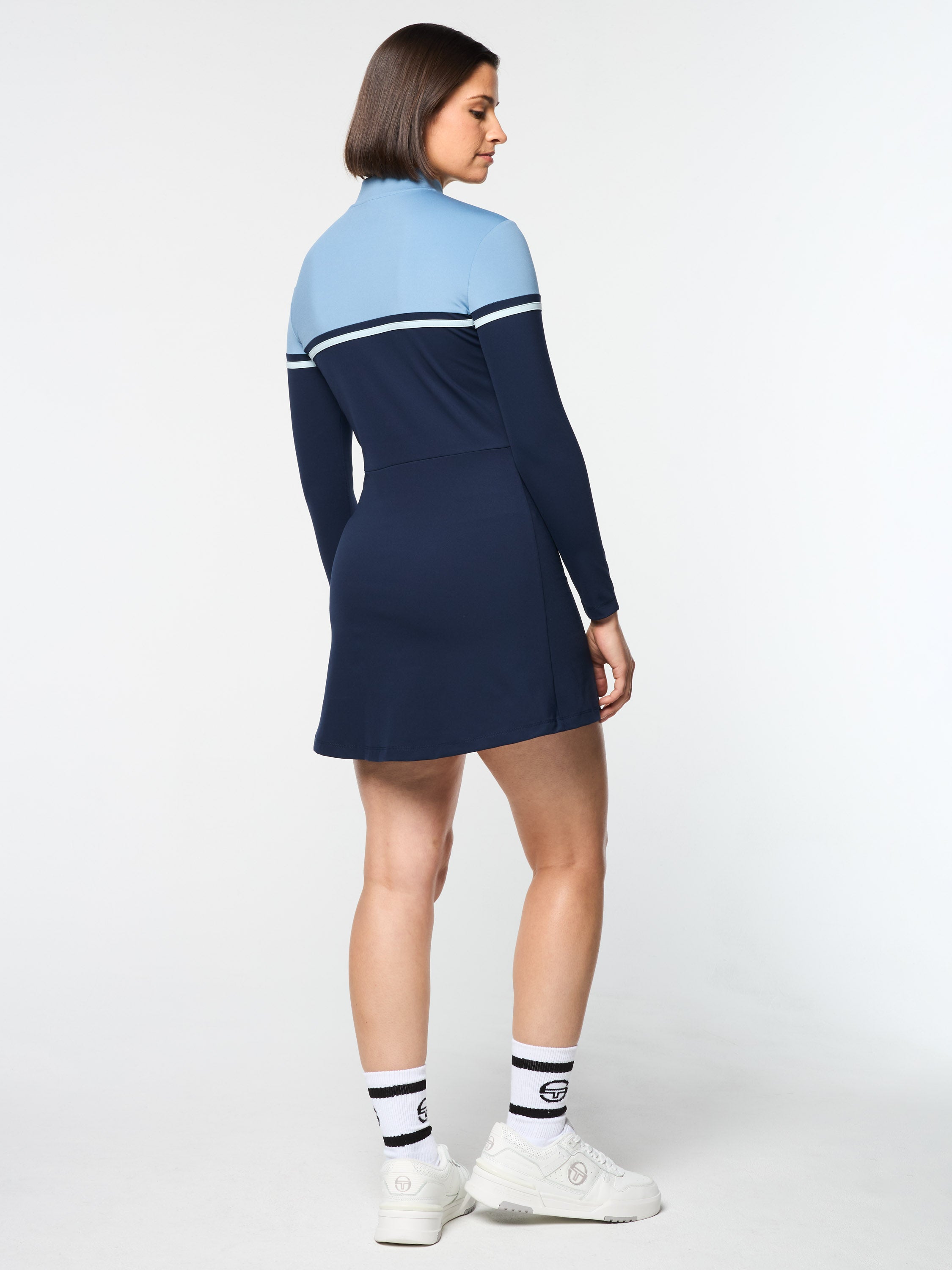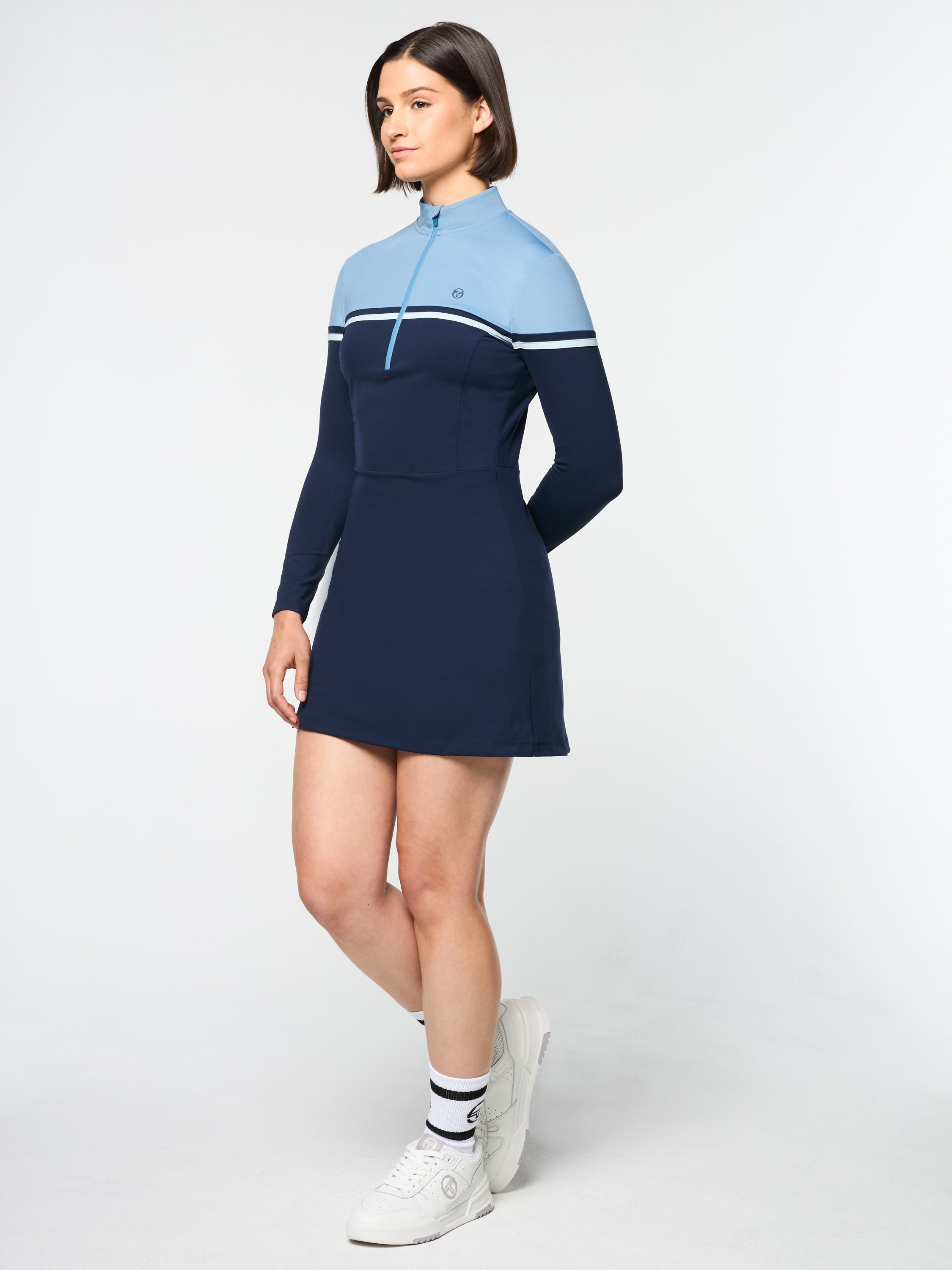 A tennis classic for contemporary times, our color-blocked Istrana Dress is crafted from buttery-soft 4-way stretch fabric that's made to move with you through your workout to your everyday. Designed with a water-repellent aqua-guard zip placket at the front for easy venting, this fitted long sleeve dress includes supportive undershorts with ball & phone pockets for convenience on the court & beyond.