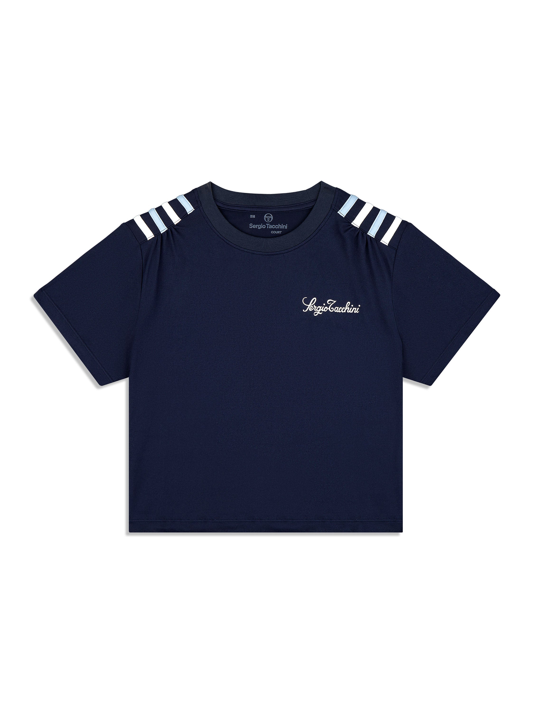 An elevated staple that transitions seamlessly from the court to your everyday. Our Verona Crop Top is crafted from buttery-soft performance stretch fabric that's perfect for working out and casual wear. Featuring pop color stripe taping at the shoulders, this cropped form-fit tee is finished with a Sergio Tacchini script logo at the left chest.Pair with the Verona Mesh Skort for the full fit. (Sold separately)