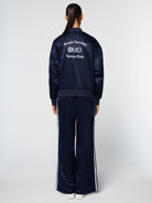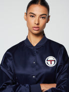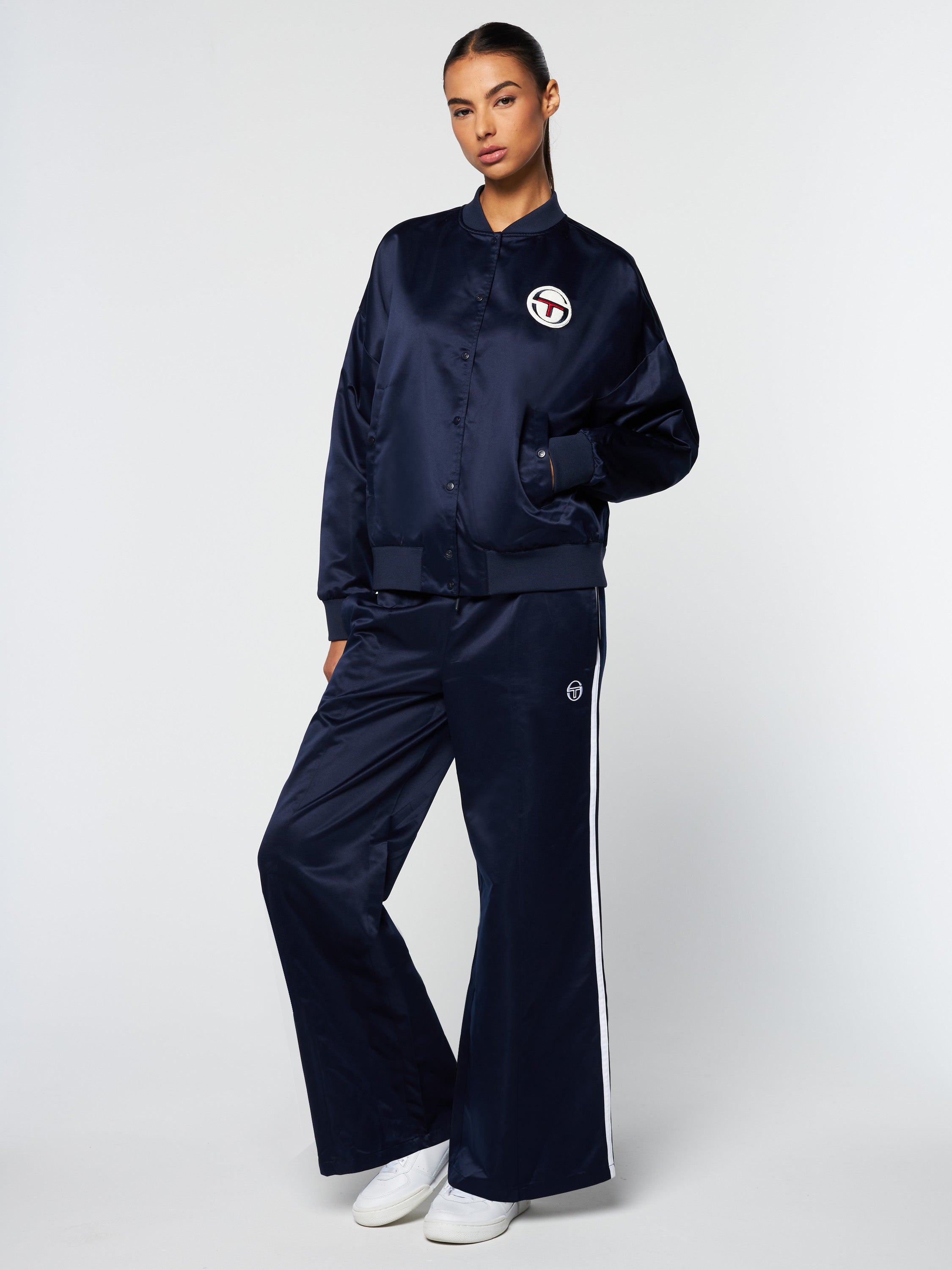 Inspired by vintage sportswear, the Miss Angela Bomber Jacket is crafted from premium poly satin for a smooth and luxurious finish. Featuring an 'ST' monogram patch with terry detailing at the chest, this elegant button-up bomber is complete with embroidered Sergio Tacchini Tennis Club artwork at the back.Pair with the Miss Stella Pants for the full fit. (Sold separately)