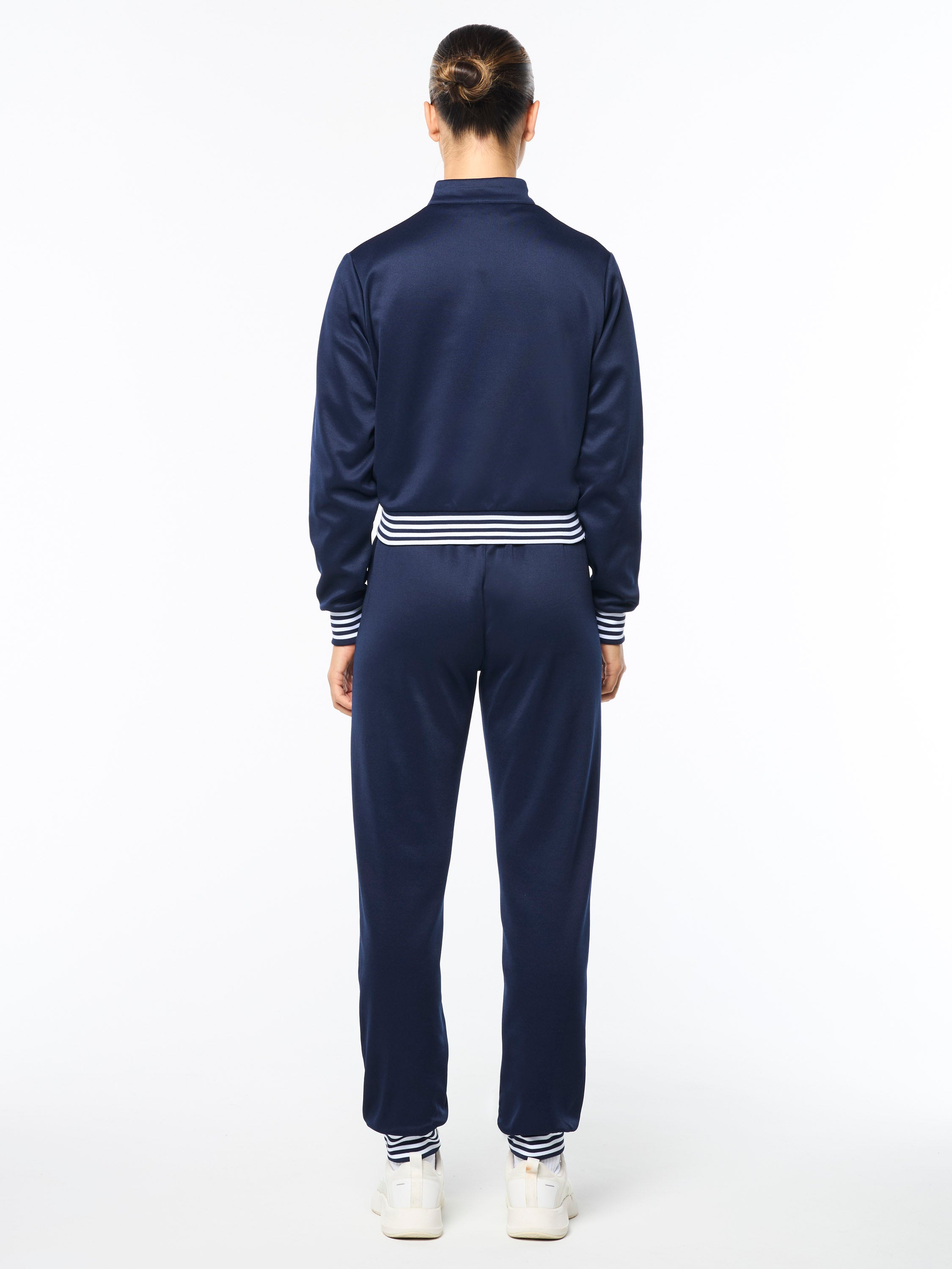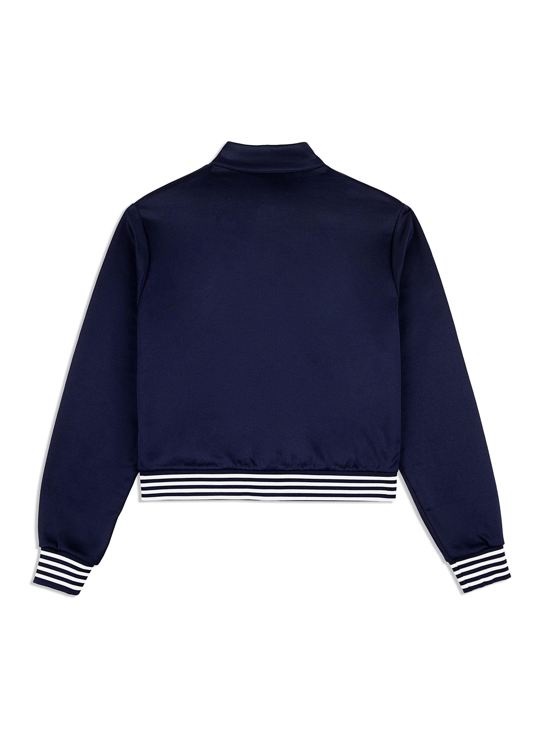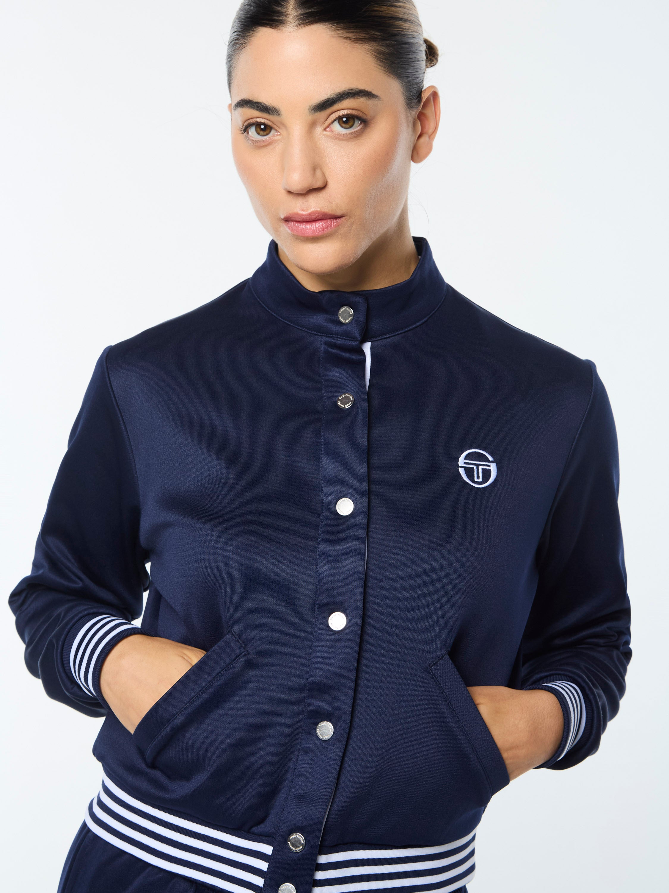 Set sail in style with our premium Sienna Track Jacket, crafted from comfortable double-knit fabric that's soft against the skin, breathable, and perfect for everyday wear. Cut with a snap-button front in a cropped fit for easy layering, this vacation-ready track jacket is complete with a mock neck and stripe accents at the trims for a nautical vibe.Pair with the Sienna Track Pant for the full fit. (Sold separately)