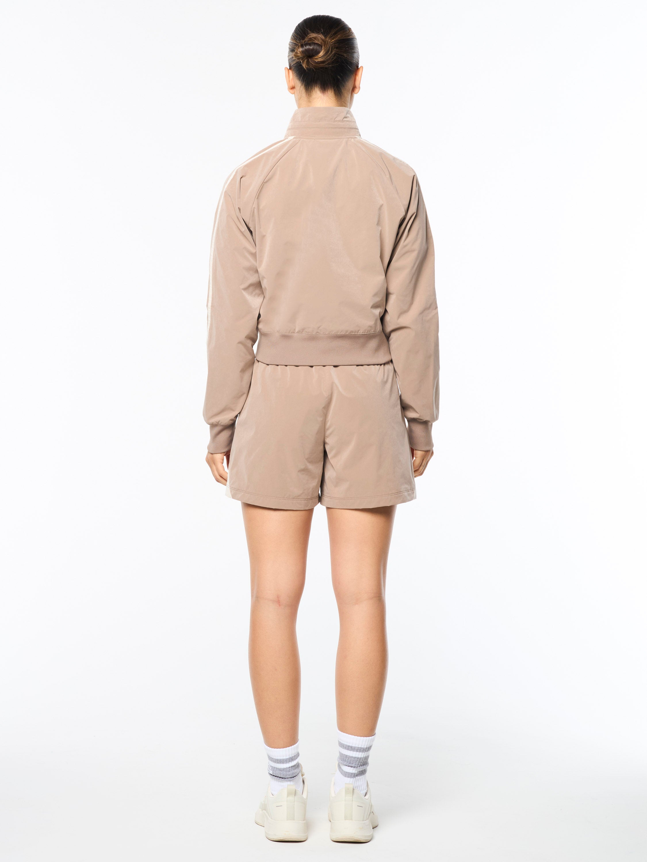 Designed to transition effortlessly from morning warmups to lunch outings, our Pippa Track Jacket is crafted from peached poly-nylon with an incredibly soft hand feel and unique two-tone effect. Featuring an adjustable drawstring at the stand-up collar for extra style points, this elevated track jacket is finished with contrast stripe taping down the sleeves.Pair with the Pippa Track Short for the full fit. (Sold separately)