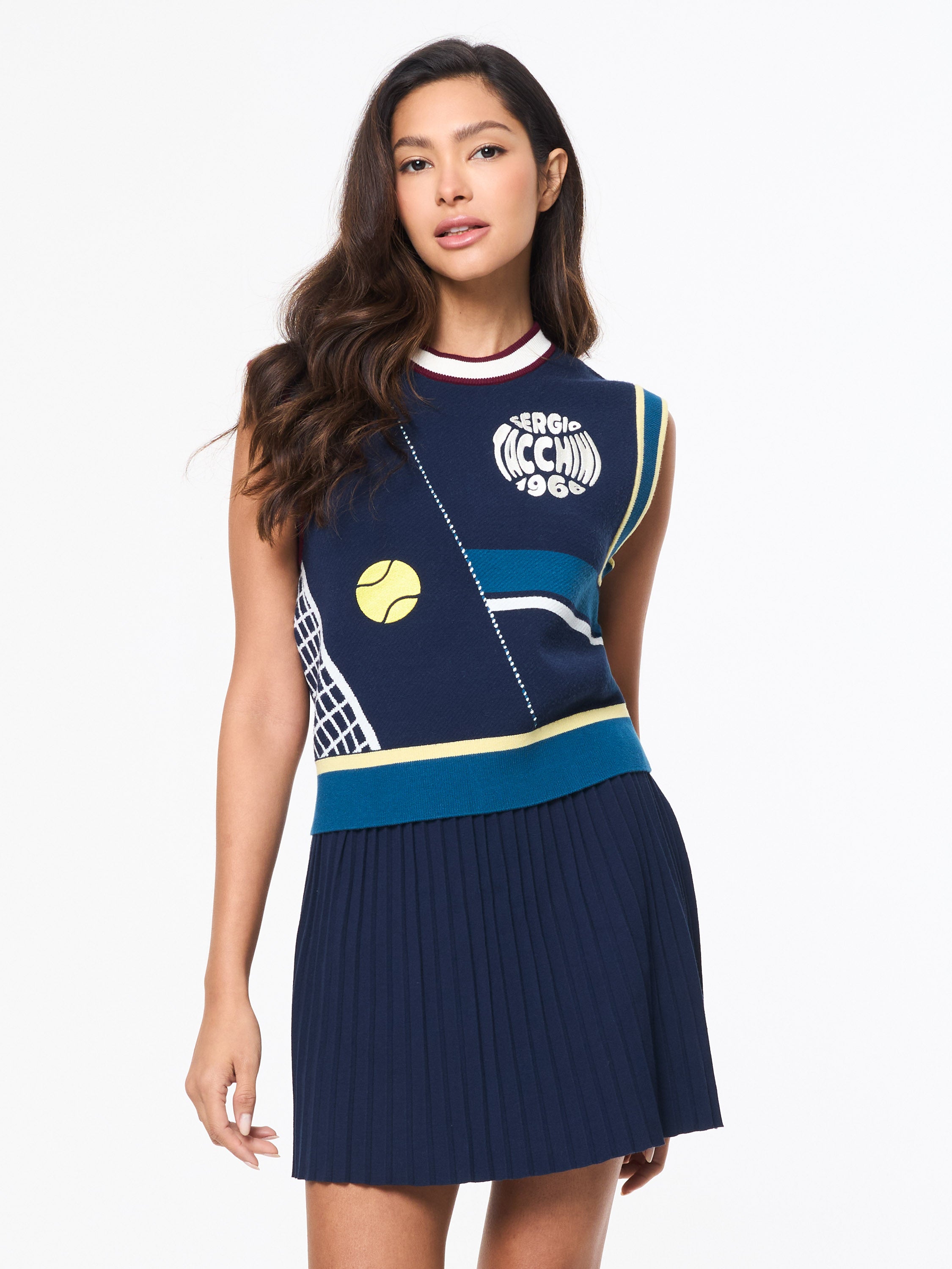 The Nota Knit Vest redefines casual luxury with a refined combination of comfort and craft. Spun from high-quality Athena yarn—an eco-conscious viscose blend prized for its breathability, moisture-wicking performance, and soft hand feel—this premium top is constructed using an artful birdseye-back knit that drapes effortlessly while maintaining structure. Finished with custom embroidered tennis artwork, stripe accents, and color-block hits, the Nota unites timeless sport with first-class sophistication.