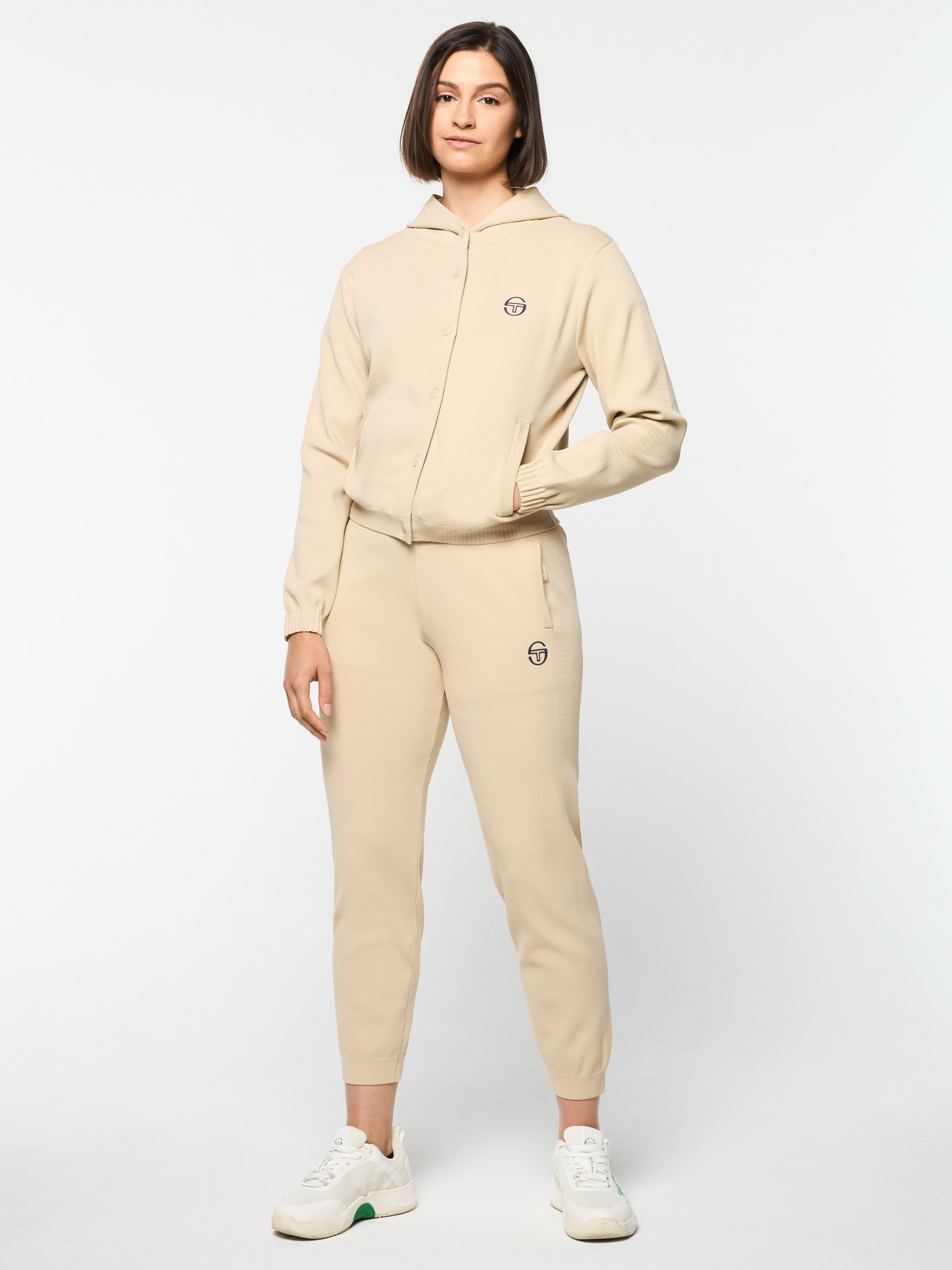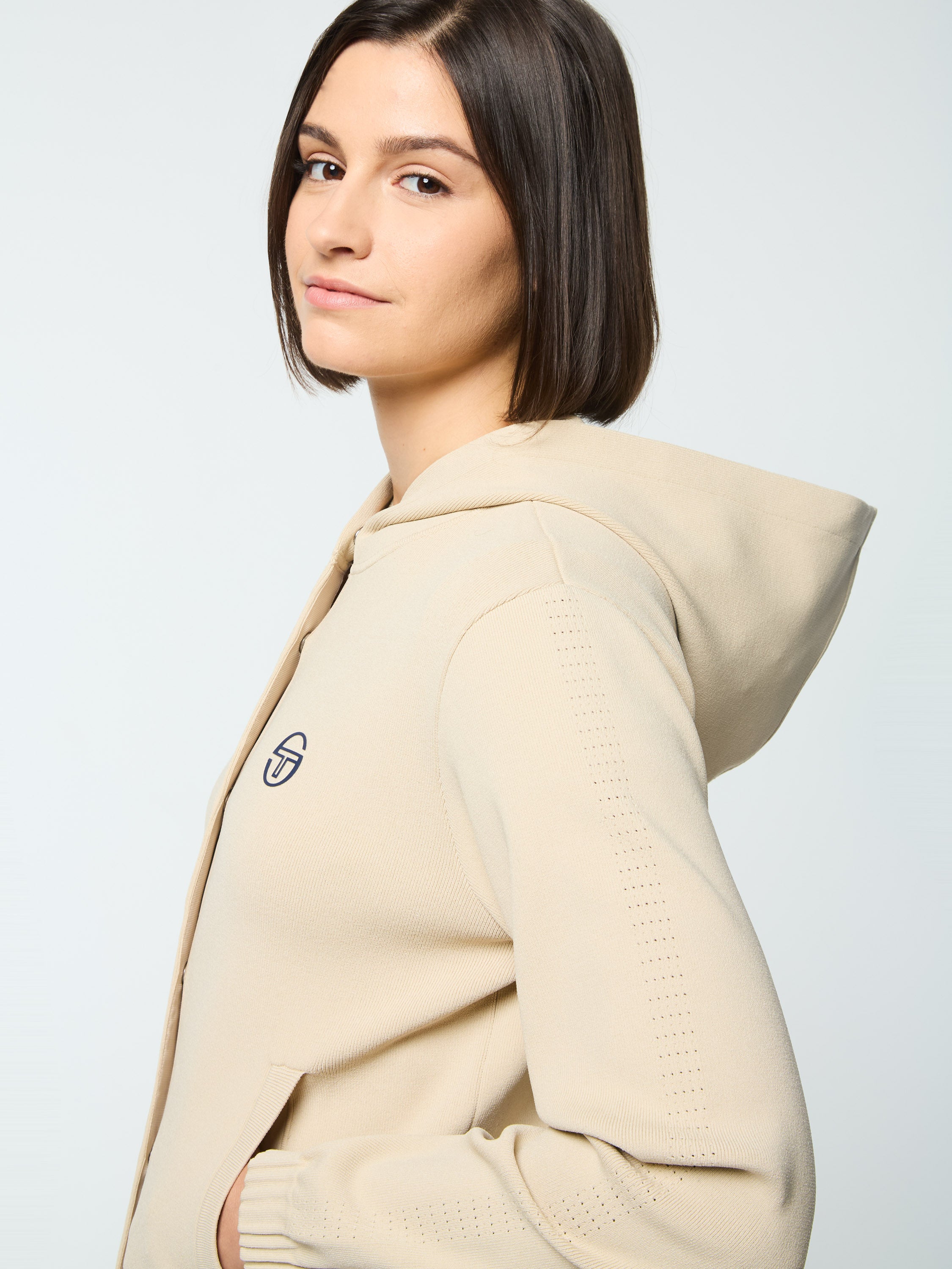 Your new favorite hoodie, the Rosolina is crafted from extremely soft rib-knit fabric with elegant pointelle detailing down the sleeves for an elevated vibe. Cut with a snap-button front for easy layering, this premium athleisure staple is complete with spacious handwarmer pockets and gathered cuffs for ultimate comfort.Pair with the Rosolina Track Pant for the full fit. (Sold separately)