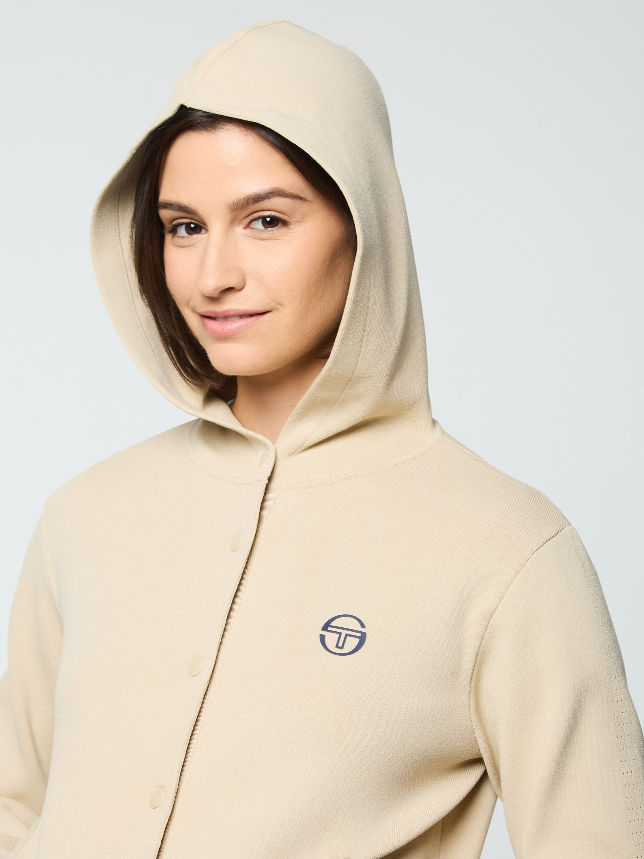 - Spacious hood with tubular seam detail and snap-button closure at throat