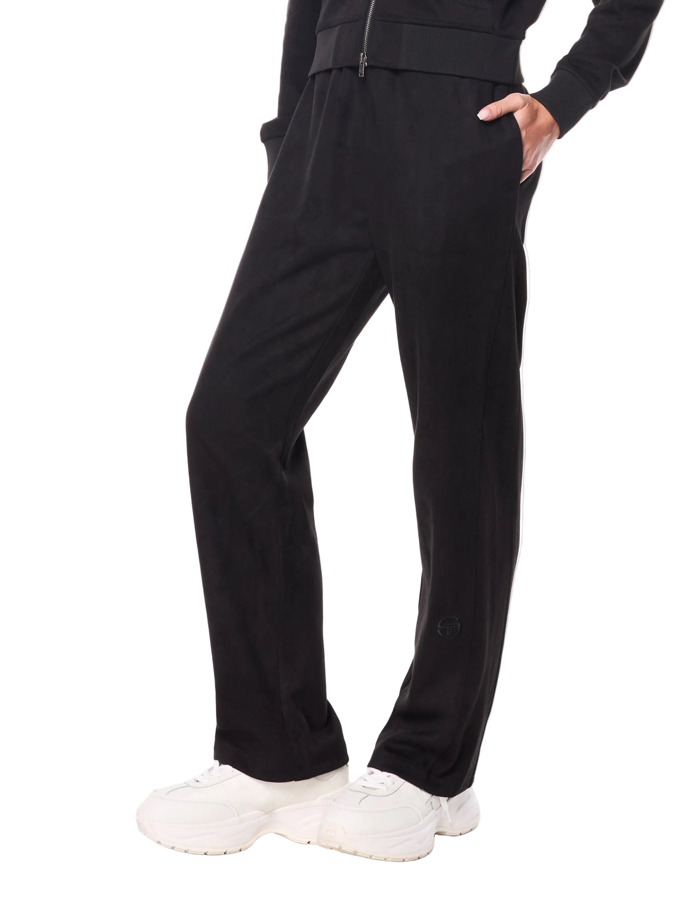 A premium take on the classic Track Pant, the Women's Camoscio Pant is crafted from faux suede for a luxurious feel. Topped with a comfortable rib-knit elastic waistband with hidden tipped drawcord, these elevated track pants are complete with a perforated double knit design with faux suede touch down the side legs, and our iconic 'ST' monogram logo embroidered at lower left leg.