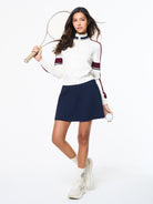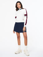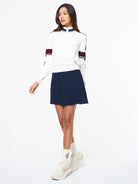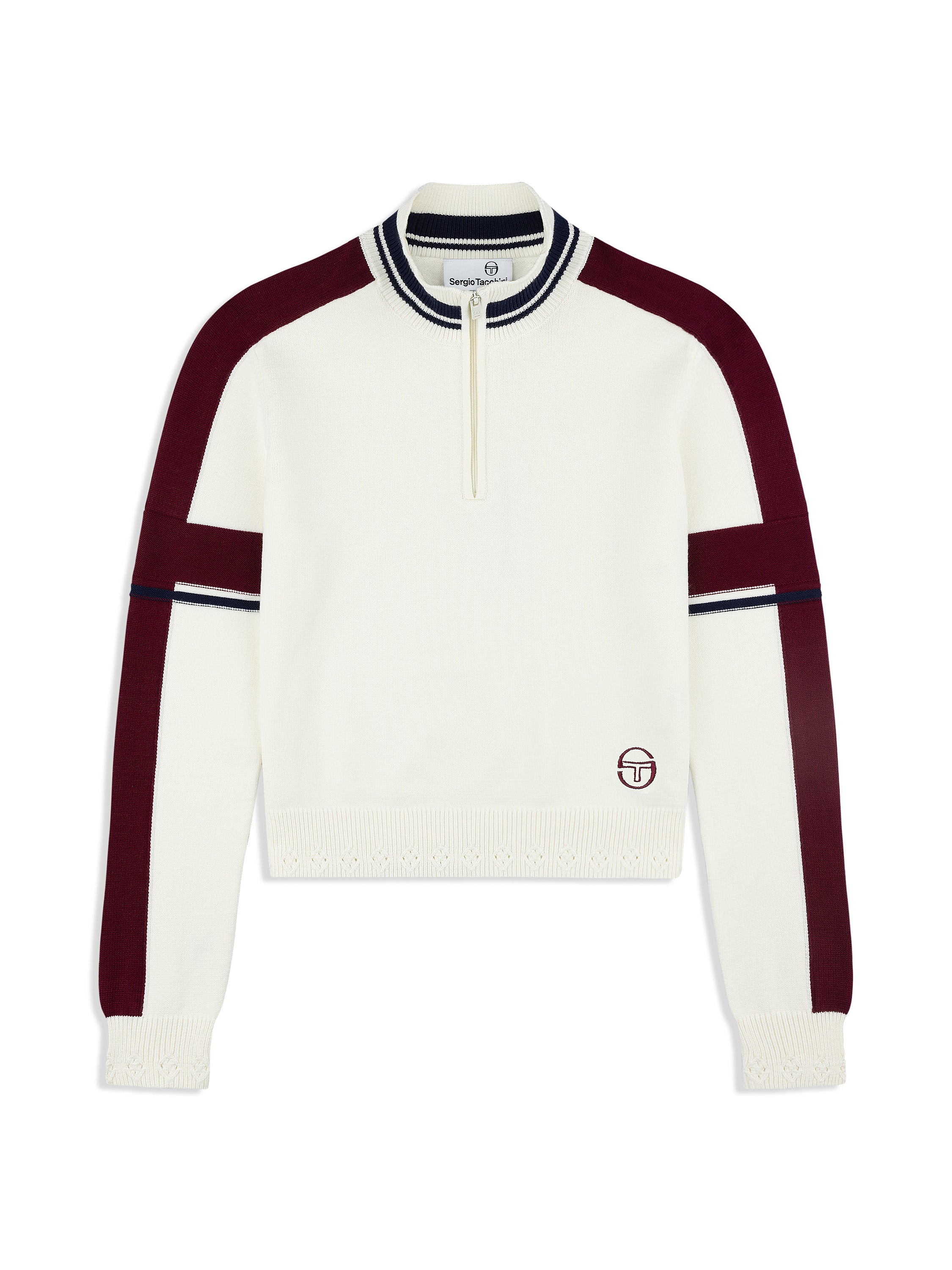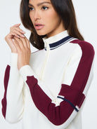 Our Nota Knit Quarter Zip redefines casual luxury with a refined combination of comfort and craft. Spun from high-quality Athena yarn—an eco-conscious viscose blend prized for its breathability, moisture-wicking performance, and soft hand feel—this premium pullover is knit with contrast color-blocking and stripe accents at the sleeves. Finished with artful pointelle detailing at the rib-knit cuffs and hem, this fit unites timeless sport with first-class sophistication.