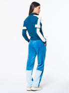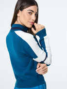 - Contrast color-blocked panel, band, and stripe at sleeves