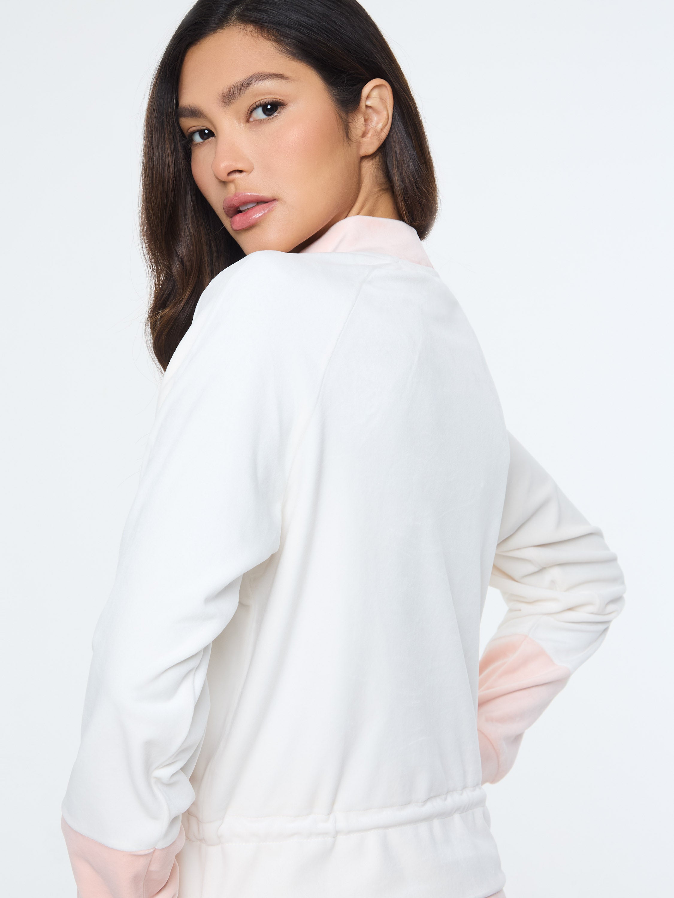 Elevated everyday easy—the Lina Velour Top is a modern staple that blends luxe texture with a sporty edge. Designed in plush stretch velour with bold color-blocking, this long-sleeve top flatters with raglan sleeves and a sleek mock neck collar. An adjustable drawcord cinch at the waist lets you customize the fit—wear it relaxed for laid-back ease or tightened for a cropped, curve-enhancing shape.