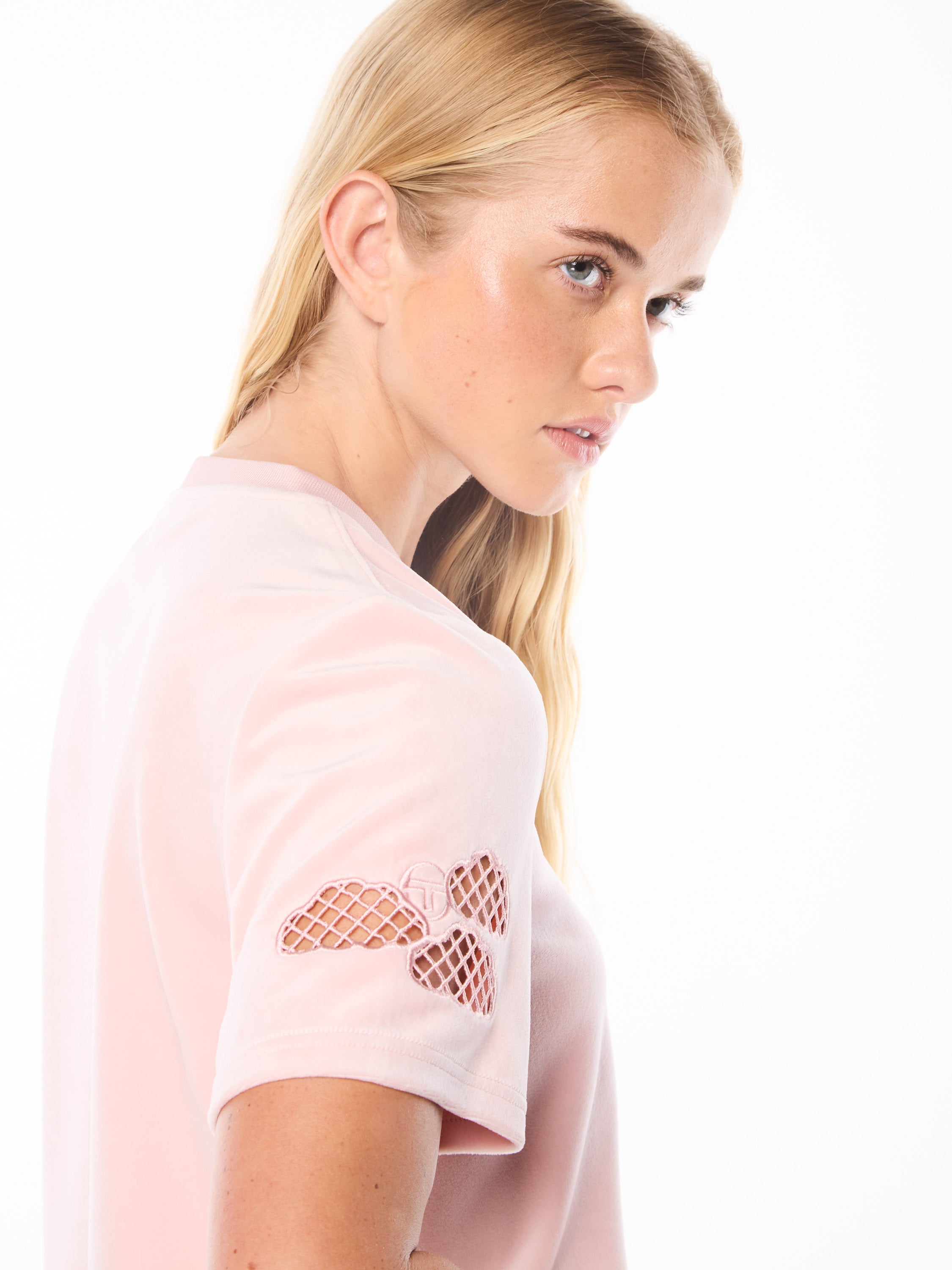 As part of our Air Travel capsule and Sergio Tacchini special 60th Anniversary edition the Nuvola velour cropped t-shirt is designed with our signature premium velour, it ensures comfort that stays with you wherever you go, a relaxed fit and modern cropped length, this tee is made for effortless everyday styling. Elevated with embroidery details on the angles and design elements that nod to the tennis court net, it blends luxury, sport, and timeless styles, a true celebration of Sergio Tacchini's legacy.