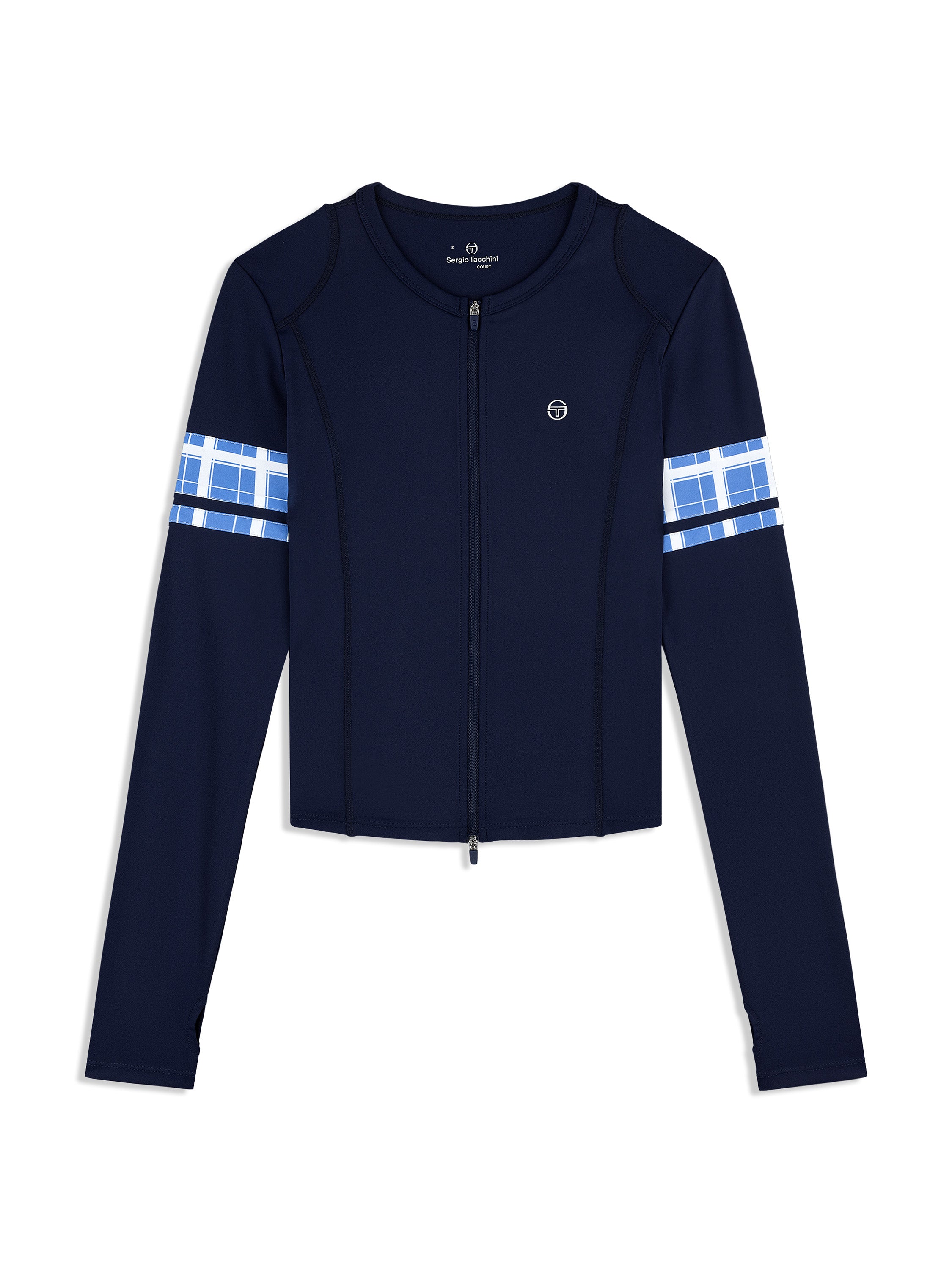 Sleek, sculpted, and built for performance, the Lara Contour Jacket combines athletic function with contemporary style. Crafted from court stretch fabric with moisture-wicking properties, this fitted jacket features princess seams for a flattering silhouette, while custom Damarindo check panels at the sleeves nod to Sergio Tacchini's heritage. Finished with handy thumbholes for added coverage and a 2-way zipper for versatile styling, it's the perfect layer for warming up, cooling down, or making a statement off the court.