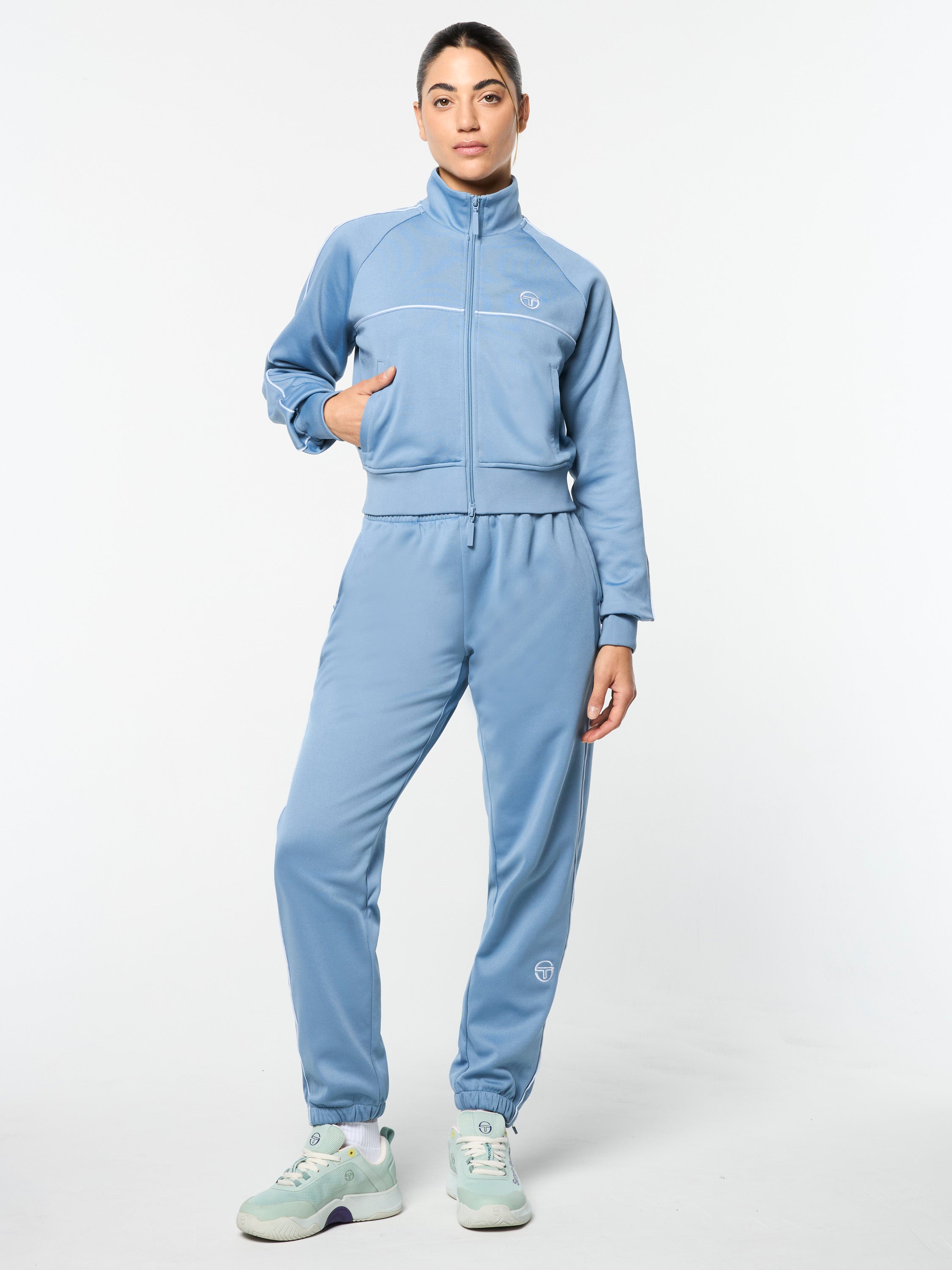 An elevated spin on classic athleisure, our Miss Lioni Track Jacket is crafted from soft double-face knit fabric that's comfortable, durable, and perfect for everyday wear. Featuring an embroidered 'ST' monogram logo at the left chest, this top-notch track jacket is complete with contrast piping details, tipping stripes inside the rib-knit collar, and zip-secured pockets.Pair with the Miss Lioni Track Pant for the full fit. (Sold separately)