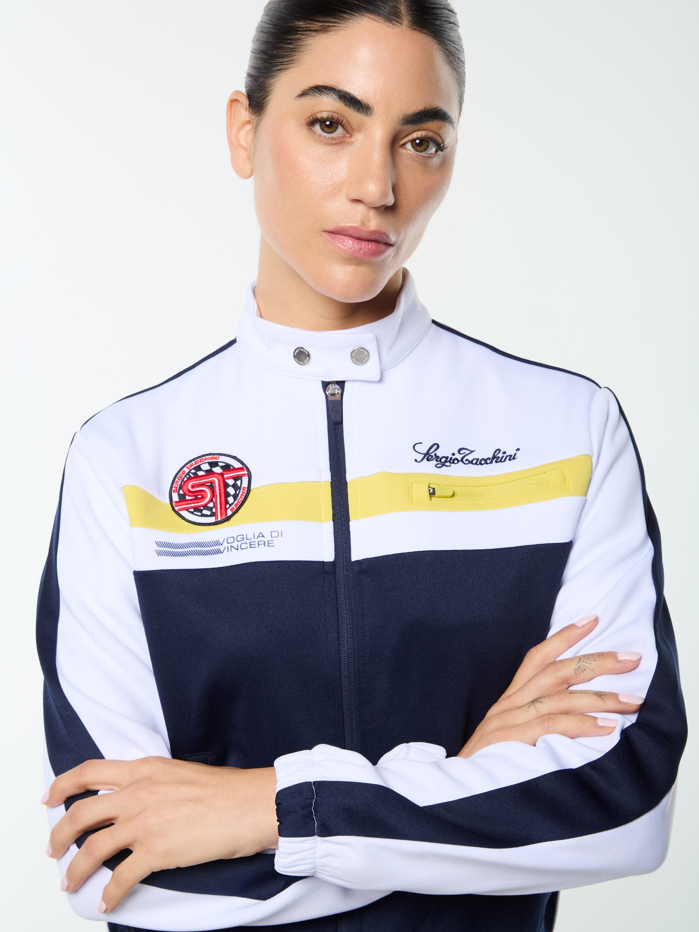 Where sport meets statement. Our Women's Corsa Track Jacket takes cues from vintage racing kits—revved up with modern edge. Crafted from soft yet structured double-face knit fabric, this premium track jacket features bold color-block paneling, a sleek snap-button stand collar, and a custom racing-inspired ST monogram "Corsa" patch.