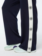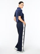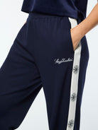 Set sail in our Women's Bussola Track Pant, crafted from a luxurious Tencel blend piqué fabric that's soft and breathable with a subtle stretch—perfect for active individuals and athleisure-wear enthusiasts alike. Featuring a nautical "Compass" rose repeat motif across contrast taping down the legs, these refined track pants offer style and comfort with a Riviera vibe.Pair with the Women's Bussola Track Jacket for the full fit. (Sold separately)