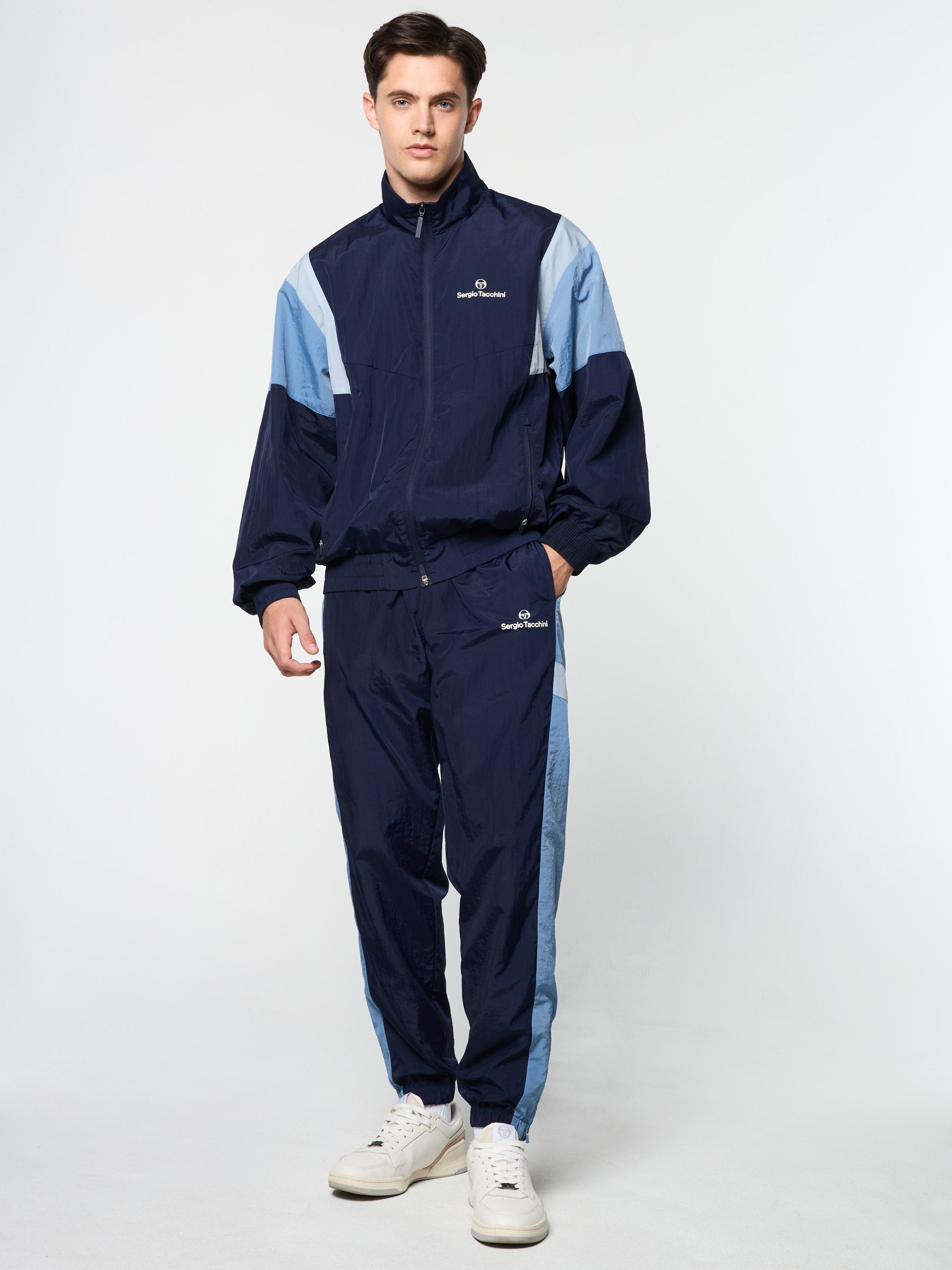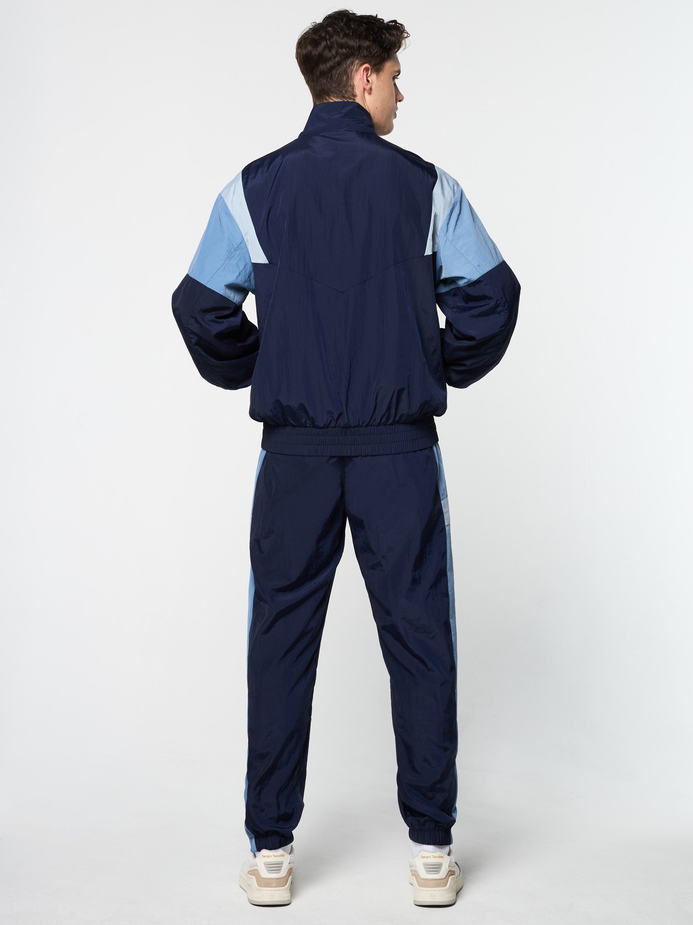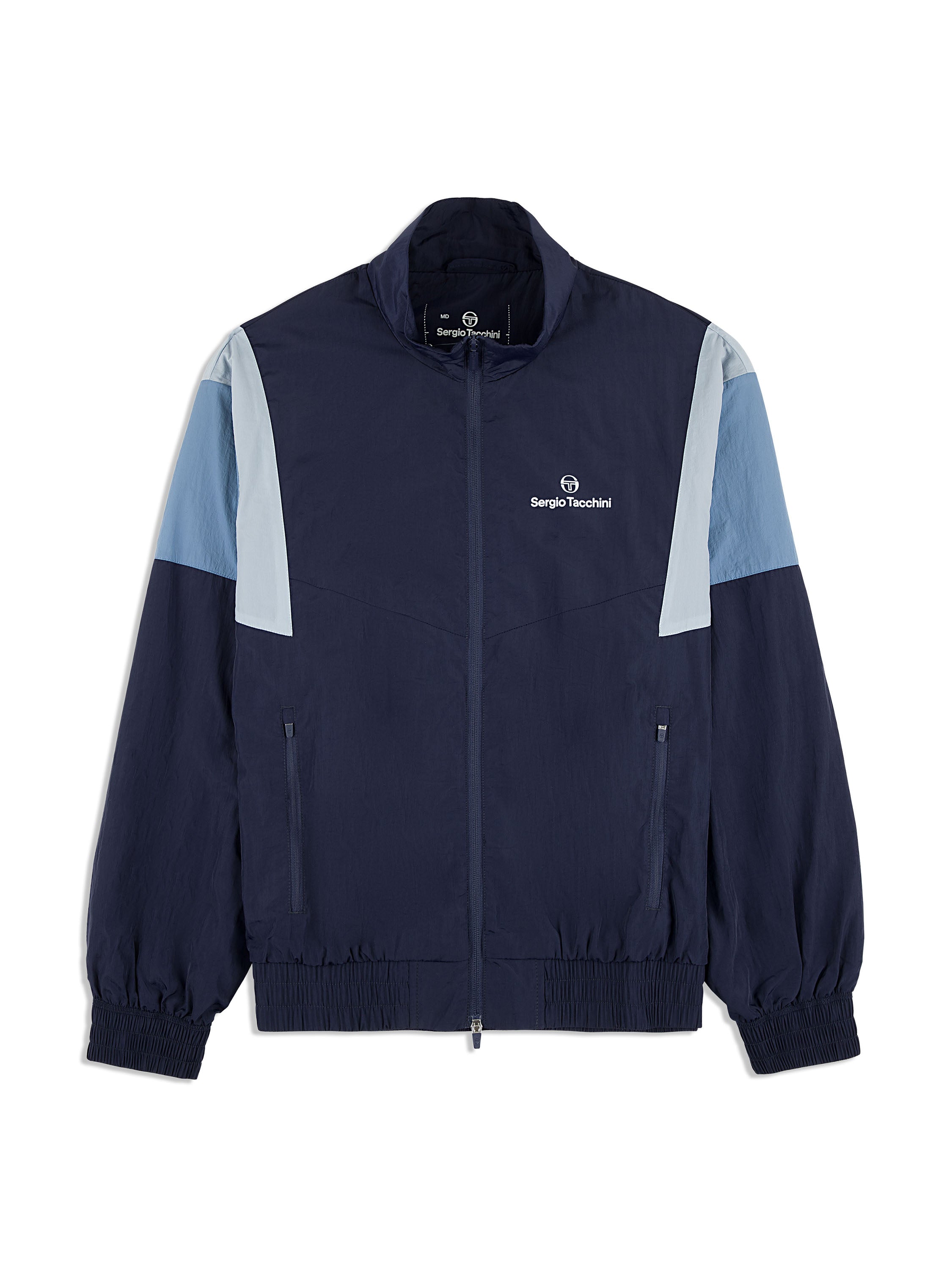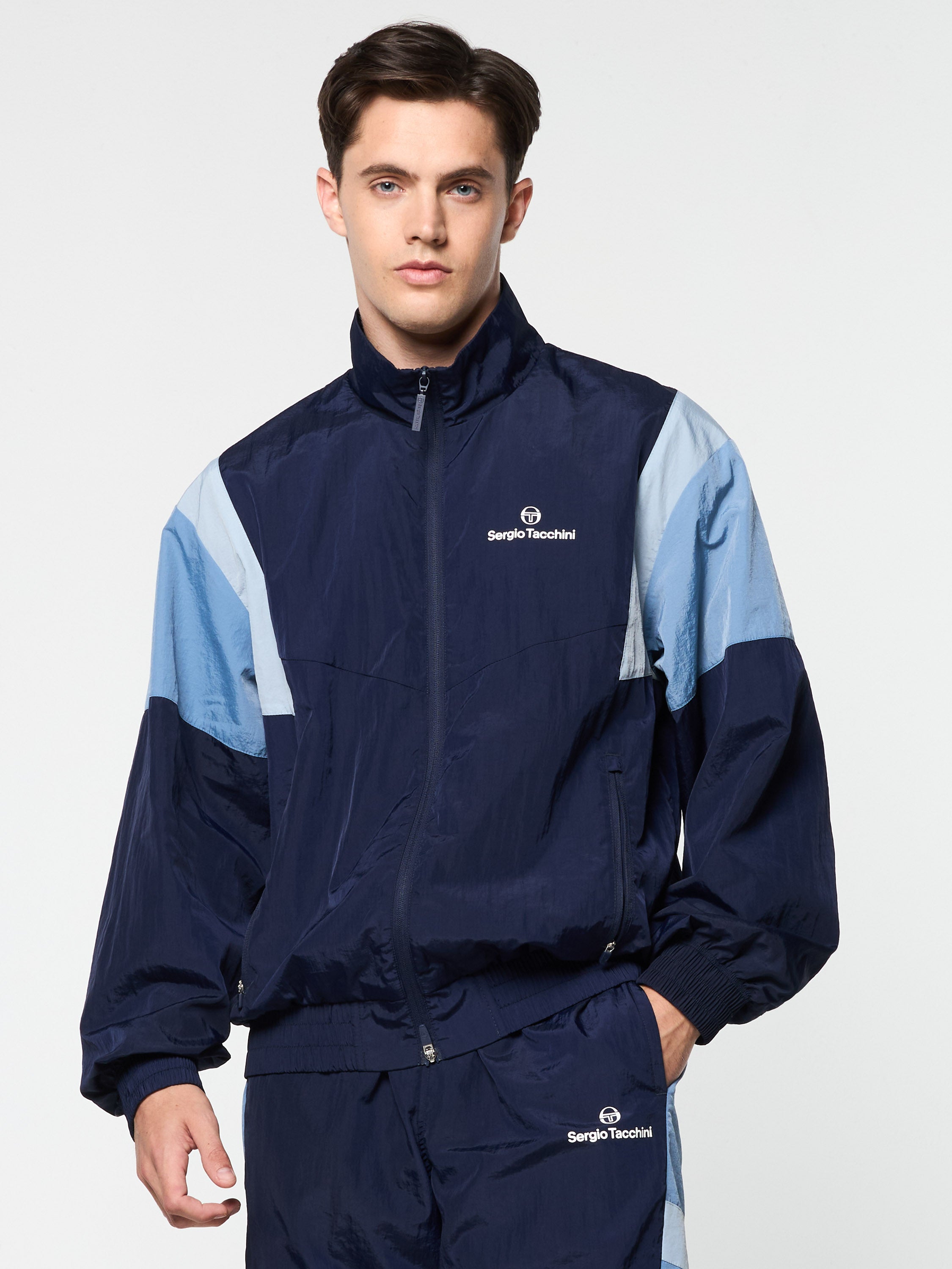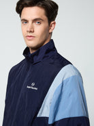 The Angolo Track Jacket is made of our signature crinkle nylon in a color-blocked silhouette with chevron seam detailing for a retro vibe. Perfect for a workout or a night out on the town, this lightweight full-zip track jacket is complete with zip-secured pockets, elastic trims, and a Sergio Tacchini logo at the left chest.