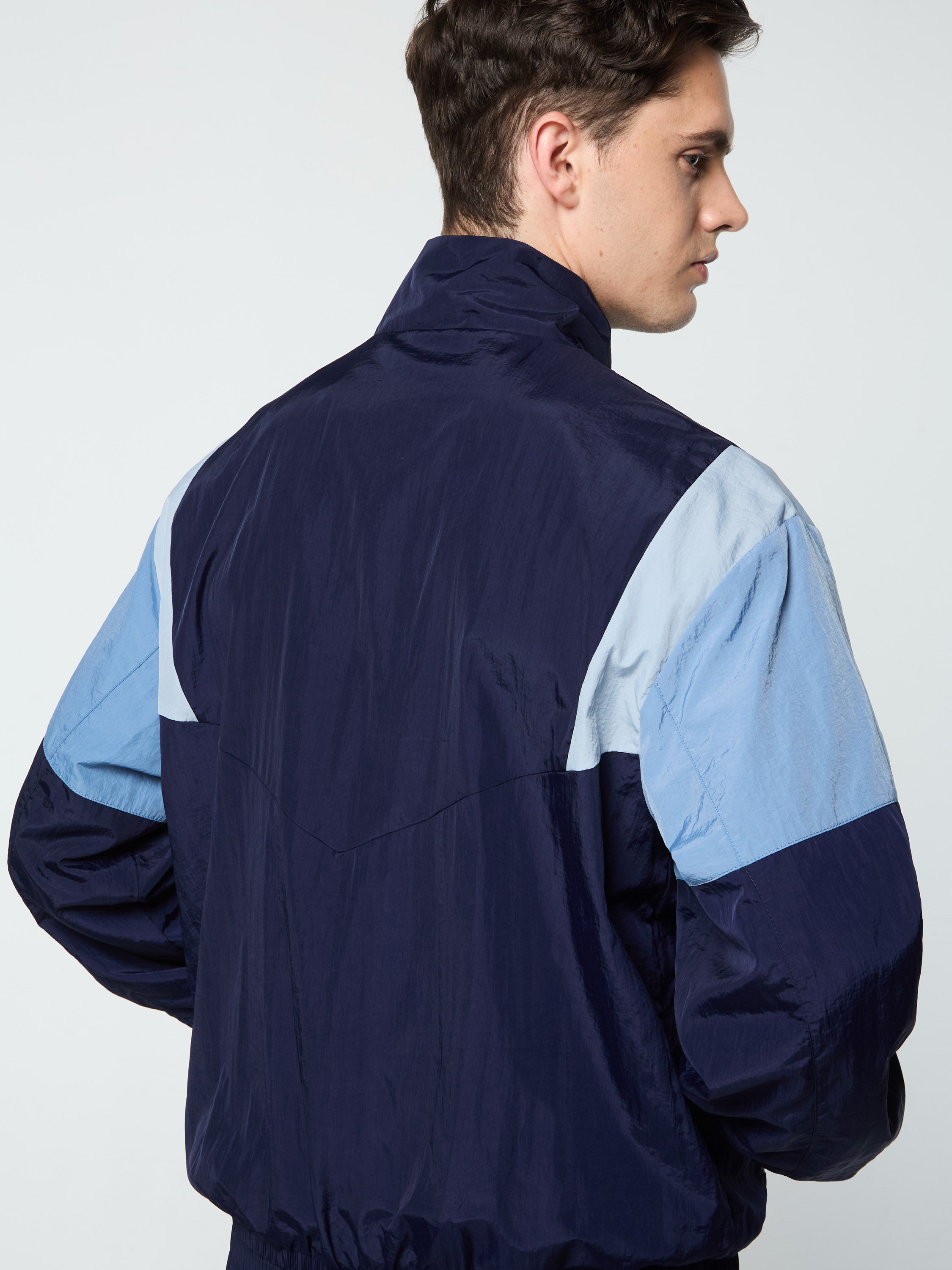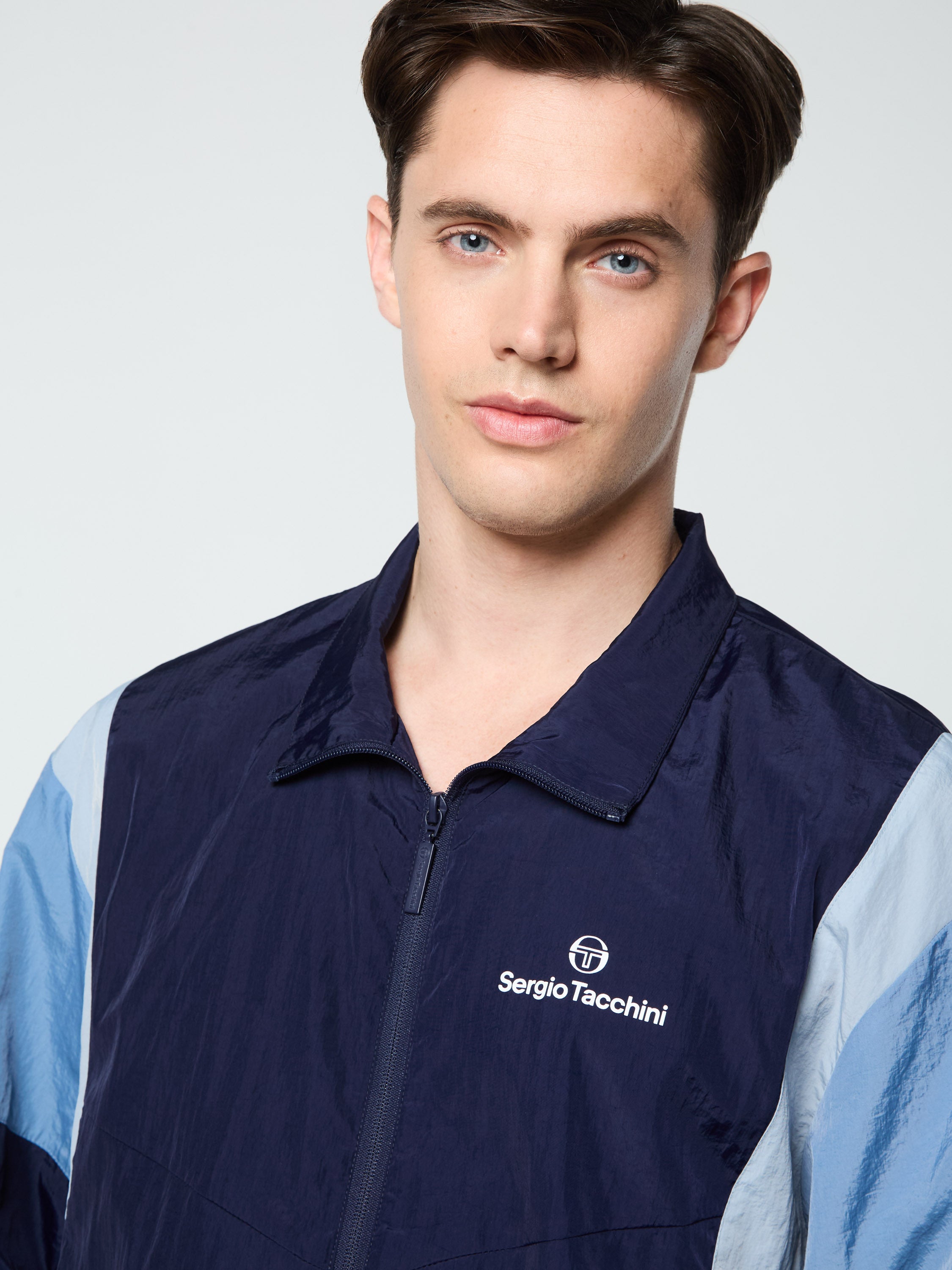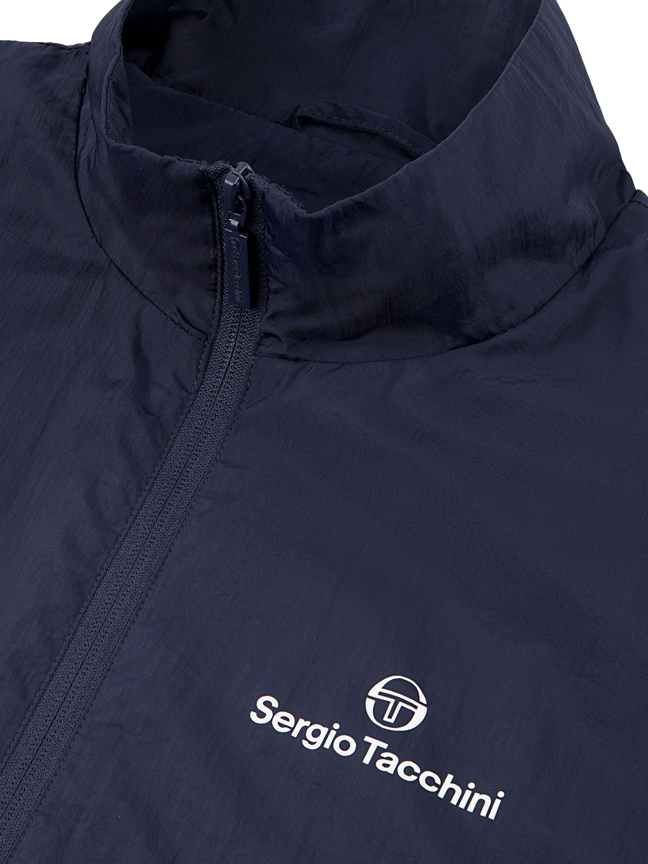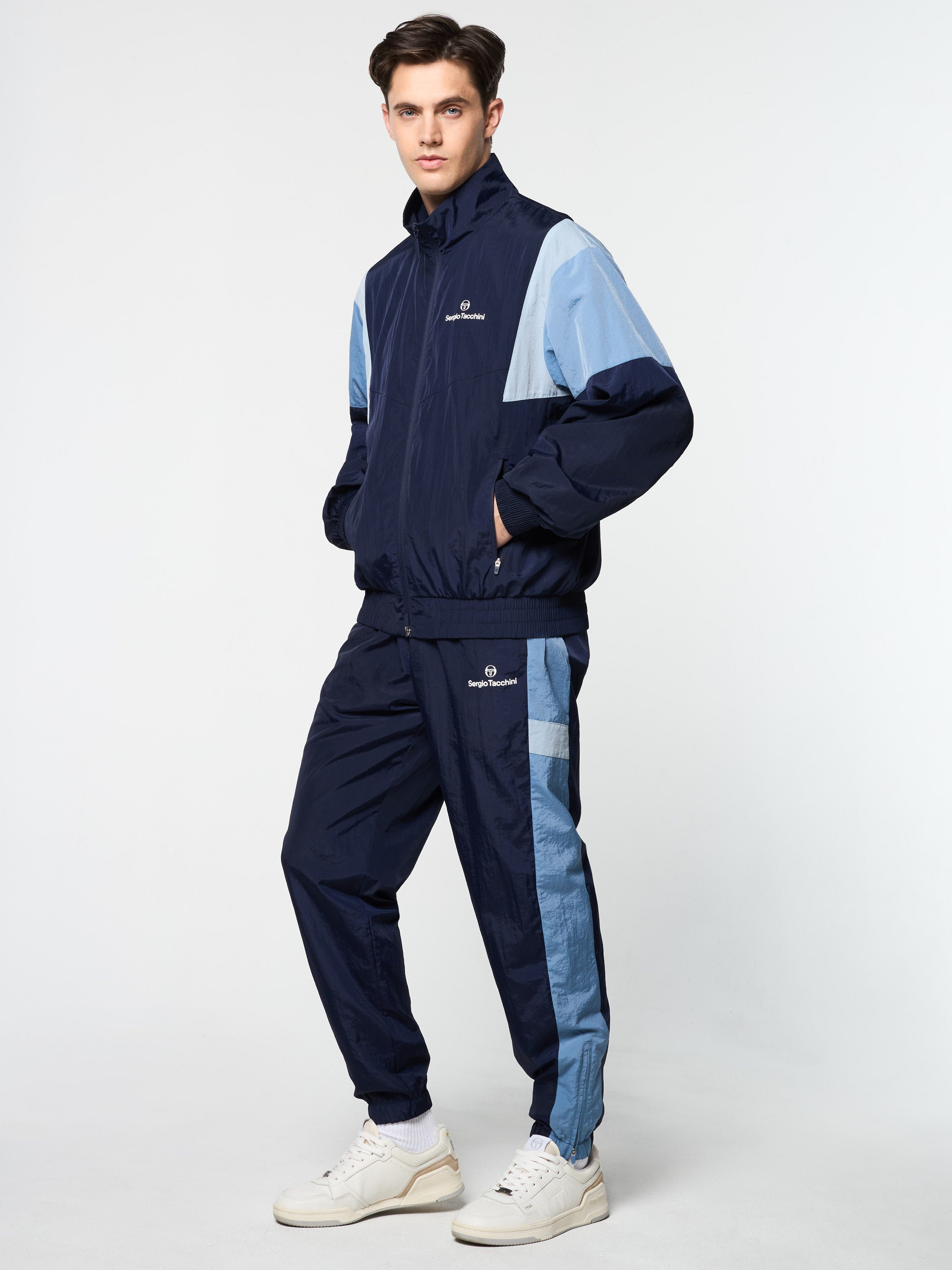 The Angolo Track Jacket is made of our signature crinkle nylon in a color-blocked silhouette with chevron seam detailing for a retro vibe. Perfect for a workout or a night out on the town, this lightweight full-zip track jacket is complete with zip-secured pockets, elastic trims, and a Sergio Tacchini logo at the left chest.