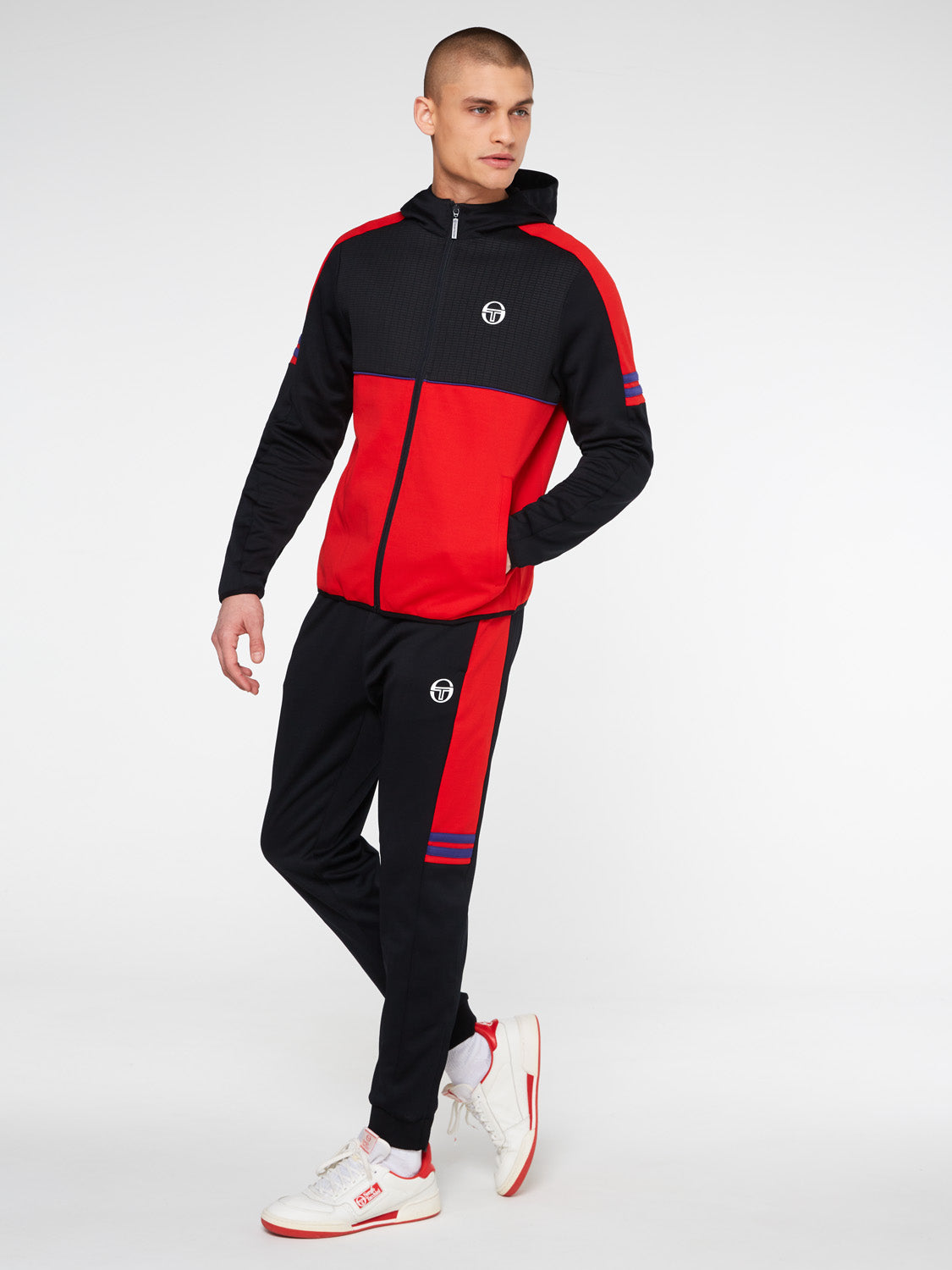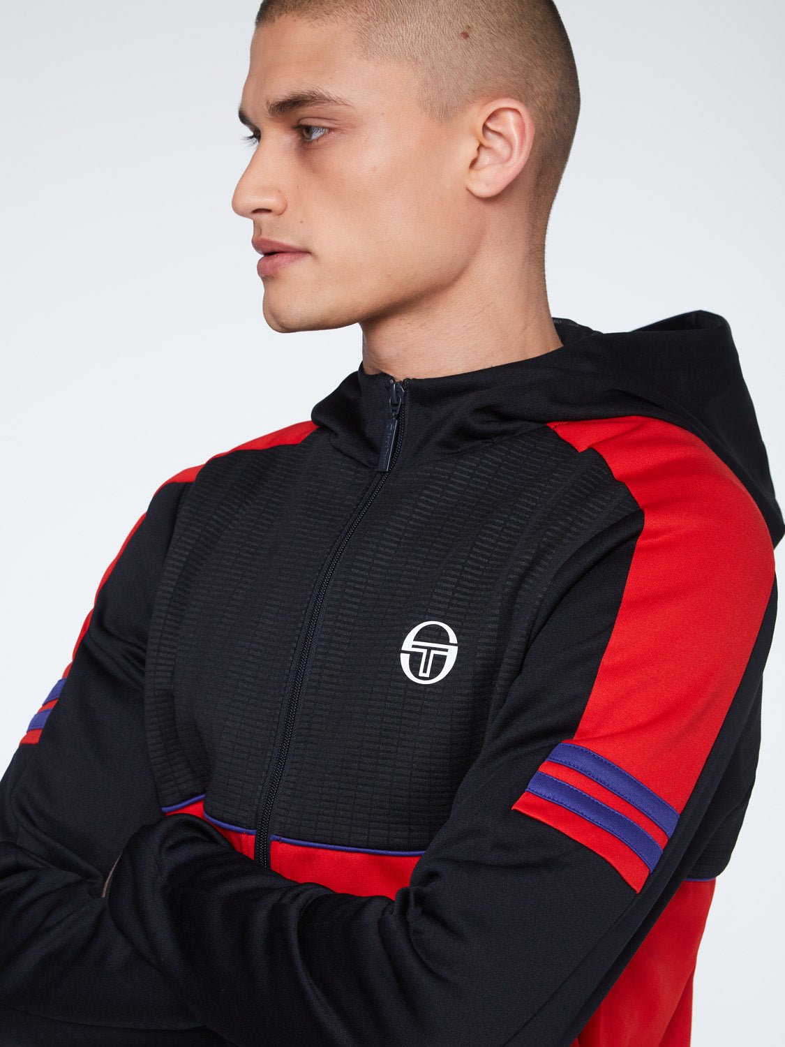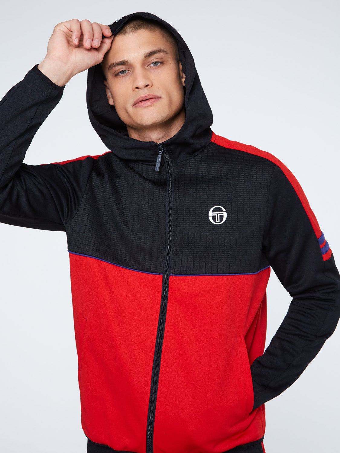 The Beal Track Jacket is made of performance poly-cotton in a color-blocked silhouette and features textured detailing at the upper panels for a contemporary look. Topped with a three-piece hood, the jacket is complete with a protective stand-up collar, cross-body piping, contrast striping at the sleeves, and our iconic 'ST' monogram logo at the left chest.