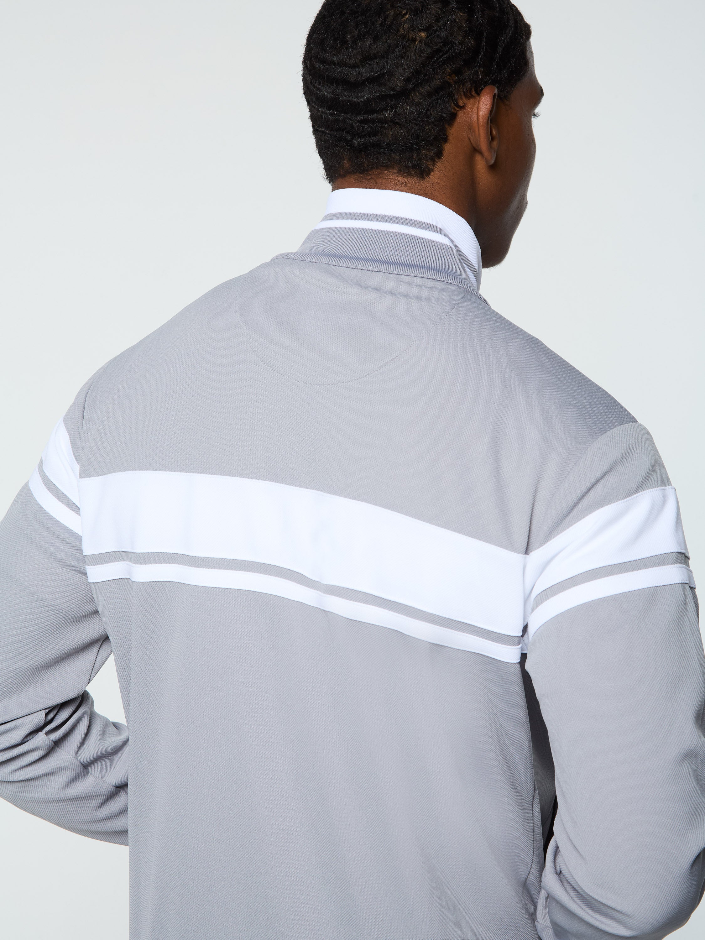 - Rib-knit stand-up collar with yarn-dyed double stripe tipping