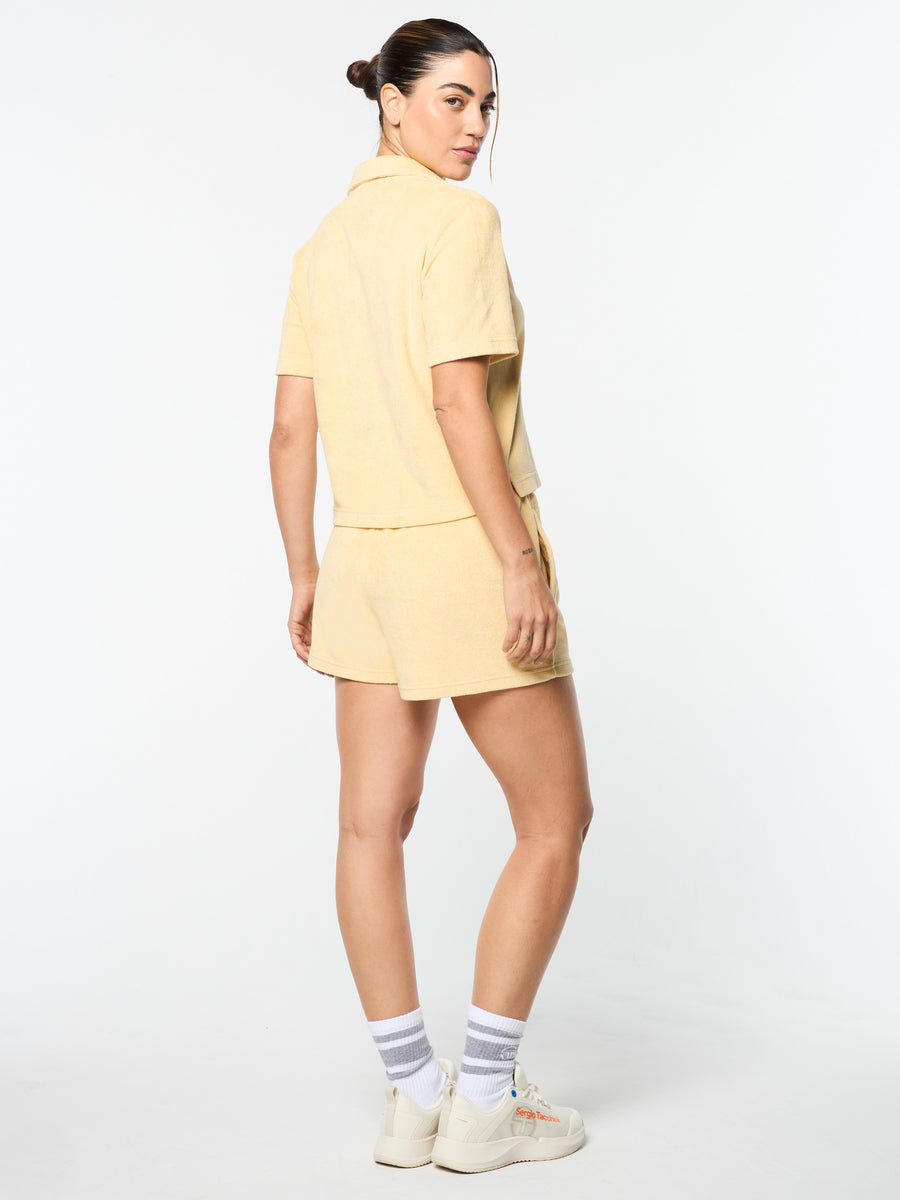 Perfect for summer beach trips, light sports activities, or city strolls. The Edda Cropped Shirt is crafted from super soft terry toweling fabric with chic tie front closures for a casual look. Topped with a relaxed camp collar, this cropped cabana shirt takes loungewear to the next level.Pair with the Edda Short for the full fit. (Sold separately)